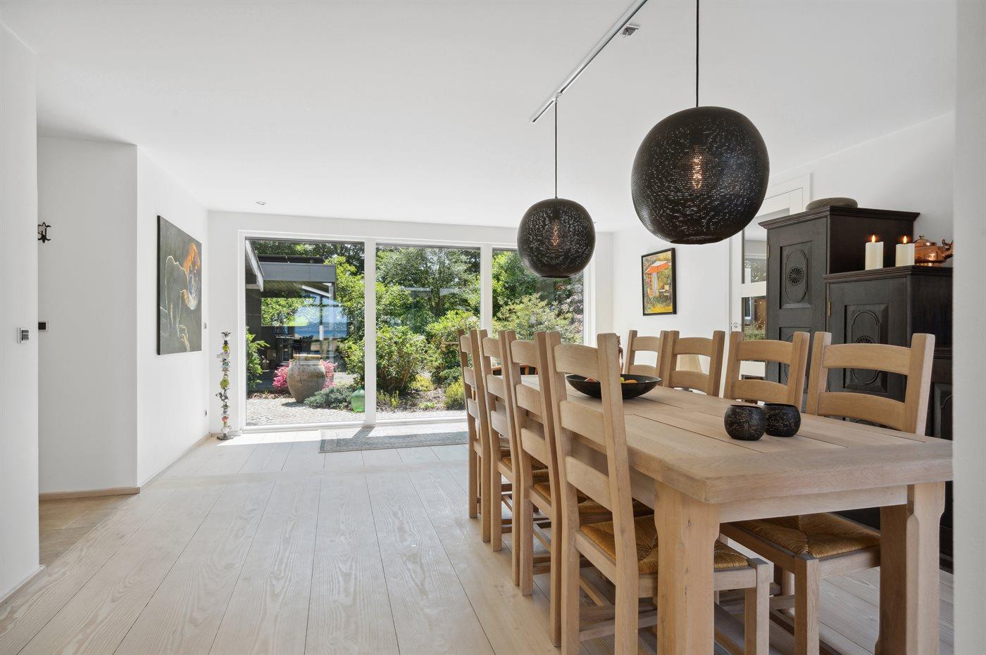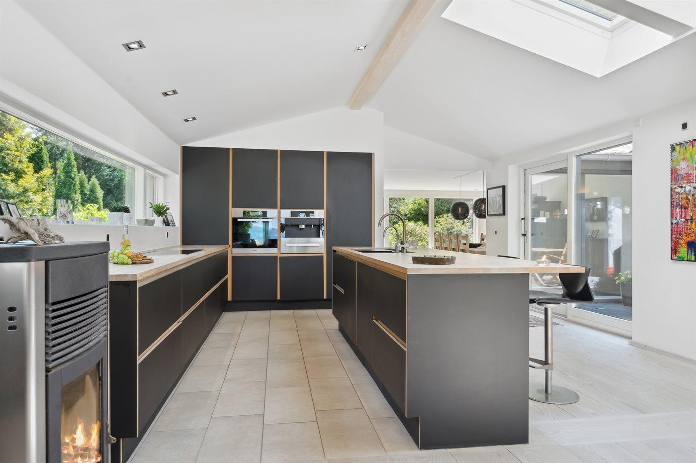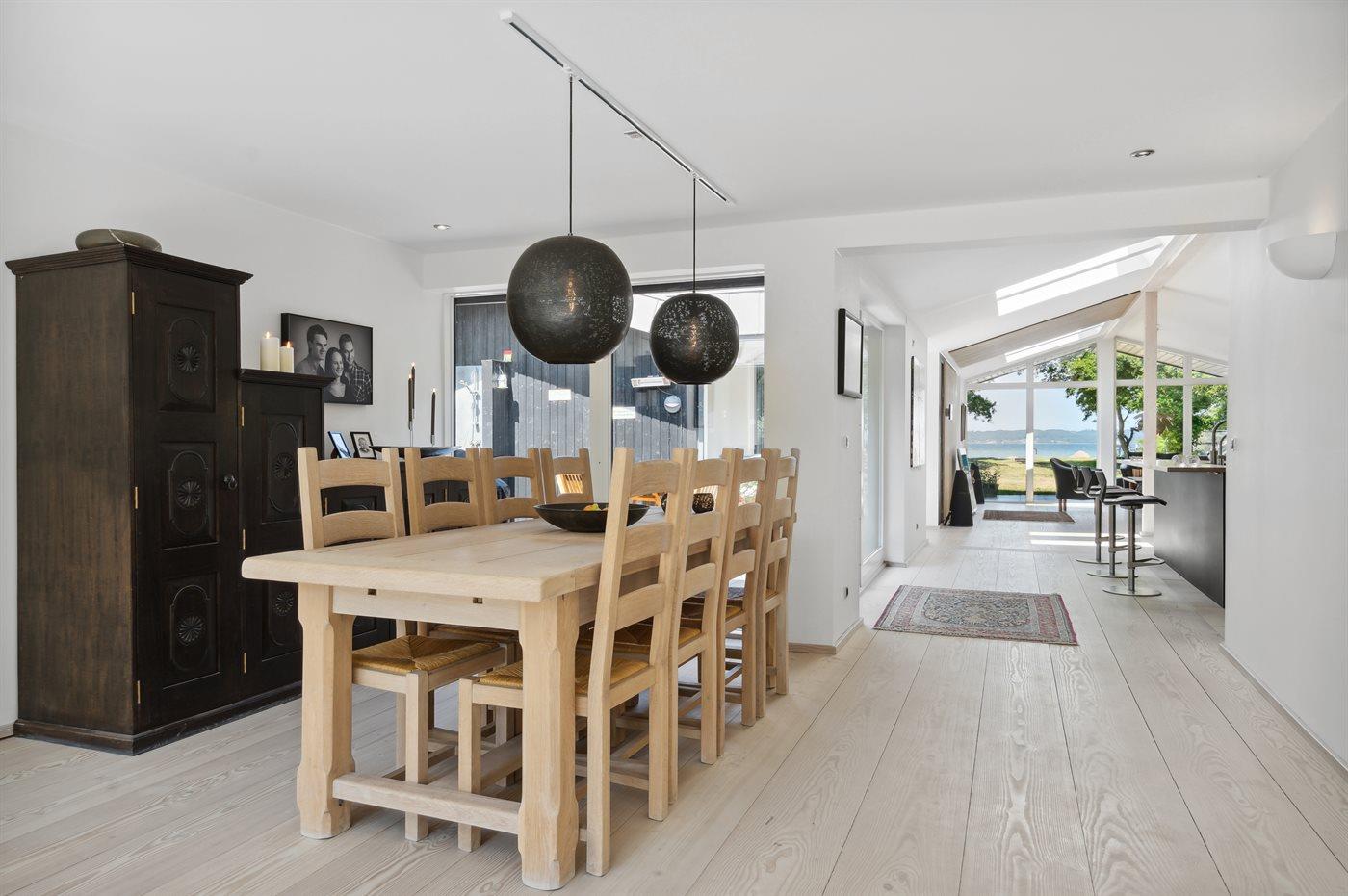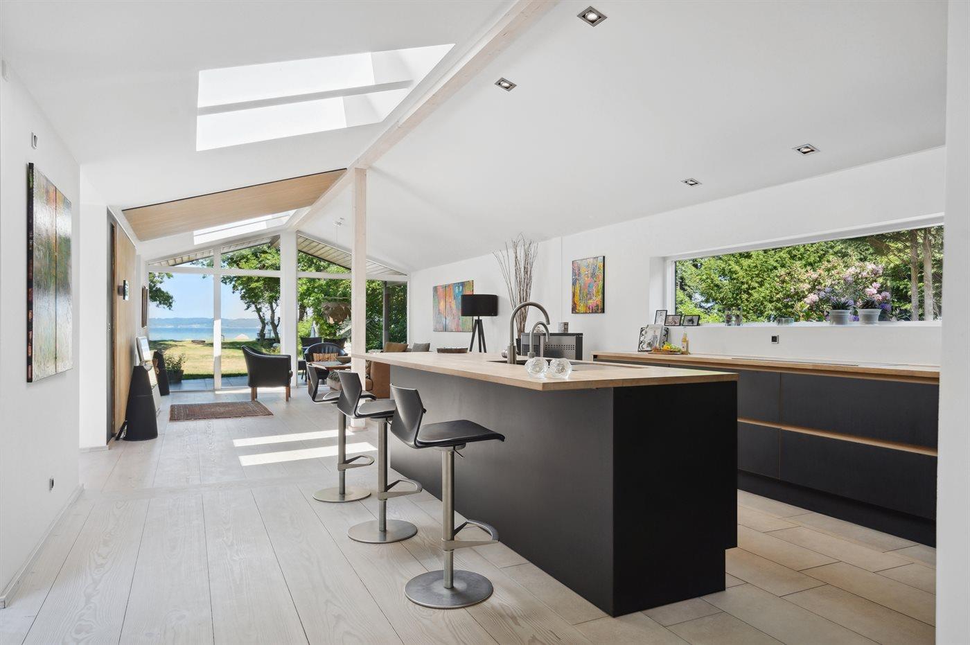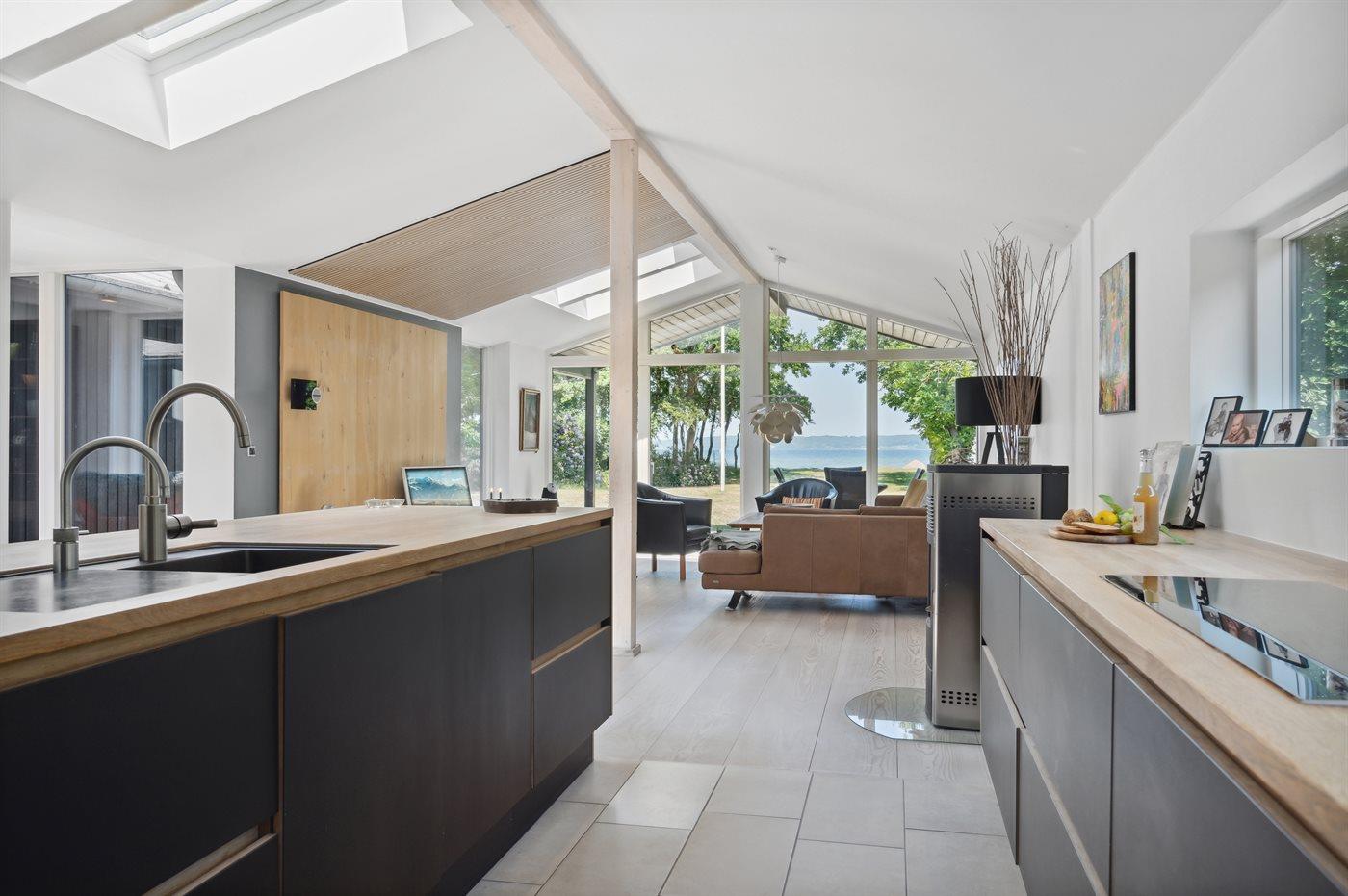 Ligesom beliggenheden er sommerhuset også noget ganske særligt - den unikke udsigt går igen fra de fleste rum - lige fra det smukke og store køkken/alrum, hvor stuen kommer i forlængelse af og med et stort glasparti rettet imod fjorden, til det smukke soveværelse, hvor udsigten igen er unik. Sommerhuset er løbende vedligeholdt og fremstår i utrolig god stand. Fra den store terrasse kan der bruges timevis på at nyde disse helt særlige omgivelser og tag en spadseretur på ca. 30 meter henover græsplænen og man står igen i vandkanten. Her findes flere fantastiske terrasse på nærmest alle sider af huset, så der altid er mulighed for at nyde solen og sidde fuldstændig ugeneret. Terrassen på venstre side af huset findes der tilmed en stor jacuzzi, som hele familien kan sidde i eller blot forældre, der ønsker at nyde et glas vin på dette helt unikke sted for bagefter at tage en tur under den udendørs bruser eller tage en svømmetur i fjorden.