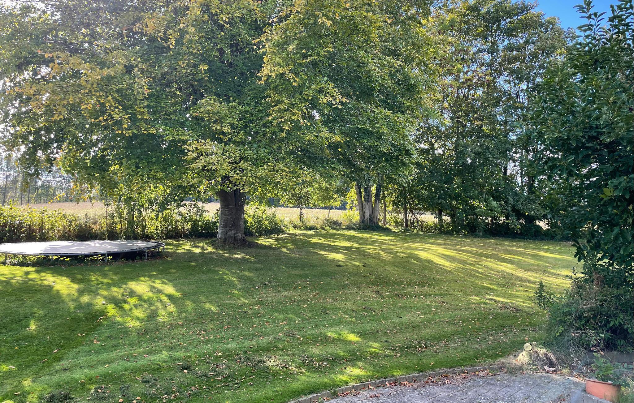 Udenfor indbyder den store have med gamle træer og solrige hjørner til afslapning. På terrassen kan I nyde morgenmaden i ro og mag eller tænde op i grillen om aftenen og lade dagen runde af i afslappet samvær. Børnene har masser af plads til at lege og boltre sig i det grønne. Når solen langsomt går ned, breder der sig en vidunderlig fredfyldt stemning mellem træer og enge.