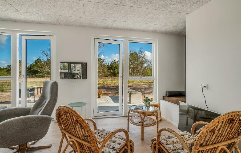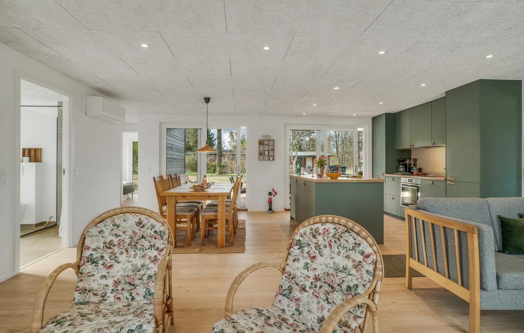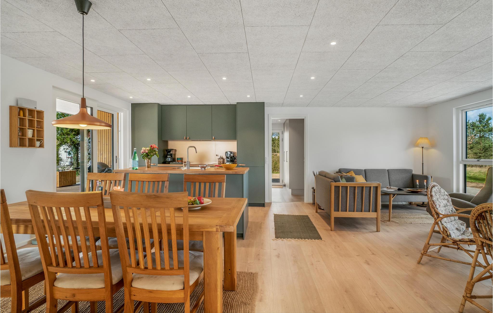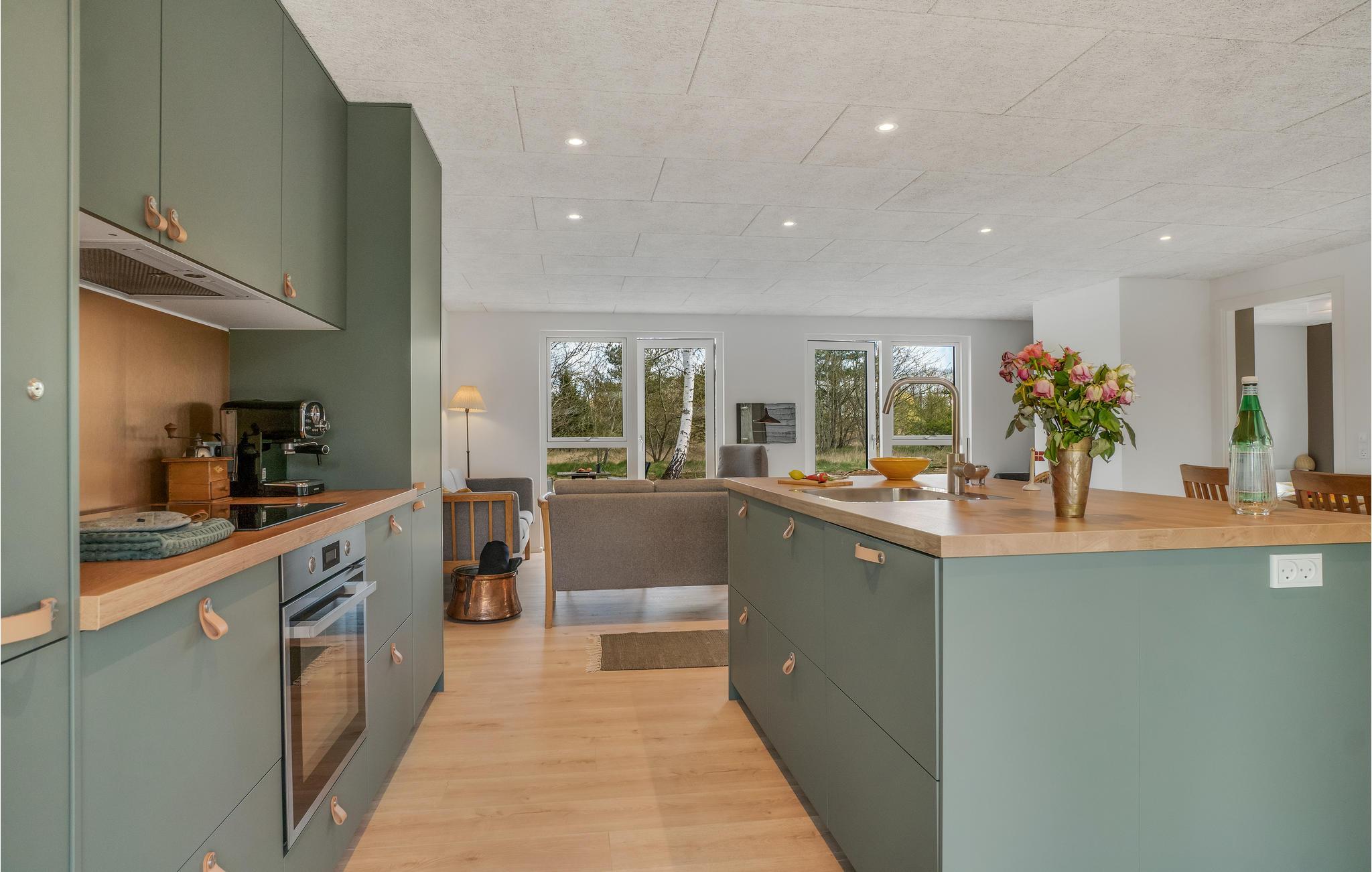 Velkommen til dette luksushus nær skoven! Et særdeles godt udgangspunkt for en ferie med aktiviteter i naturen. I de lyse rum med hjemlig indretning og flere hyggekroge venter ægte nærvær. Mens I hygger i sofahjørnet med plads til den store familie, laver mad sammen i det moderne olivengrønne køkken og spiser ved det lange massive træbord, kan I nyde en vidunderlig udsigt over naturen.