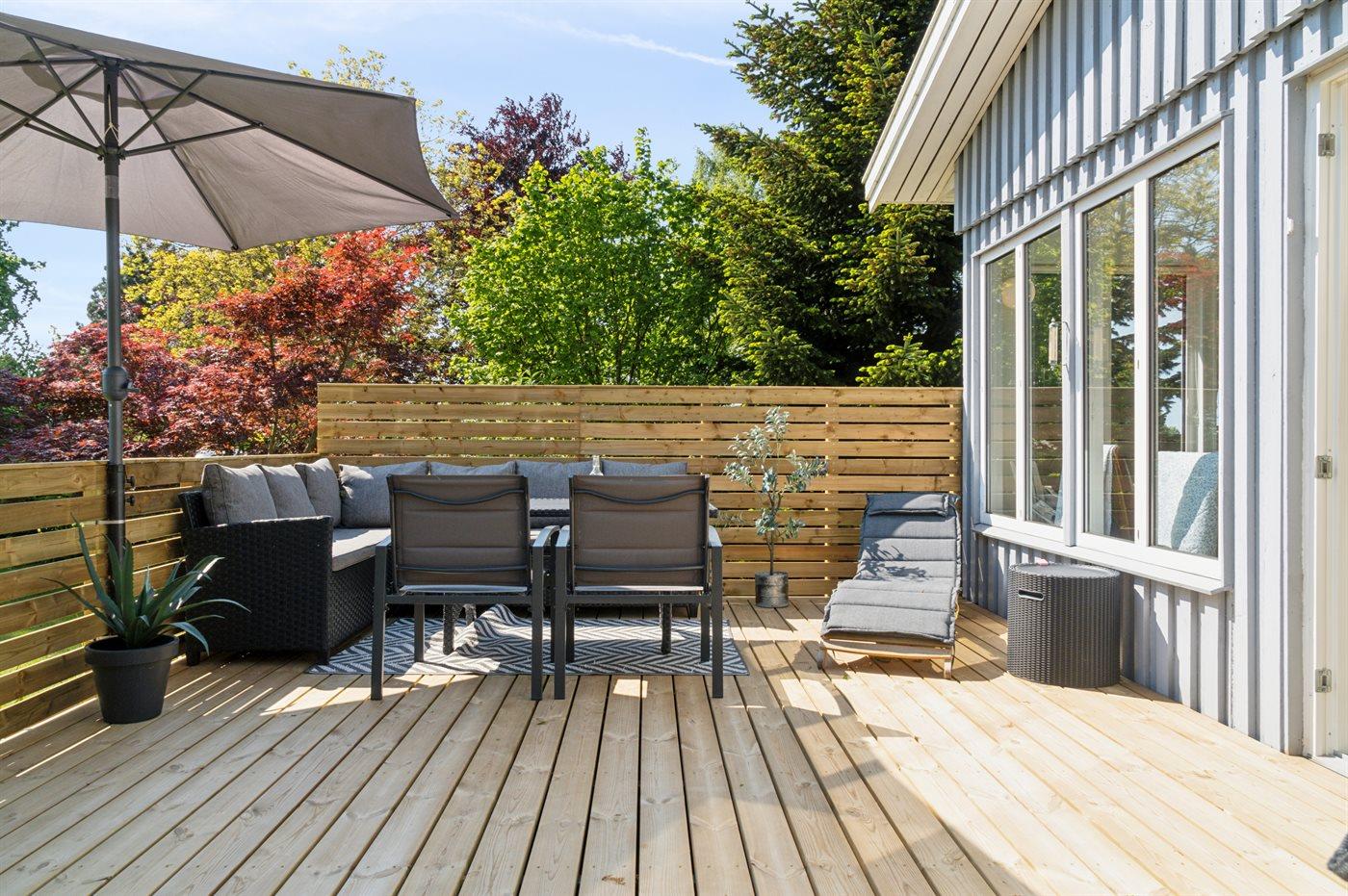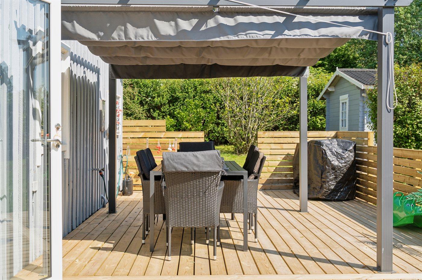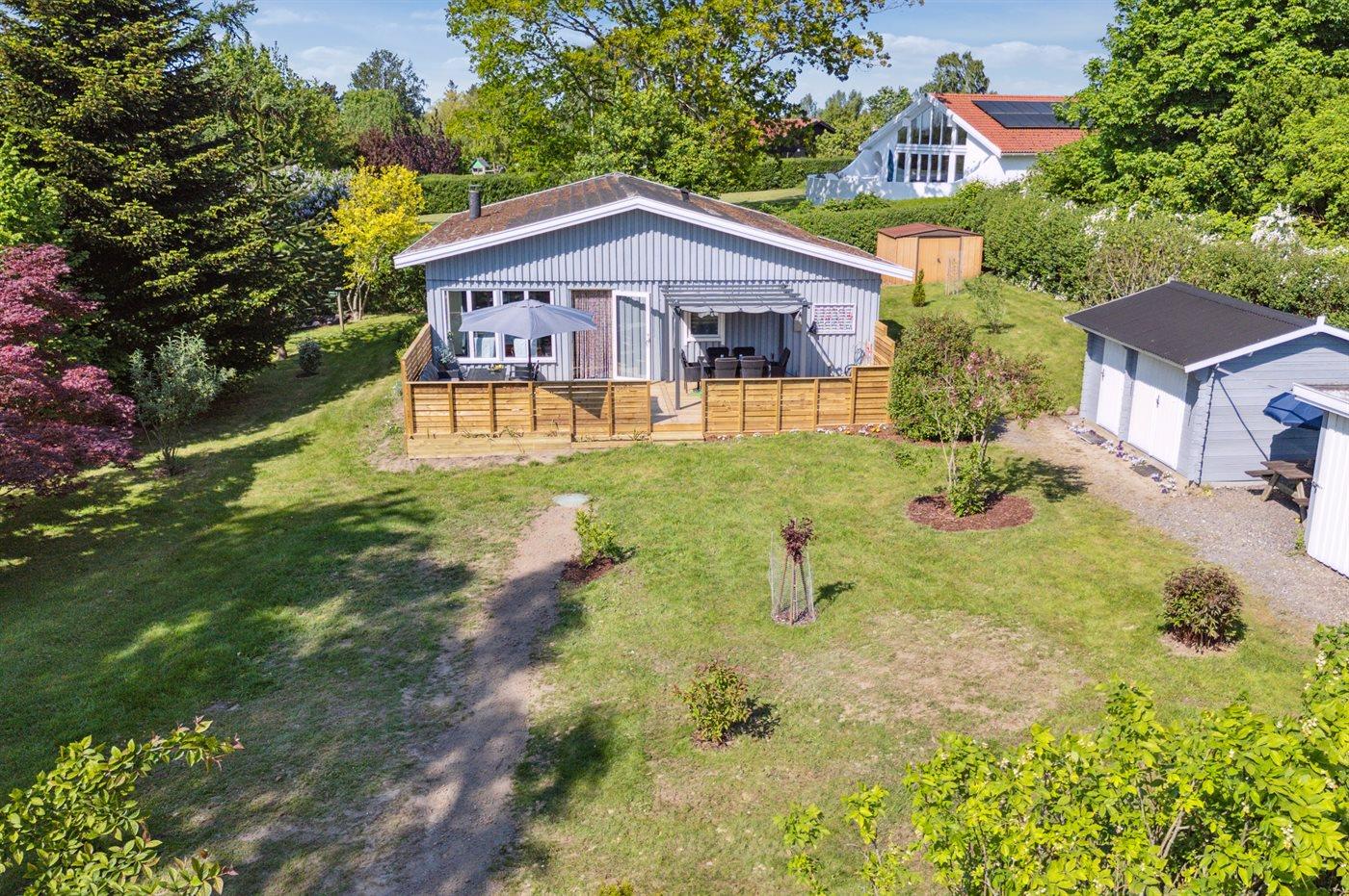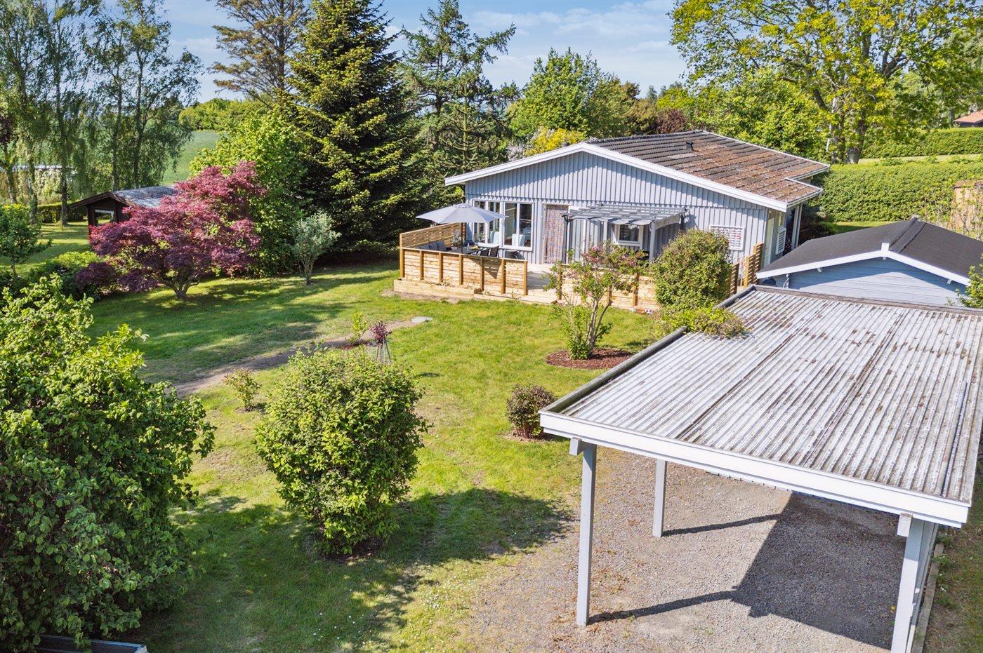 Ferieboligen er beliggende på en 1265 m² stor havegrund. Der er 600 m til fjorden. Nærmeste forretning er beliggende i en afstand af 2800 m. Der er en golfbane i en afstand af 16700 m. Til ferieboligen hører 40 m² terrasseareal. Ligeledes er der adgang til udestue. Grill til rådighed. Der er carport til rådighed. Parkering ved ferieboligen.