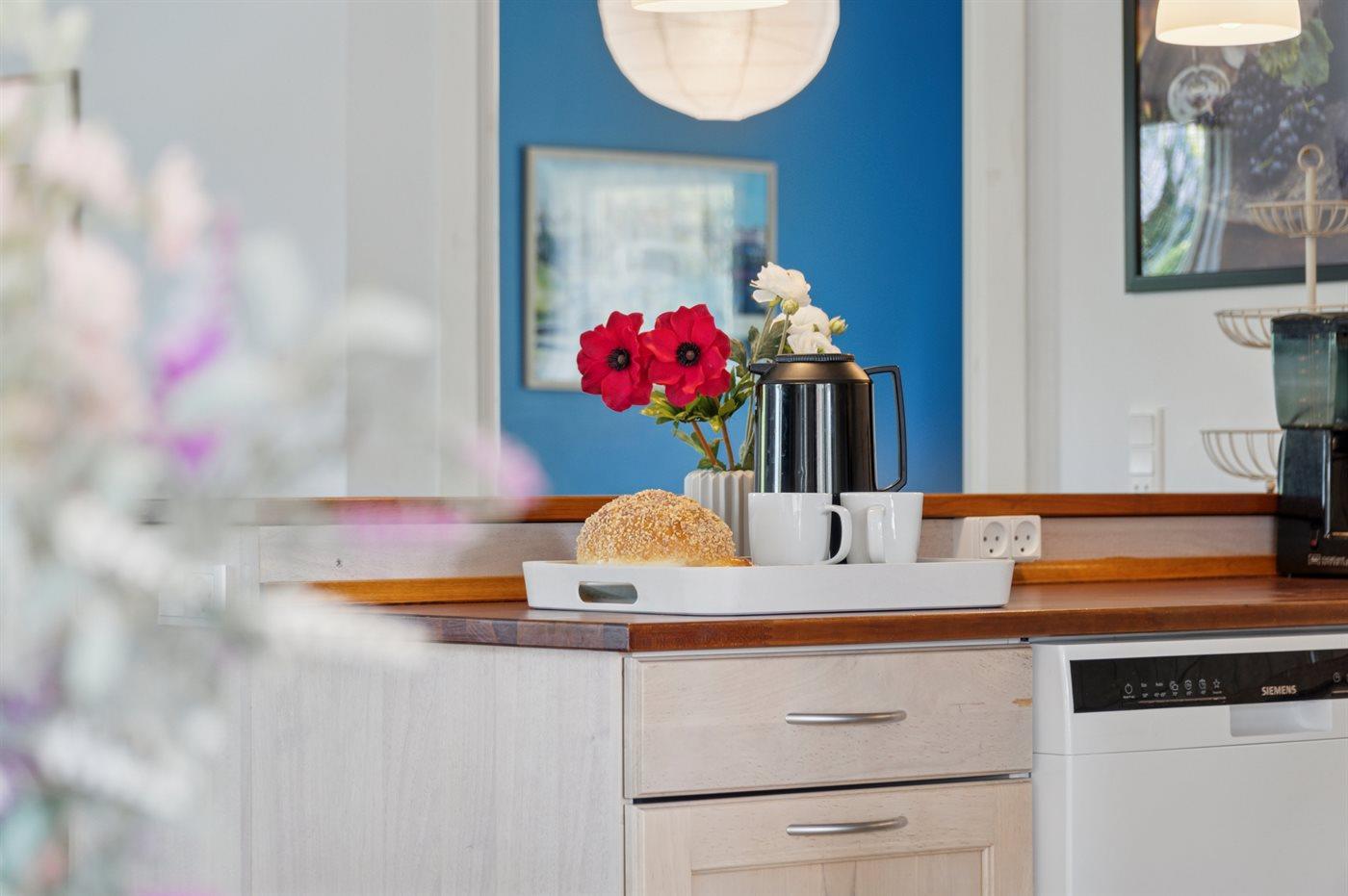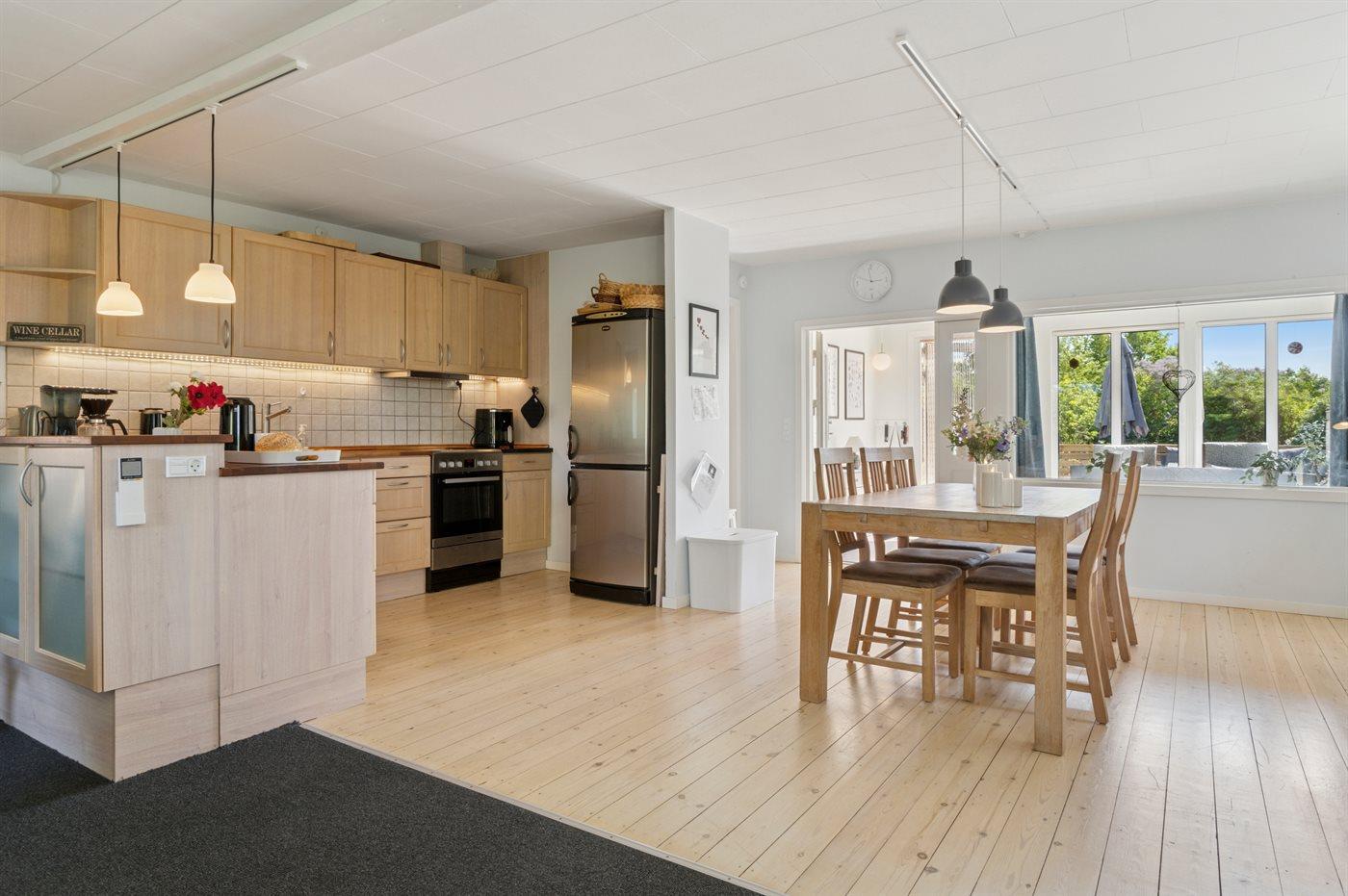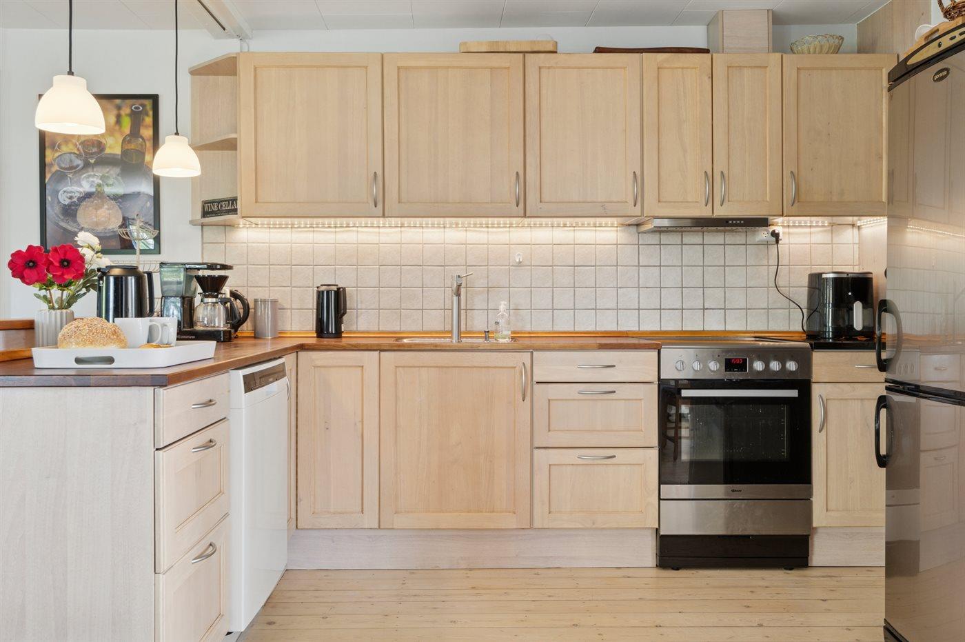 Køkkenet er udstyret med 1 køleskab. Der er 4 keramiske kogeplader, varmluftovn samt opvaskemaskine.