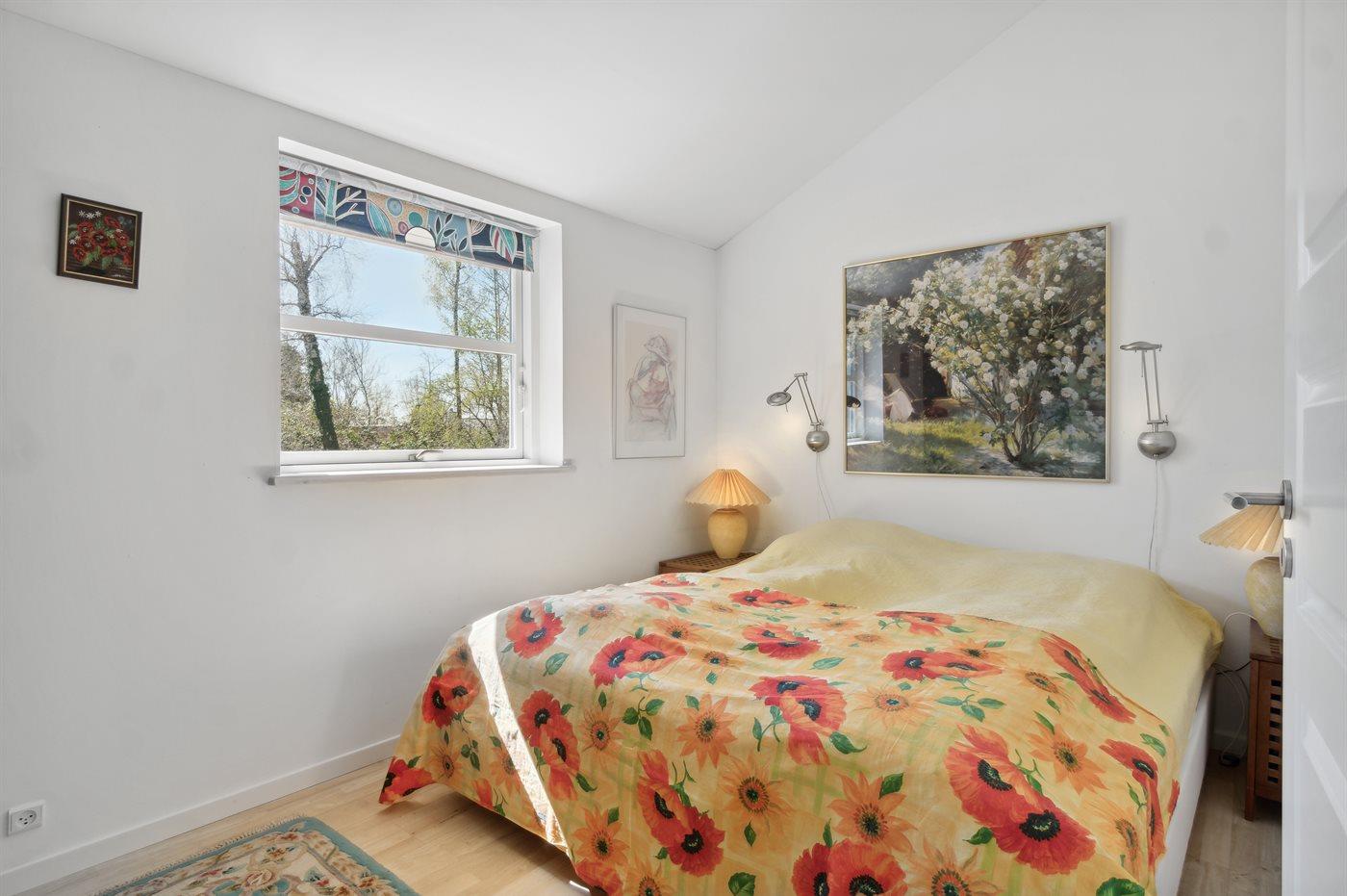 Der er i alt 2 soveværelser. Sovepladserne fordeler sig på: 2 sovepladser i dobbeltseng.2 sovepladser i elevationssenge. 1 soveplads på madras. 1 af disse sovepladser befinder sig på husets hems.
