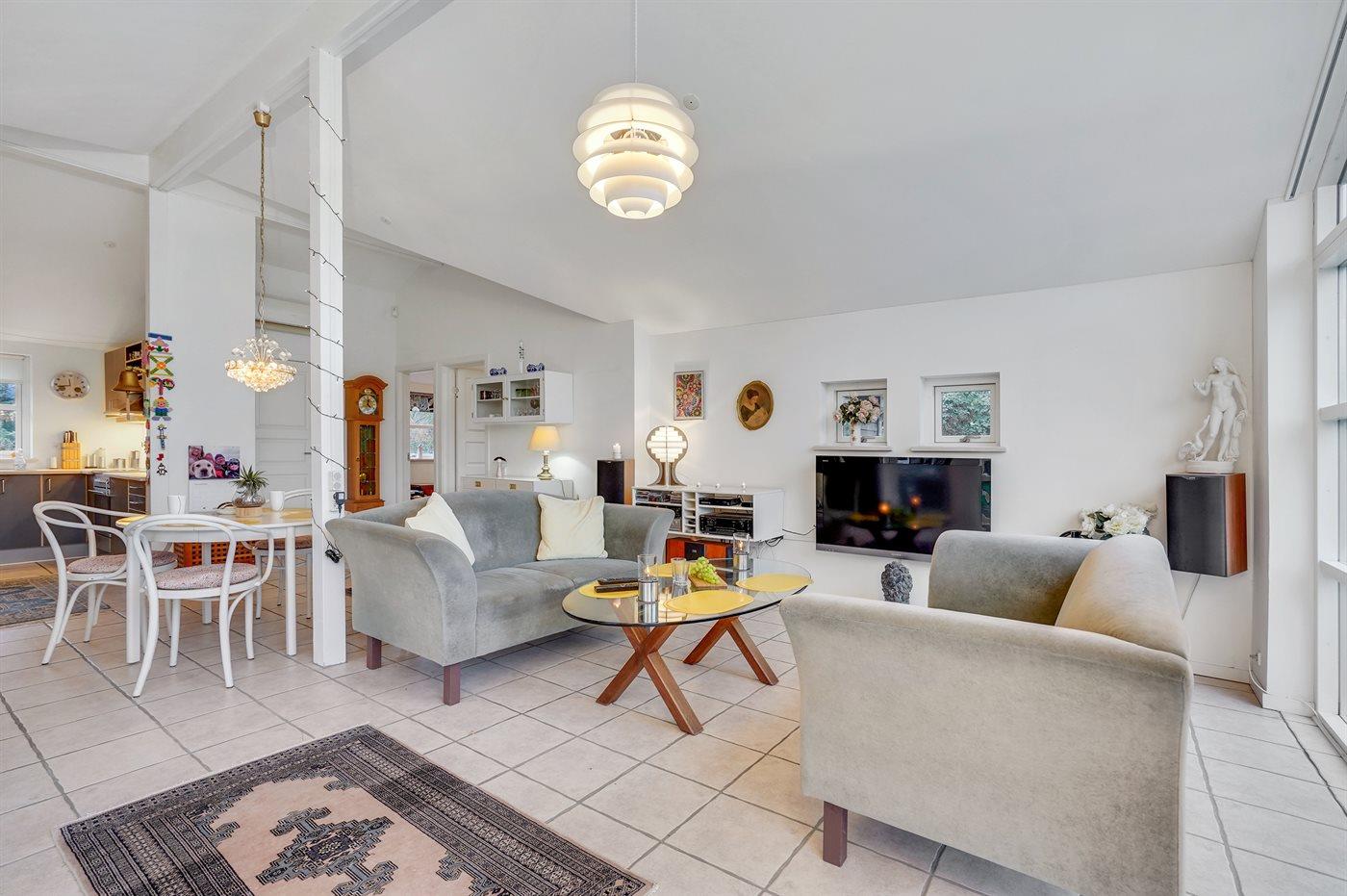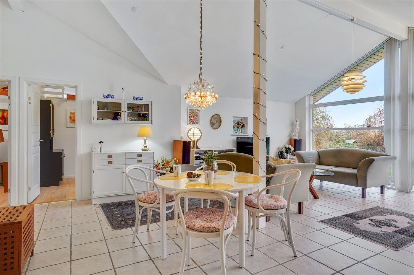Husets midtpunkt er det store fællesrum med et stort åbent køkken, spiseplads og stue ud i et. Dette er sammen med den store træterrasse de naturlige samlingssteder for hygge og samvær. Der findes 2 gode soveværelser med hver 2 sovepladser samt 1 soveplads på hemsen. Badeværelset med bruseniche og gulvvarme er stort og med masser af skabsplads. Der er elektrisk gulvvarme i alle klinkegulve samt 2 varmepumper, hvoraf den ene også kan køle med aircondition.