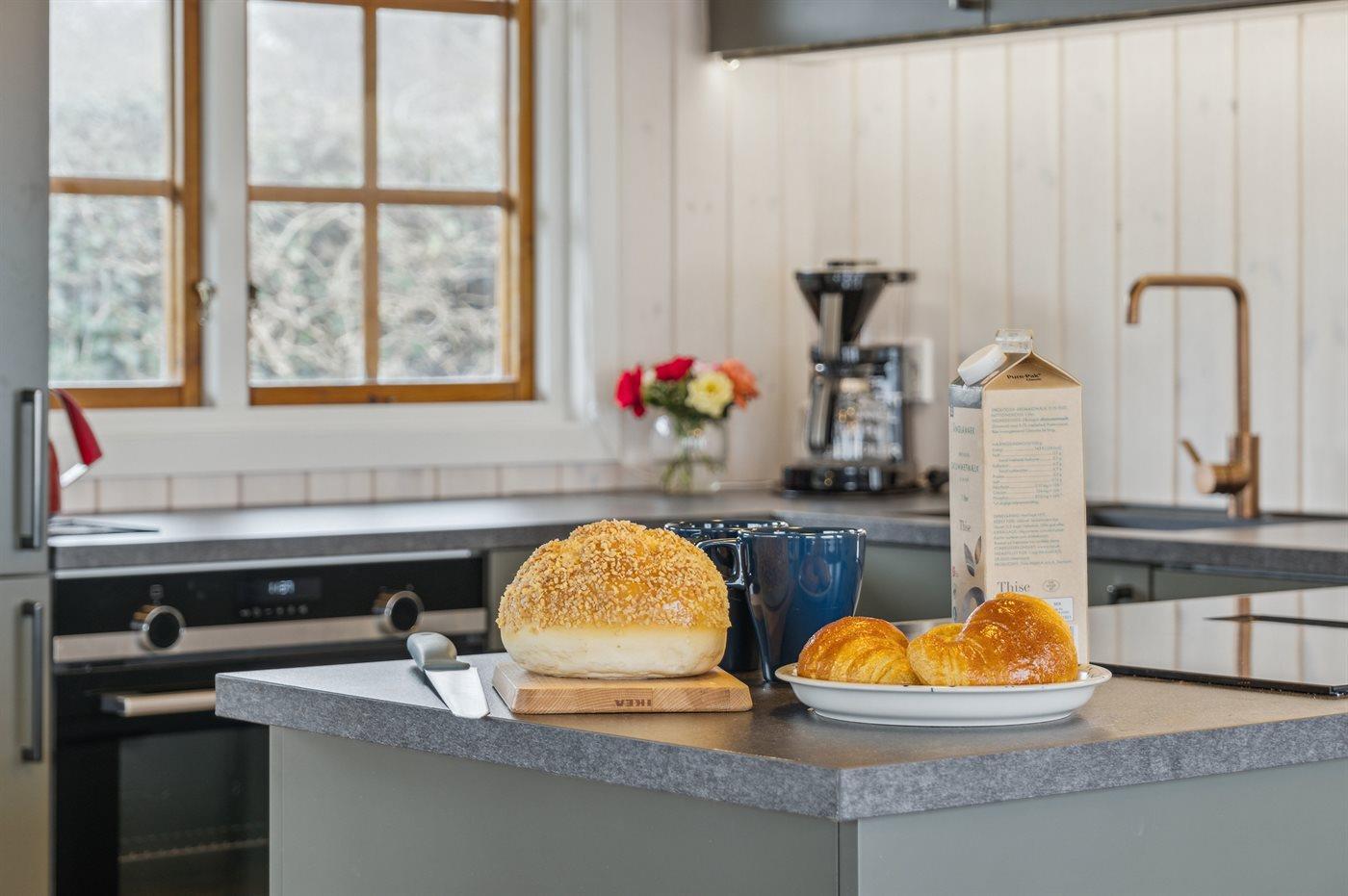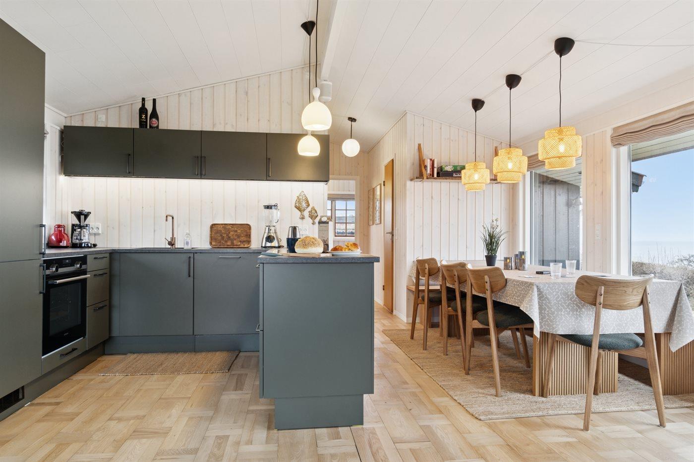 Køkkenet er udstyret med 1 køleskab. Der er 4 induktionskogeplader, varmluftovn samt opvaskemaskine.