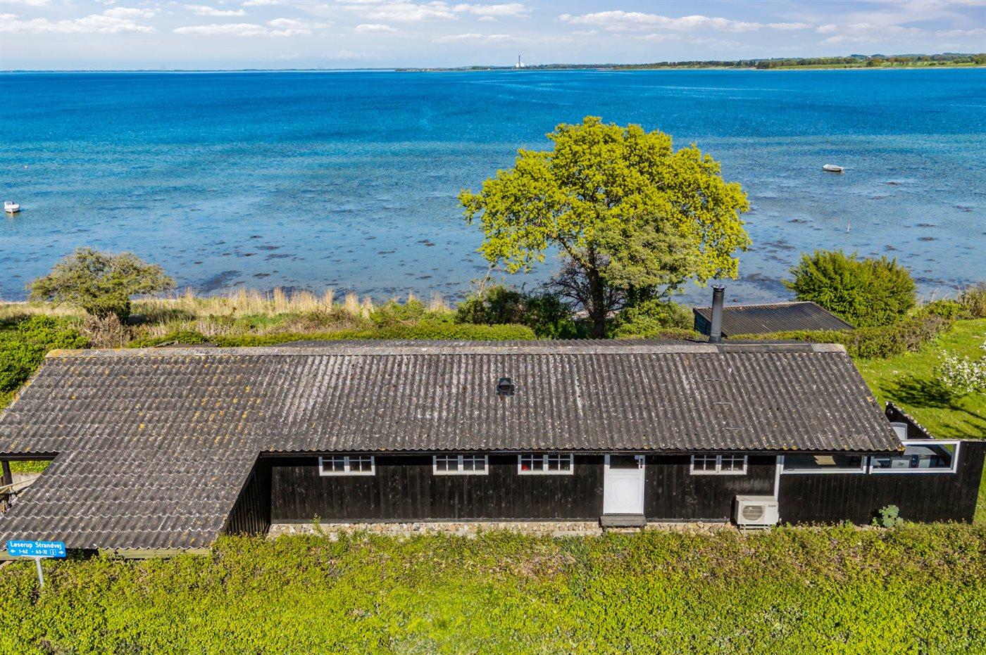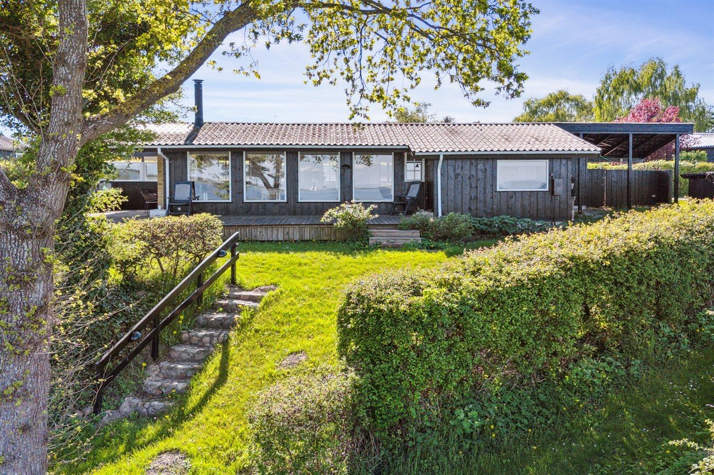 Moderne sommerhus i første række med panoramaudsigt over fjord og strand ved Tuse Næs.