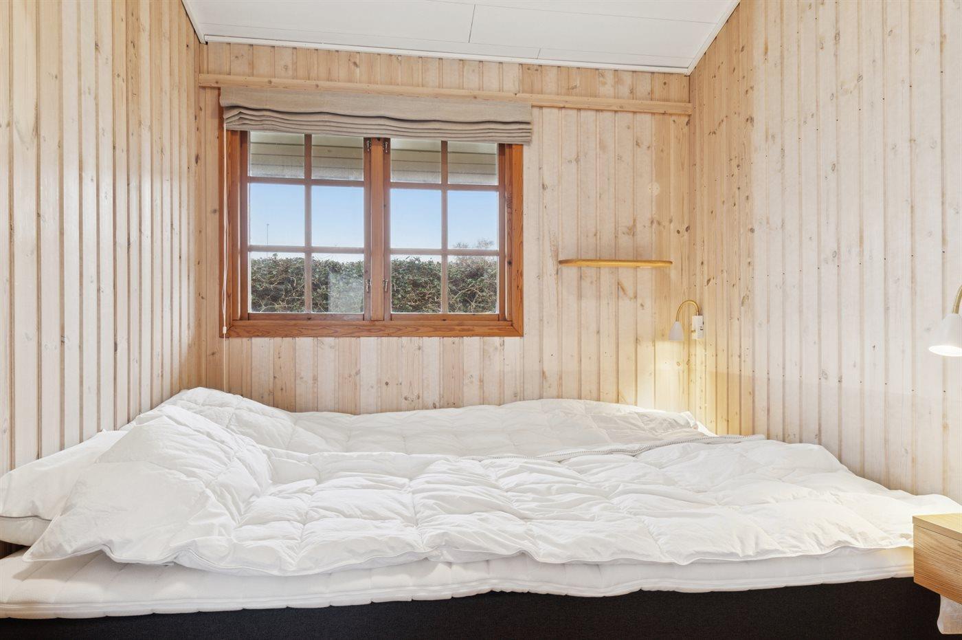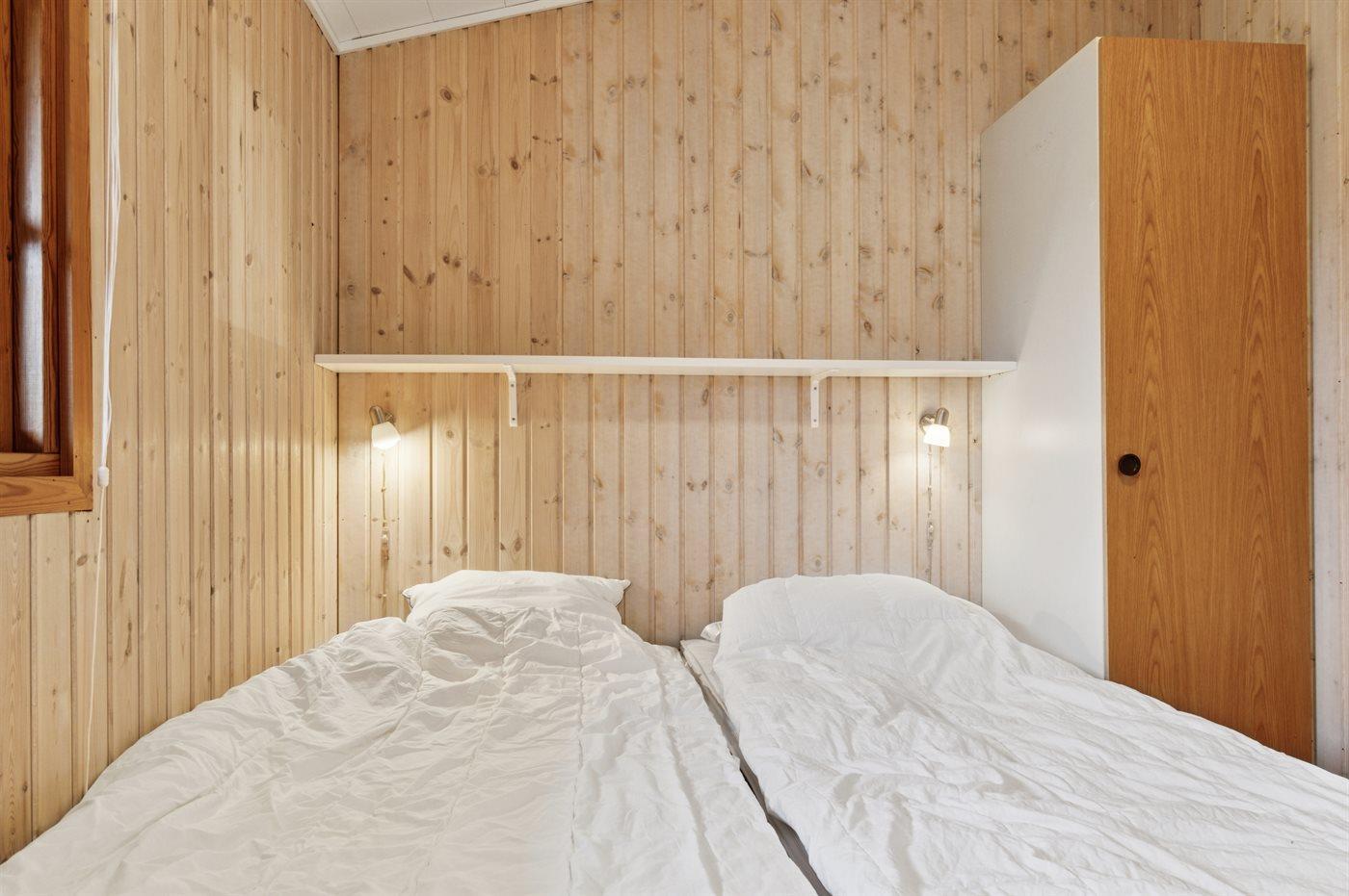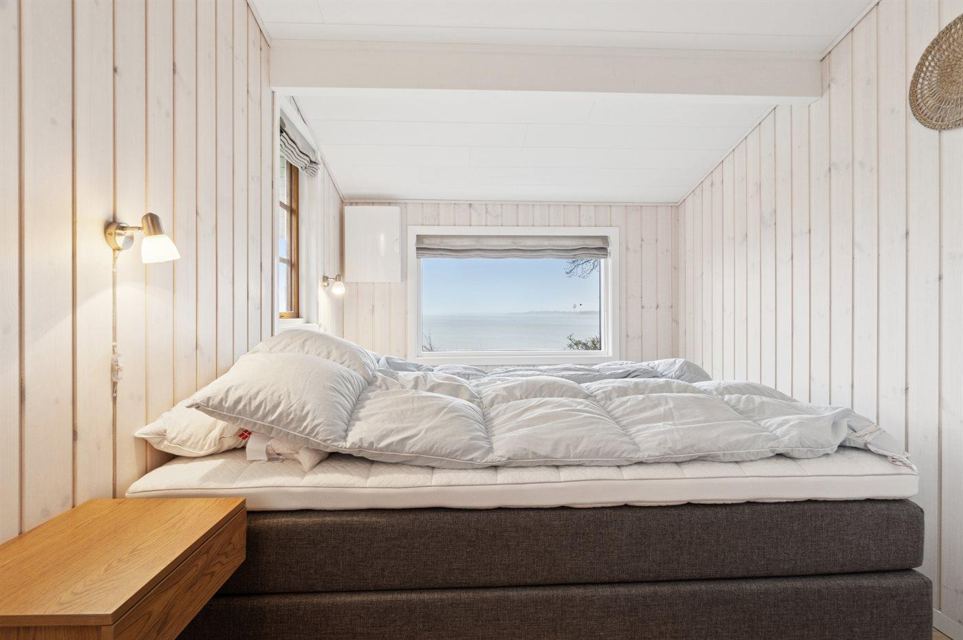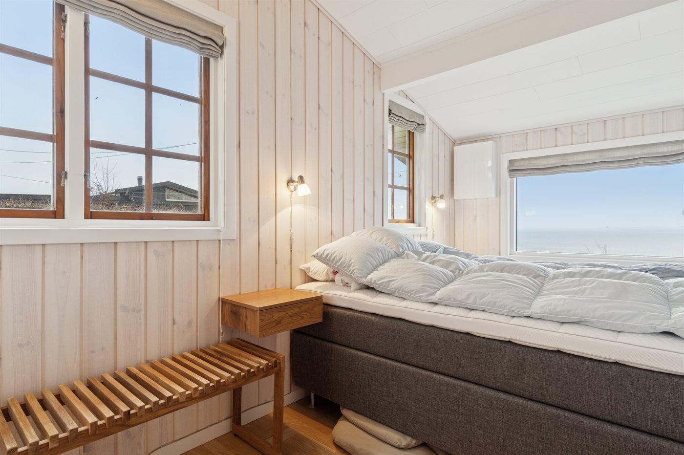 Der er 3 soveværelser. Soveværelset mod fjorden er med dobbeltseng og har den mest fantastiske udsigt til fjorden. Der er endnu et værelse med dobbeltseng. I det tredje soveværelse er en enkelt soveplads (denne soveplads måler 85x190 cm.). Badeværelset er med bruseniche.
