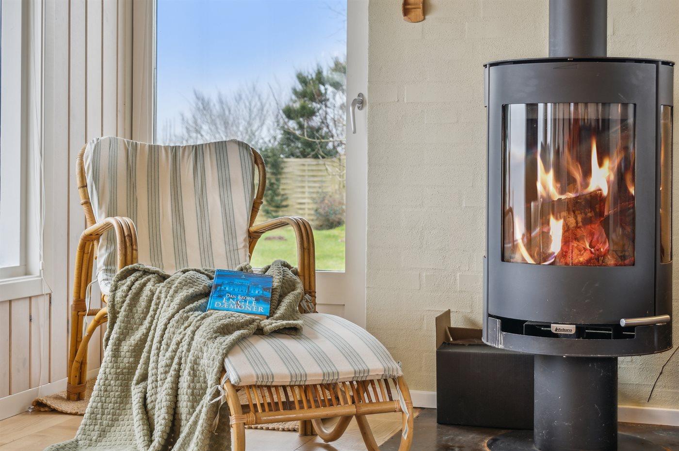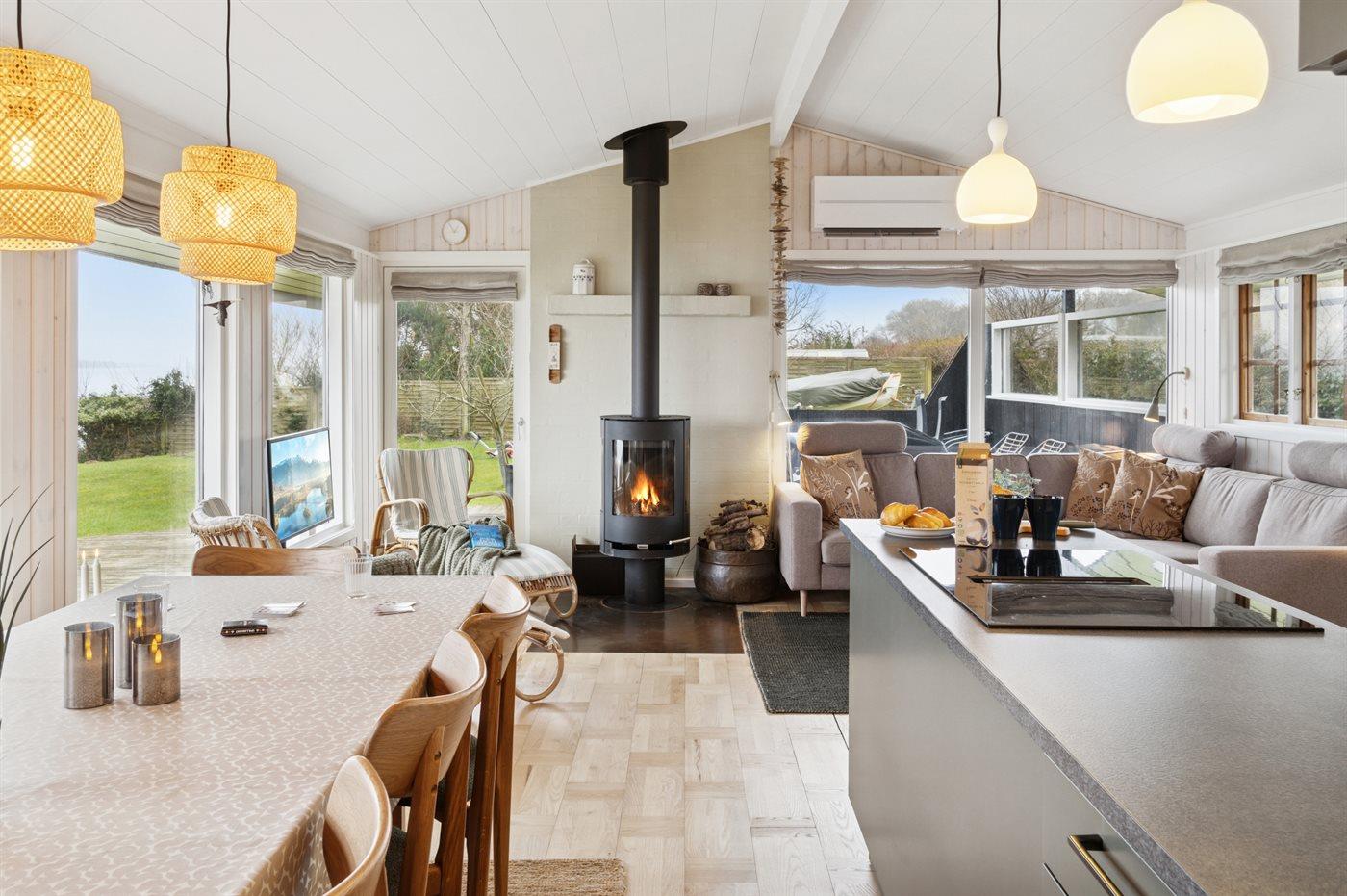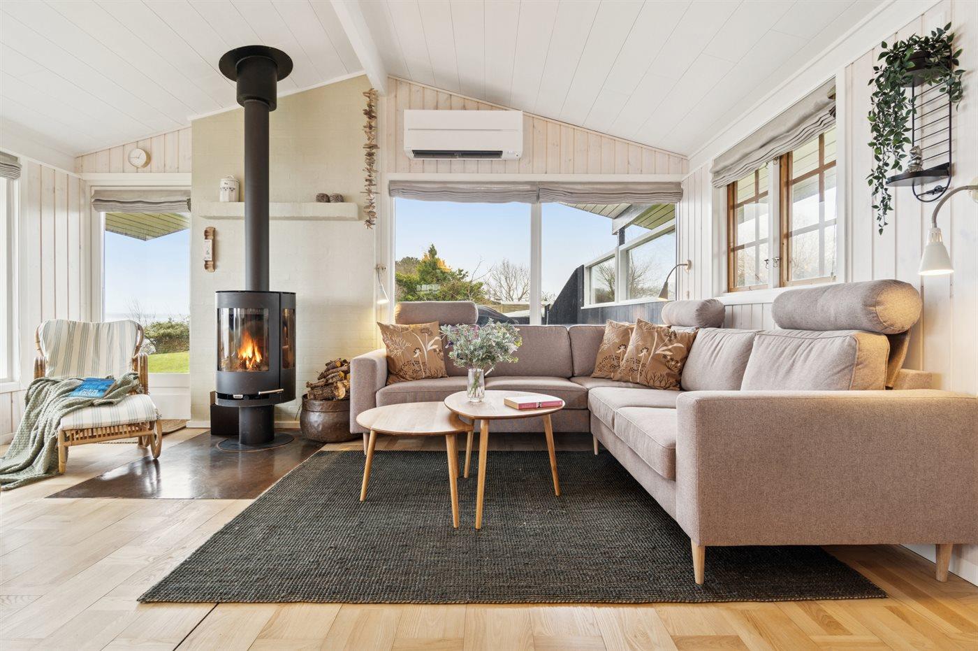 Huset opvarmes energivenligt med luft-til-luft varmepumpe, og der er desuden brændeovn.