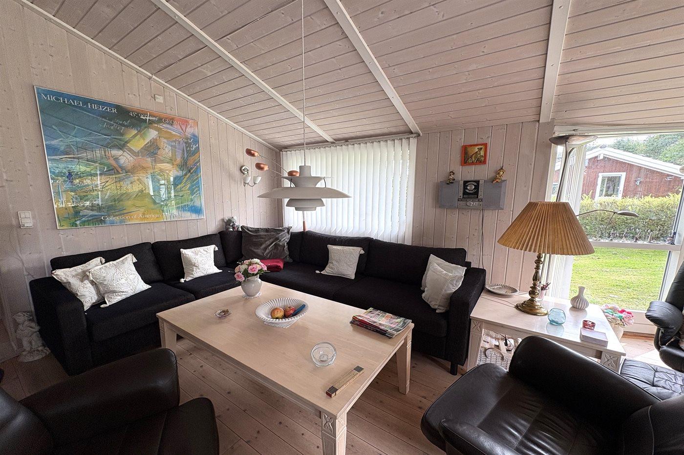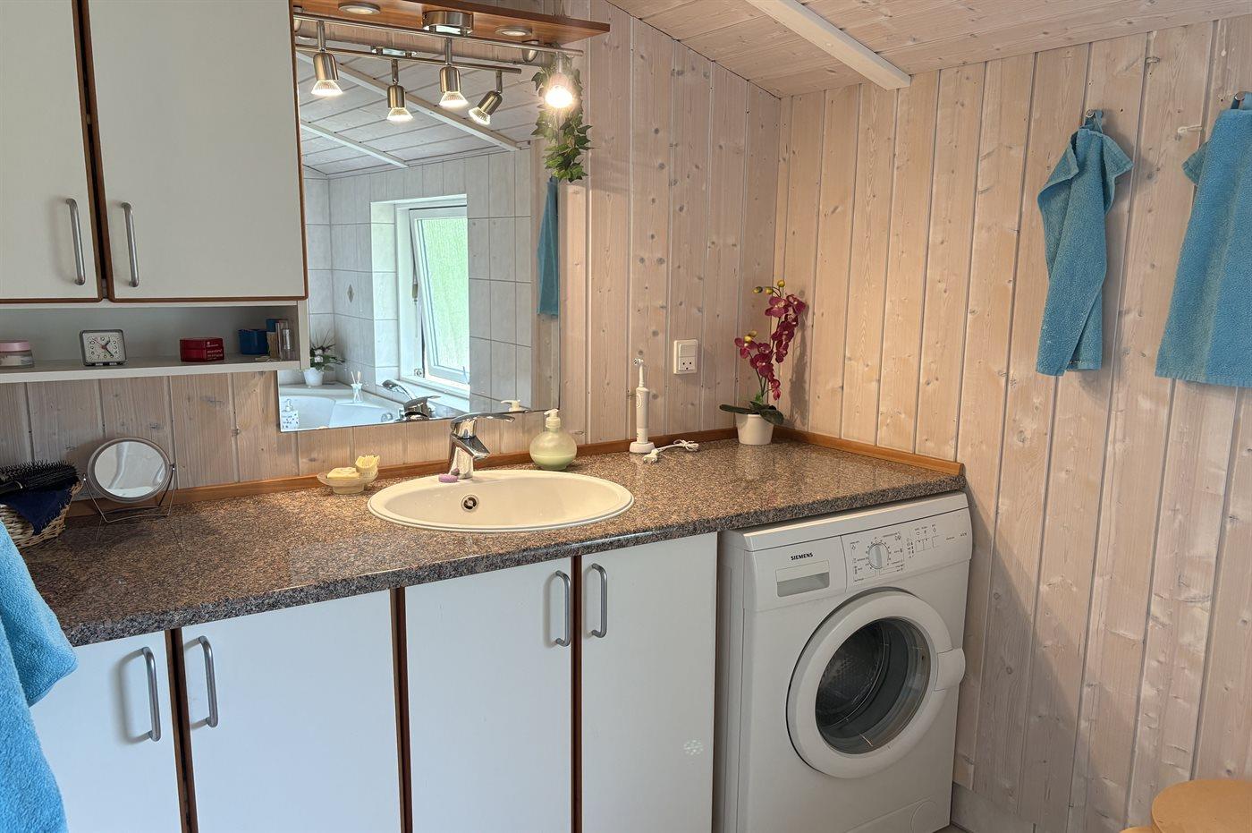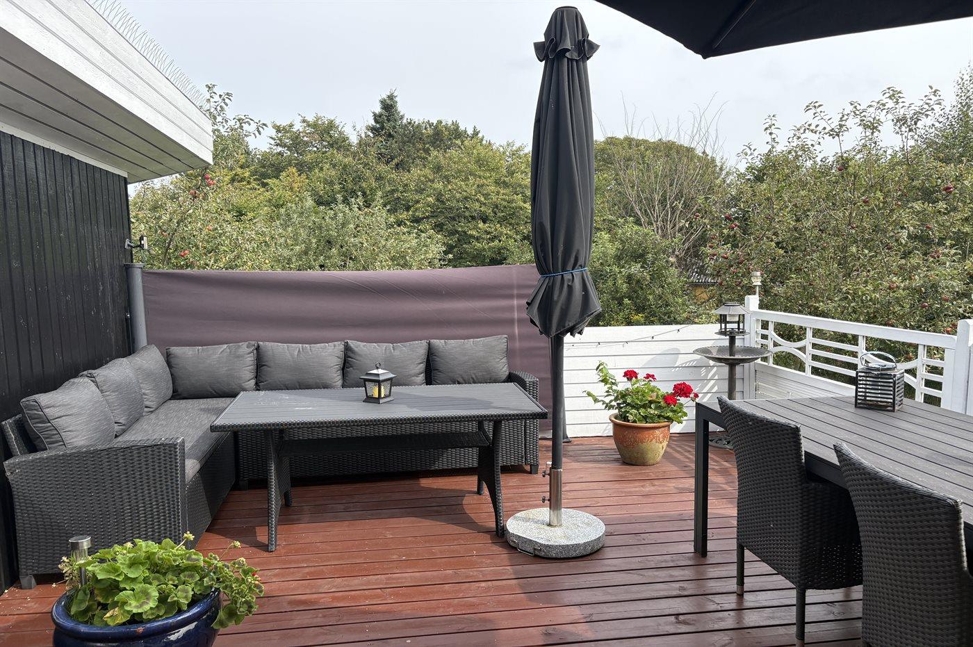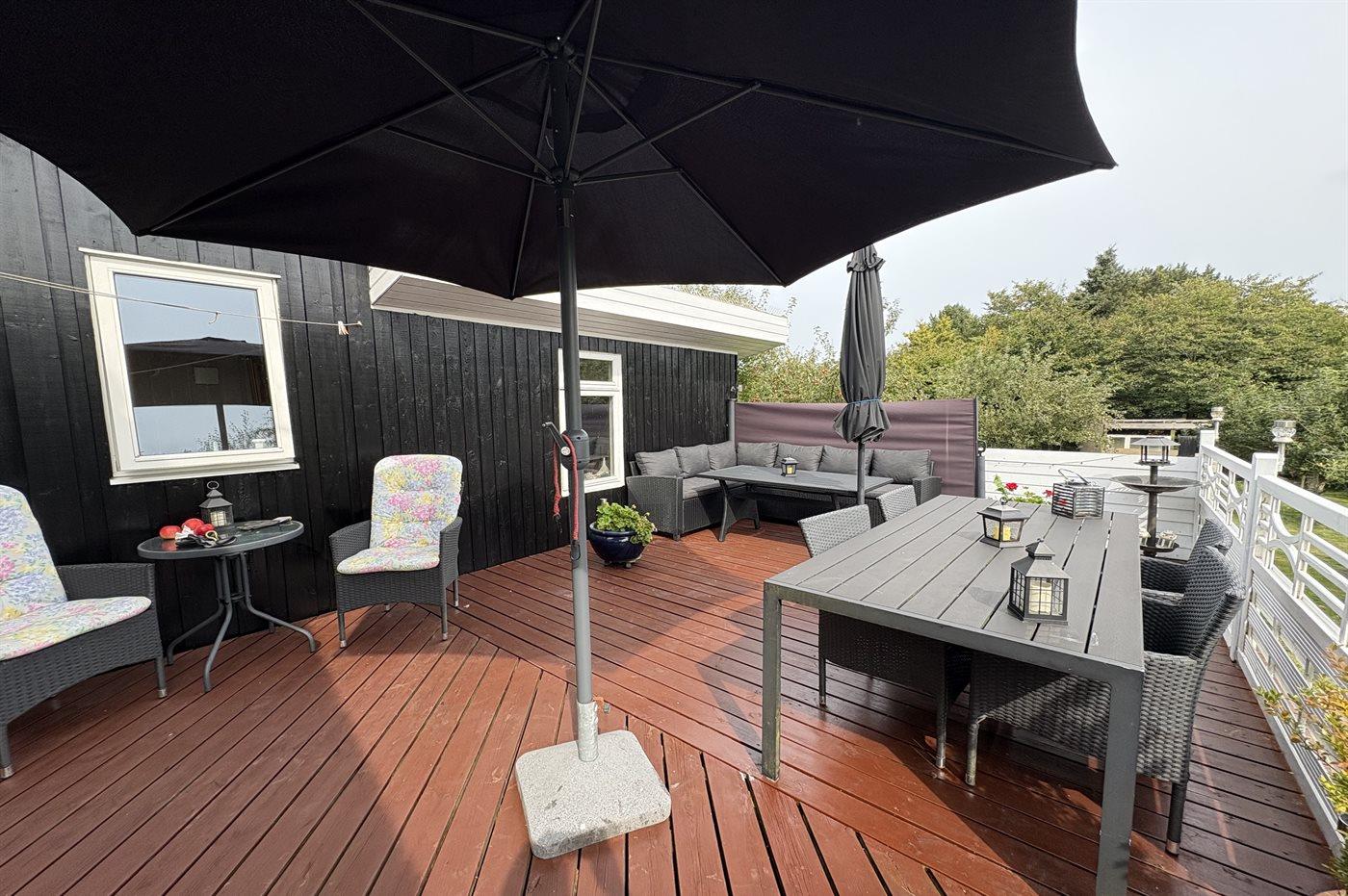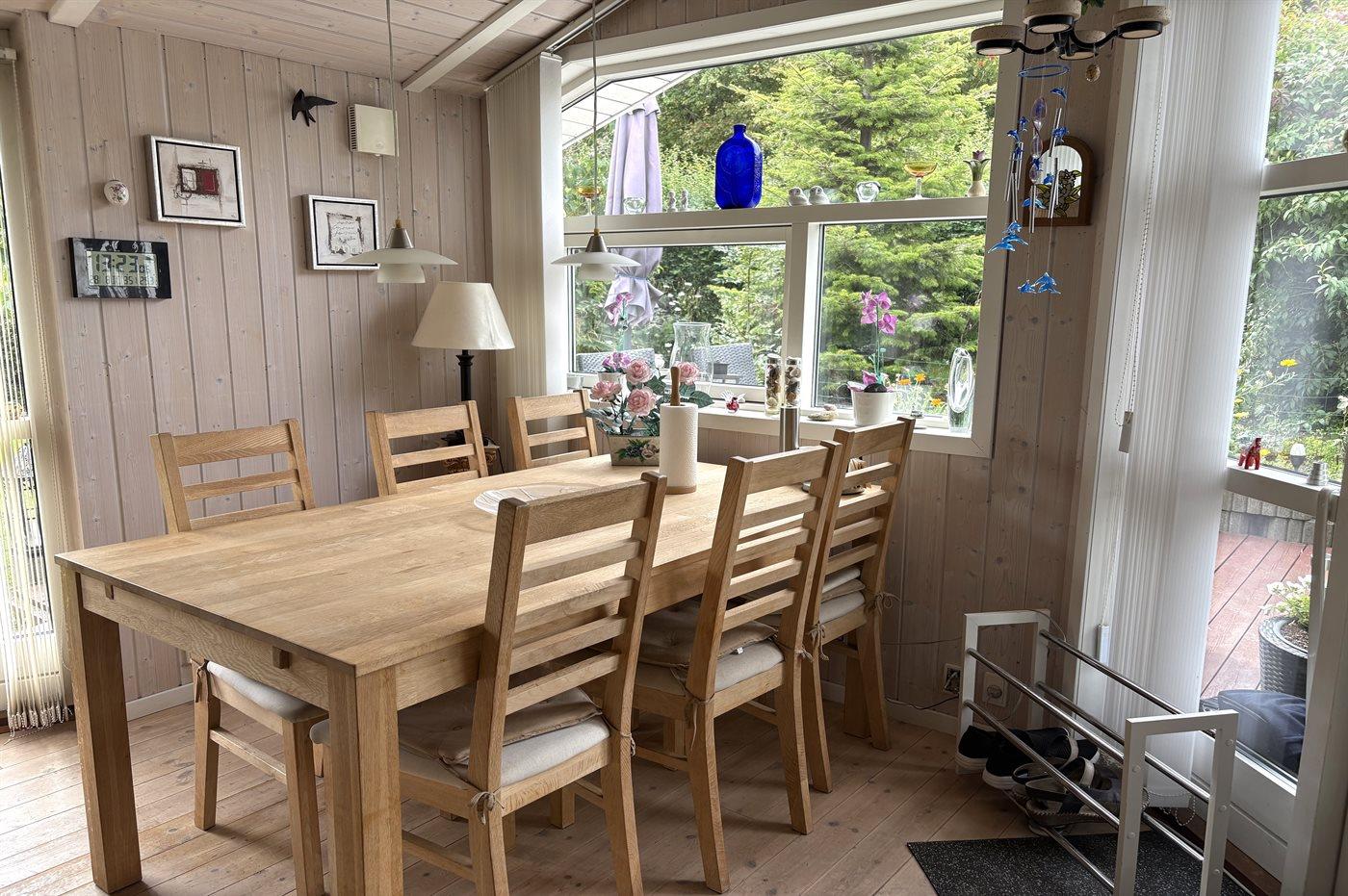 Huset er indrettet med en hyggelig stue med spiseplads og udgang til terrassen, hvoraf en mindre del er overdækket. Fra køkkenet er der udgang til endnu en dejlig og solrig terrasse med kig ud over haven.