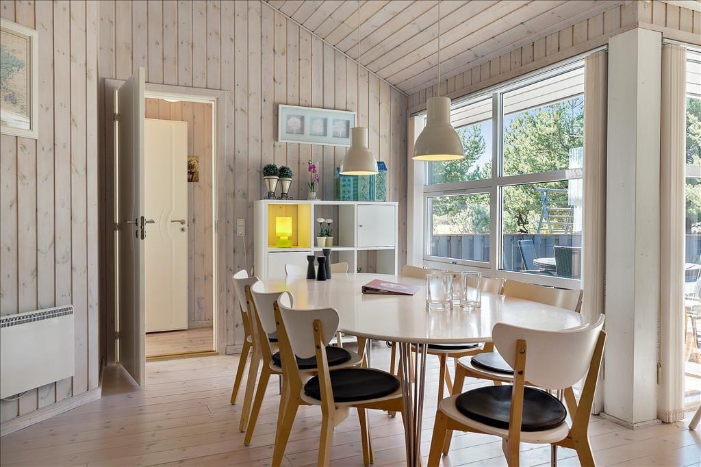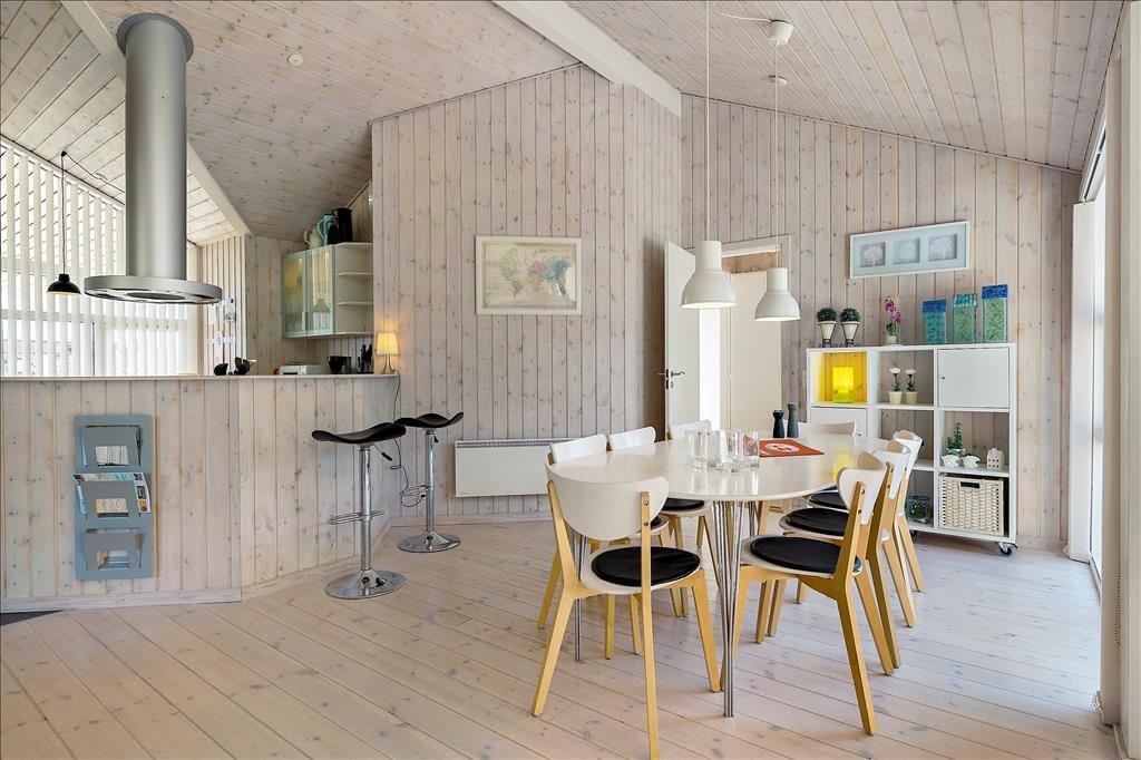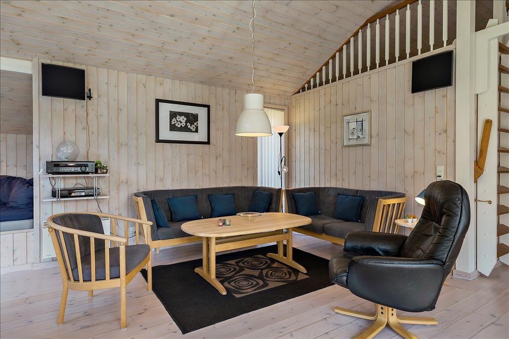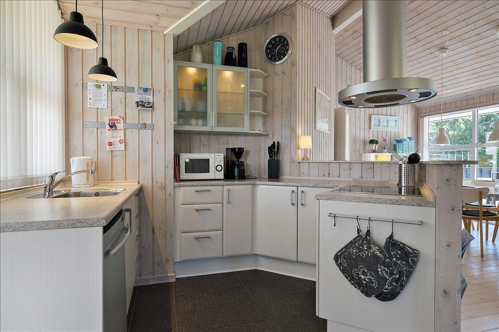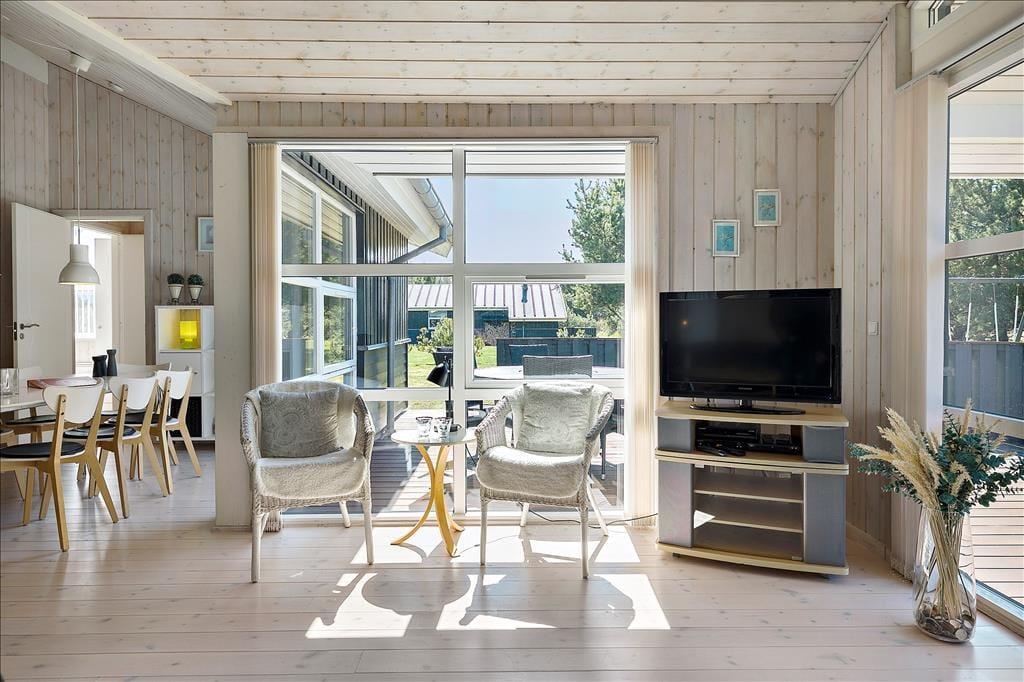 Indenfor bliver du mødt af en lys og indbydende indretning, hvor store vinduer lader solen strømme ind og skaber en følelse af rummelighed og nærvær med naturen udenfor. Opholdsstuen er hjertet i huset, hvor familien kan samles omkring spisebordet eller slappe af i de komfortable møbler med udsigt til haven. Køkkenet ligger i åben forbindelse med stuen, hvilket gør det let at være sammen, mens maden tilberedes. Her er rummet designet til hygge og fællesskab, perfekt til både afslapning og feriesamvær.