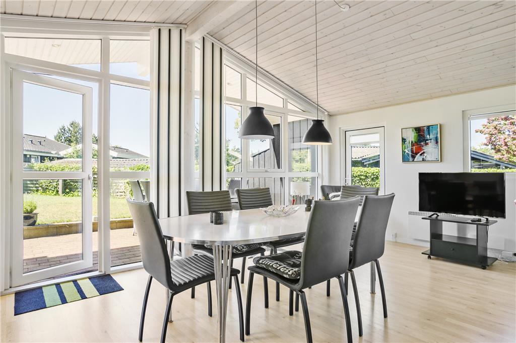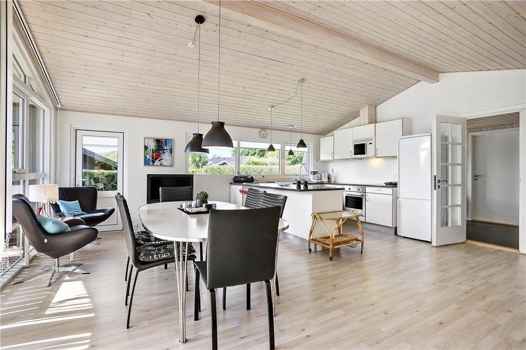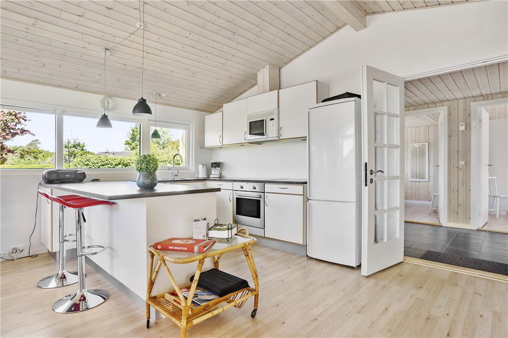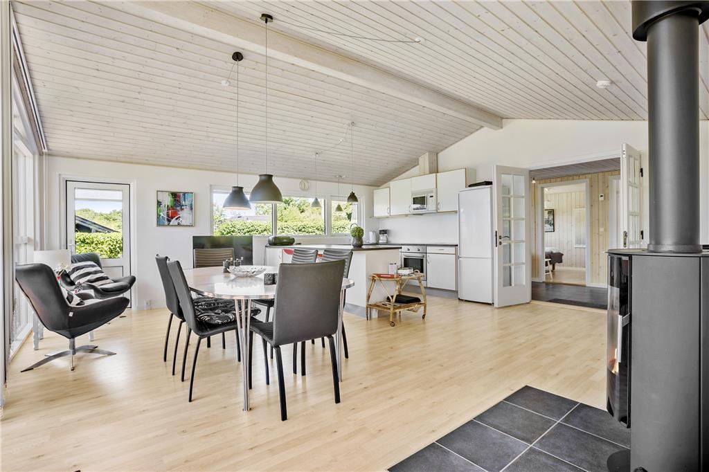 Sommerhuset byder dig indenfor i en lys og indbydende atmosfære, hvor hjemlig hygge går hånd i hånd med funktionel komfort. Stuen er det naturlige samlingspunkt med sine store vinduer, der lukker dagslyset ind og giver udsigt til de naturskønne omgivelser. Her kan du nyde rolige aftener foran tv’et eller brændeovnen, mens duften af aftensmad breder sig fra det åbne køkken. Huset er indrettet med fokus på afslapning og nærvær, og her er der plads til at skabe minder med dem, du holder af.