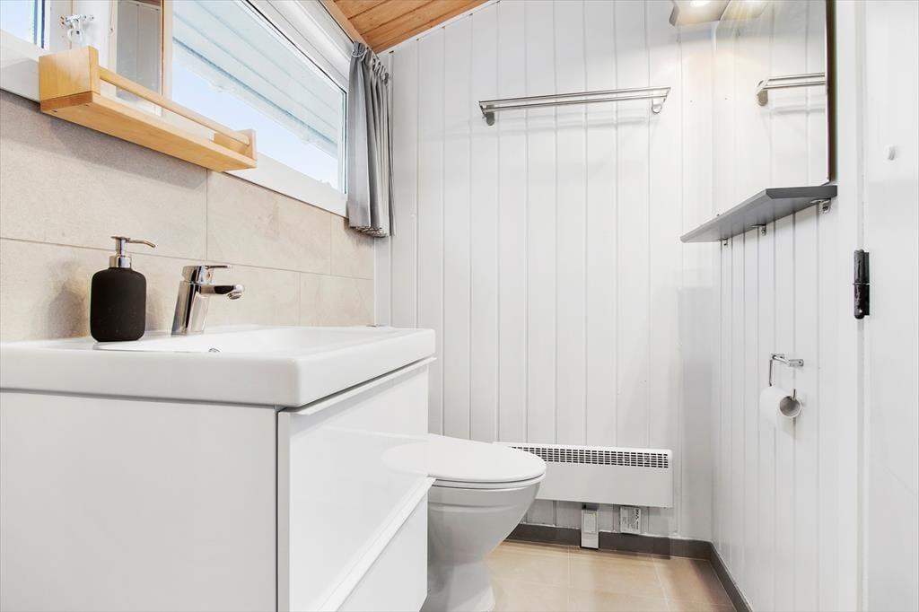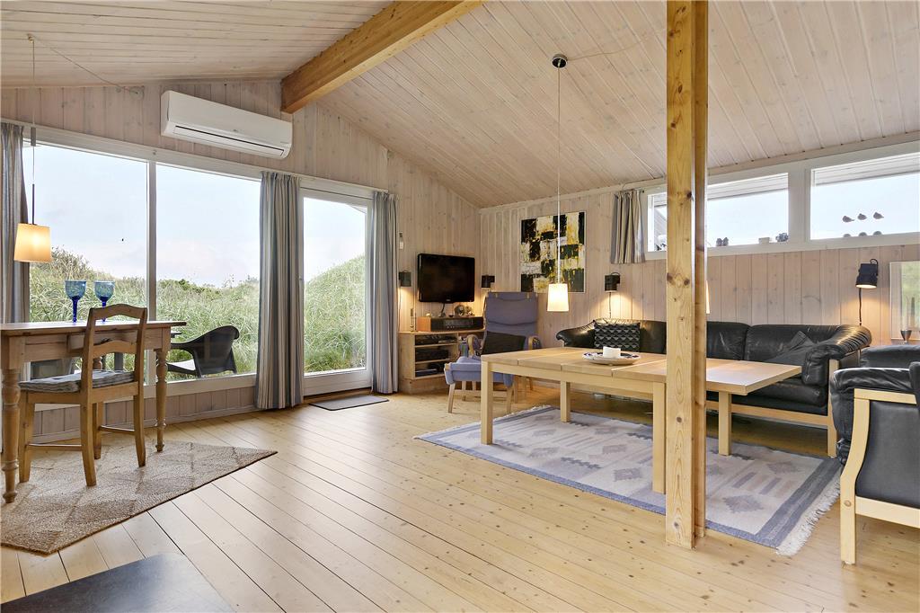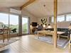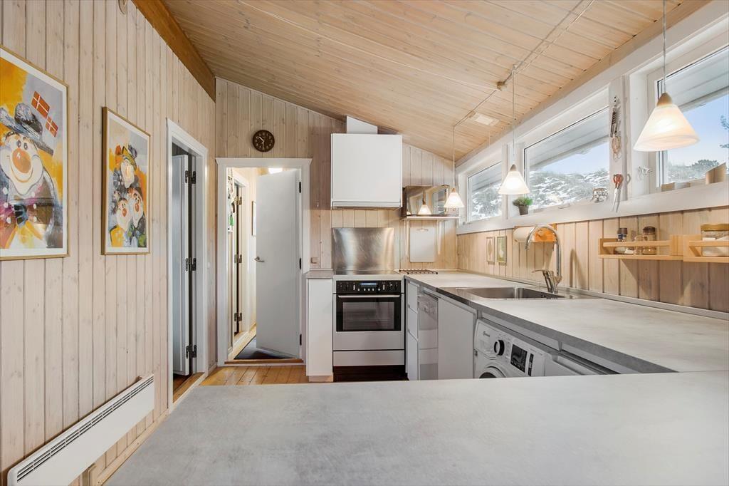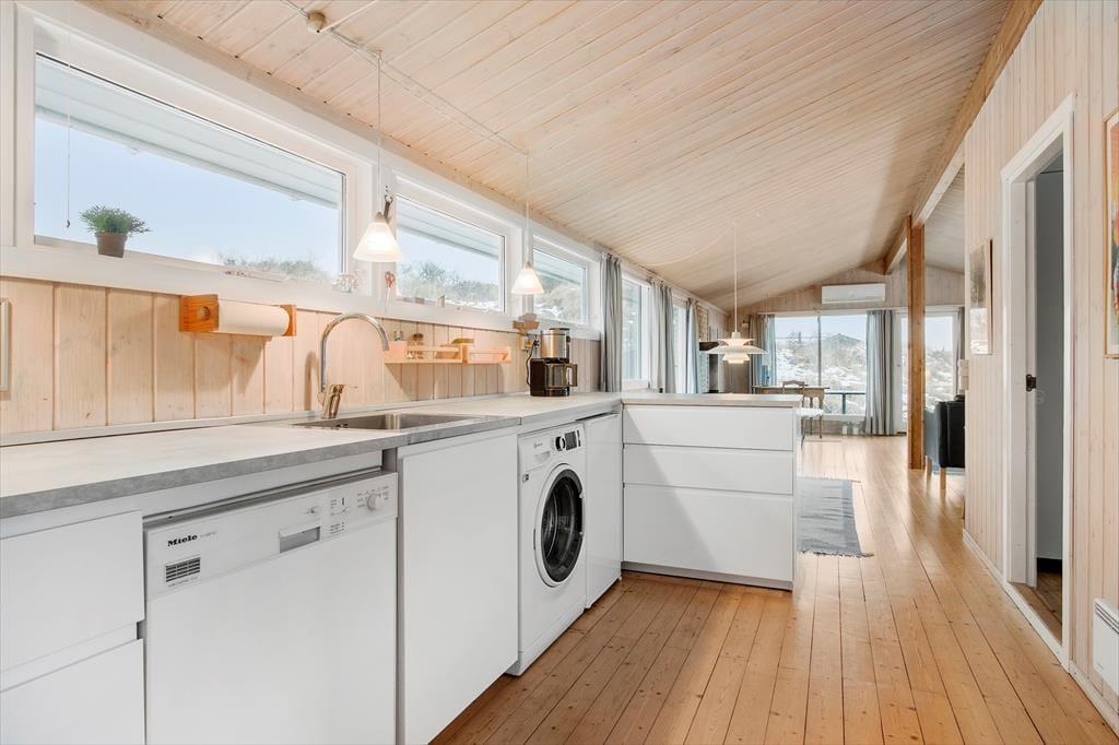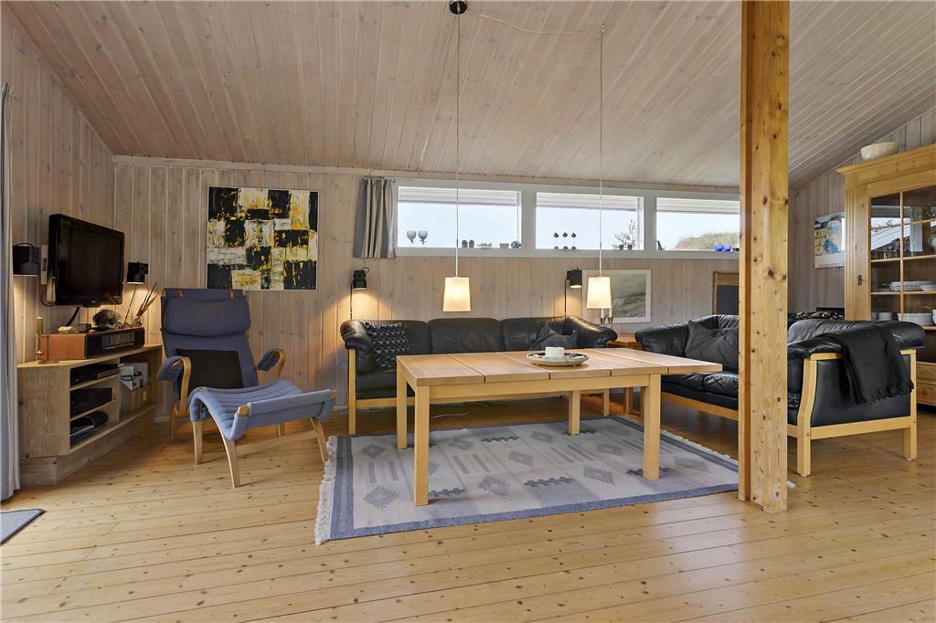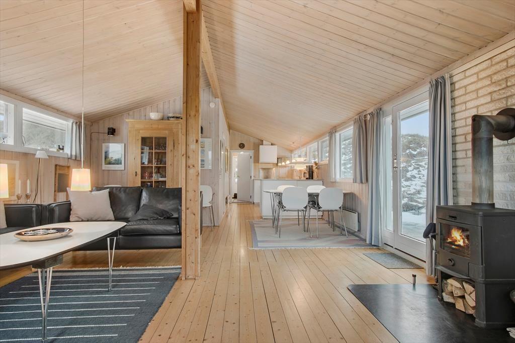 Indenfor møder du en lys og indbydende indretning, hvor sommerhusstemningen virkelig kommer til sin ret. Det åbne opholdsrum byder på både stue og køkken i ét, så hele familien kan samles om madlavning, spil eller hyggelige stunder foran brændeovnen. Store vinduer sørger for masser af dagslys og giver samtidig et flot kig til naturen udenfor. Husets værelser er enkle og komfortable, hvilket gør det let at falde til ro og nyde en afslappet nattesøvn efter en dag fyldt med oplevelser.