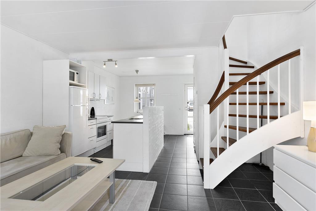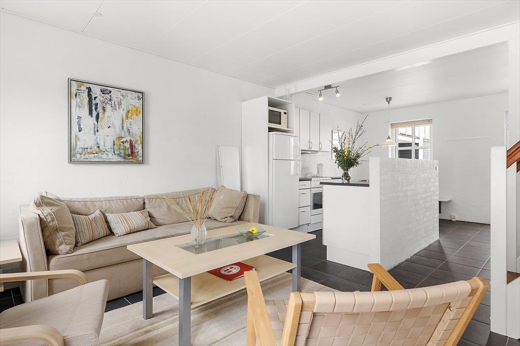 Lejligheden strækker sig over to etager og byder på et lyst og indbydende interiør. Stueetagen rummer et moderne køkken, der ligger i åben forbindelse med stuen – et perfekt samlingspunkt for hele familien. På første sal finder du et rummeligt soveværelse og en hyggelig opholdsplads, der indbyder til afslapning efter en dag fyldt med oplevelser. Den lille altan på første sal er ideel til at nyde morgenkaffen, mens dagens planer langsomt tager form.