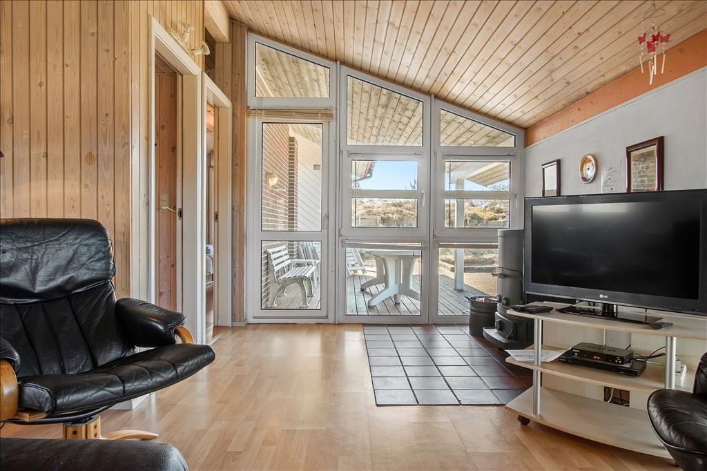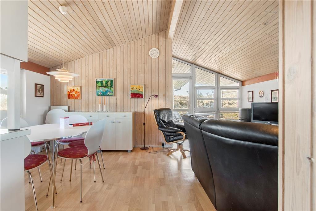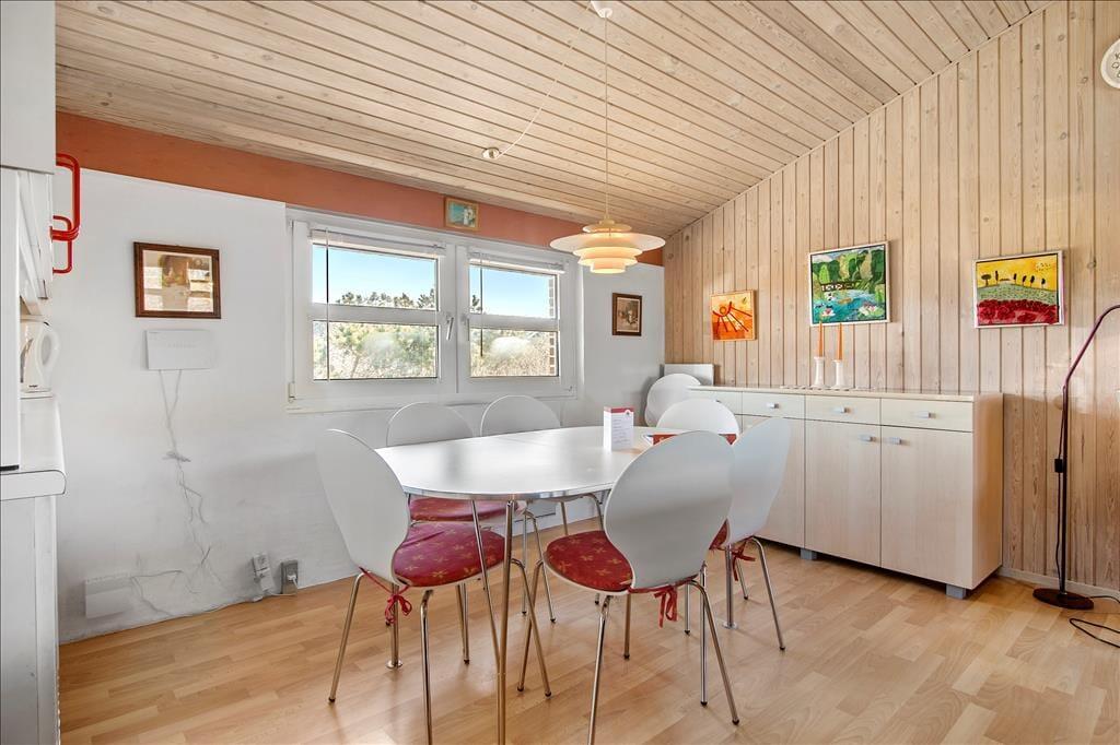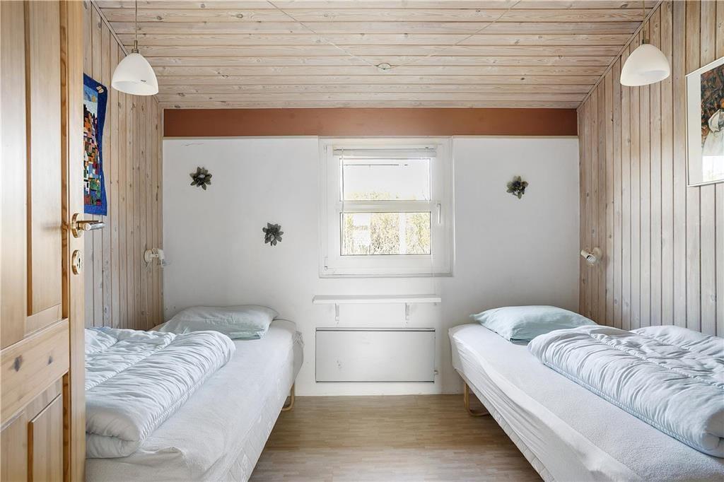 Indenfor i sommerhuset bliver du mødt af en lys og åben atmosfære, der emmer af hygge og feriestemning. De store vinduer sørger for masser af dagslys og giver et smukt kig til de grønne omgivelser. Stuen og det åbne køkken ligger i forlængelse af hinanden og udgør et naturligt samlingspunkt for familien, hvad enten I laver mad, spiller brætspil eller slapper af i sofaen. Sommerhuset er indrettet med komfortable værelser, der indbyder til rolige morgener og afslappede aftener – det perfekte udgangspunkt for en ferie i ro og mag.