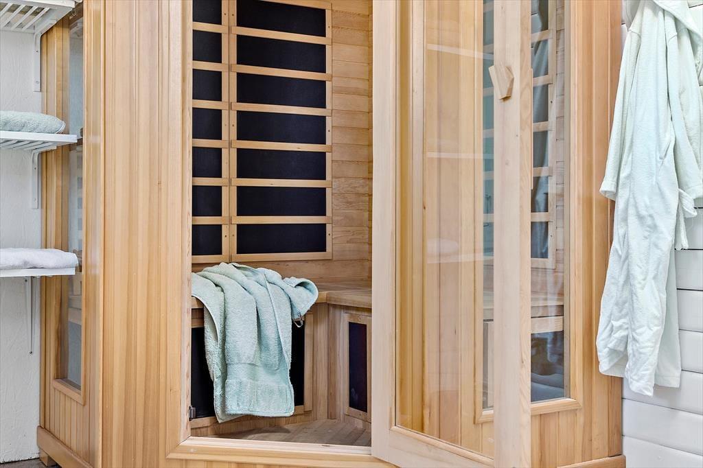 Inde i sommerhuset bliver du mødt af et stort og lyst opholdsrum, hvor stue og køkken smelter sammen i ét. De store vinduer lukker lyset ind og skaber en indbydende atmosfære, mens loftet til kip giver en luftig og rummelig fornemmelse. Brændeovnen spreder varme og hygge på de køligere dage, mens den infrarøde sauna tilføjer en ekstra dimension af velvære. Sommerhuset har to badeværelser, hvilket gør det ekstra komfortabelt for familien eller vennegruppen, der nyder ferien sammen.