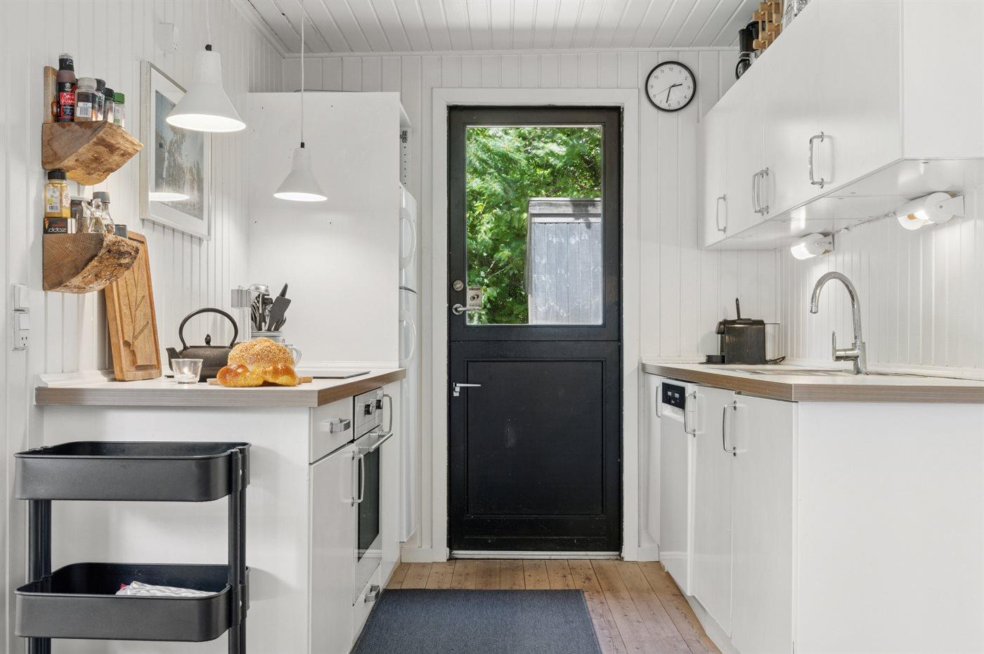 Køkkenet er udstyret med 1 køleskab. Der er 4 keramiske kogeplader, varmluftovn, mikrobølgeovn samt opvaskemaskine.