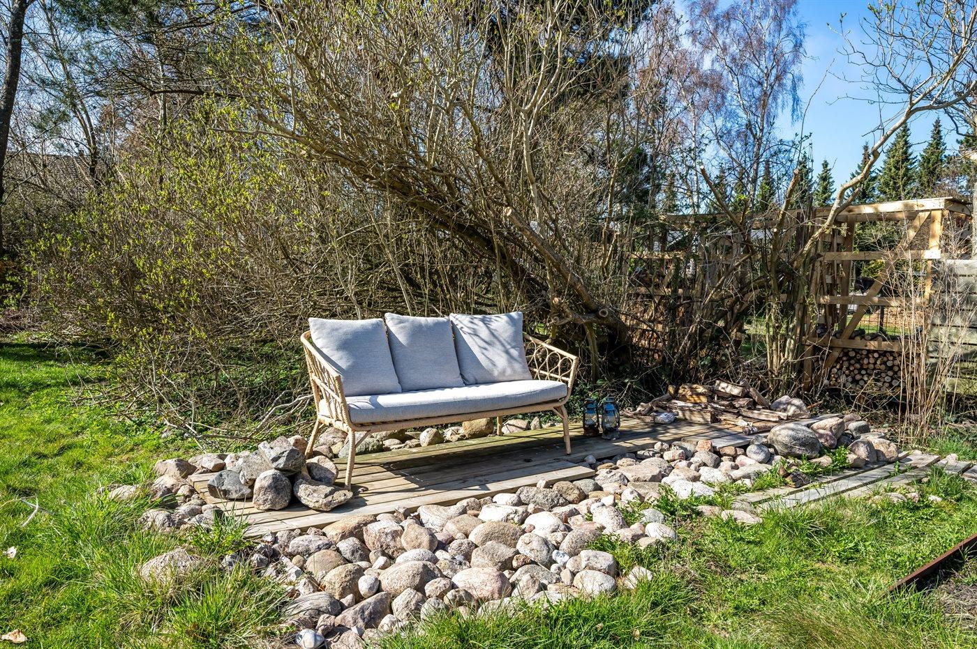 I haven og på terrasserne er der plads til afslapning, leg og hygge.