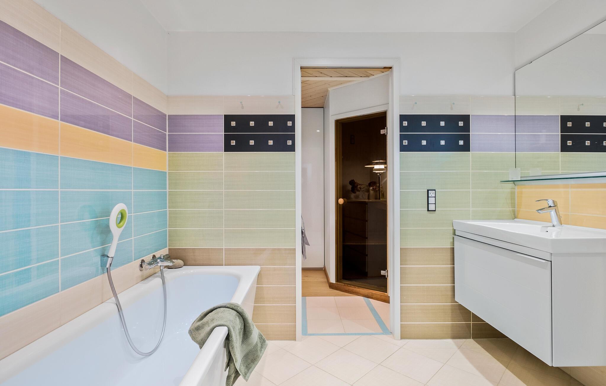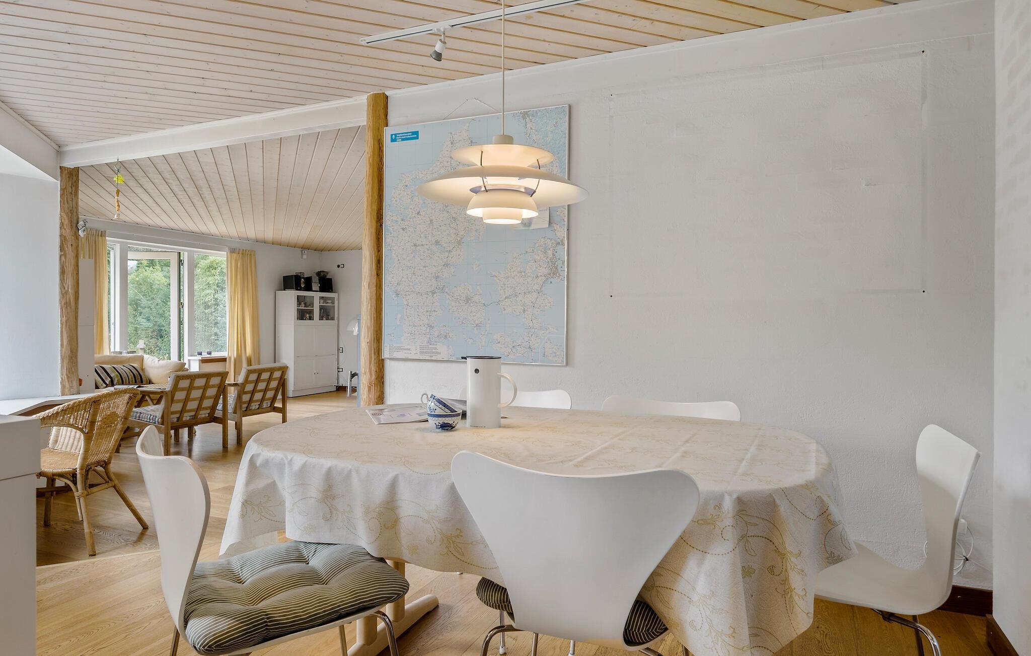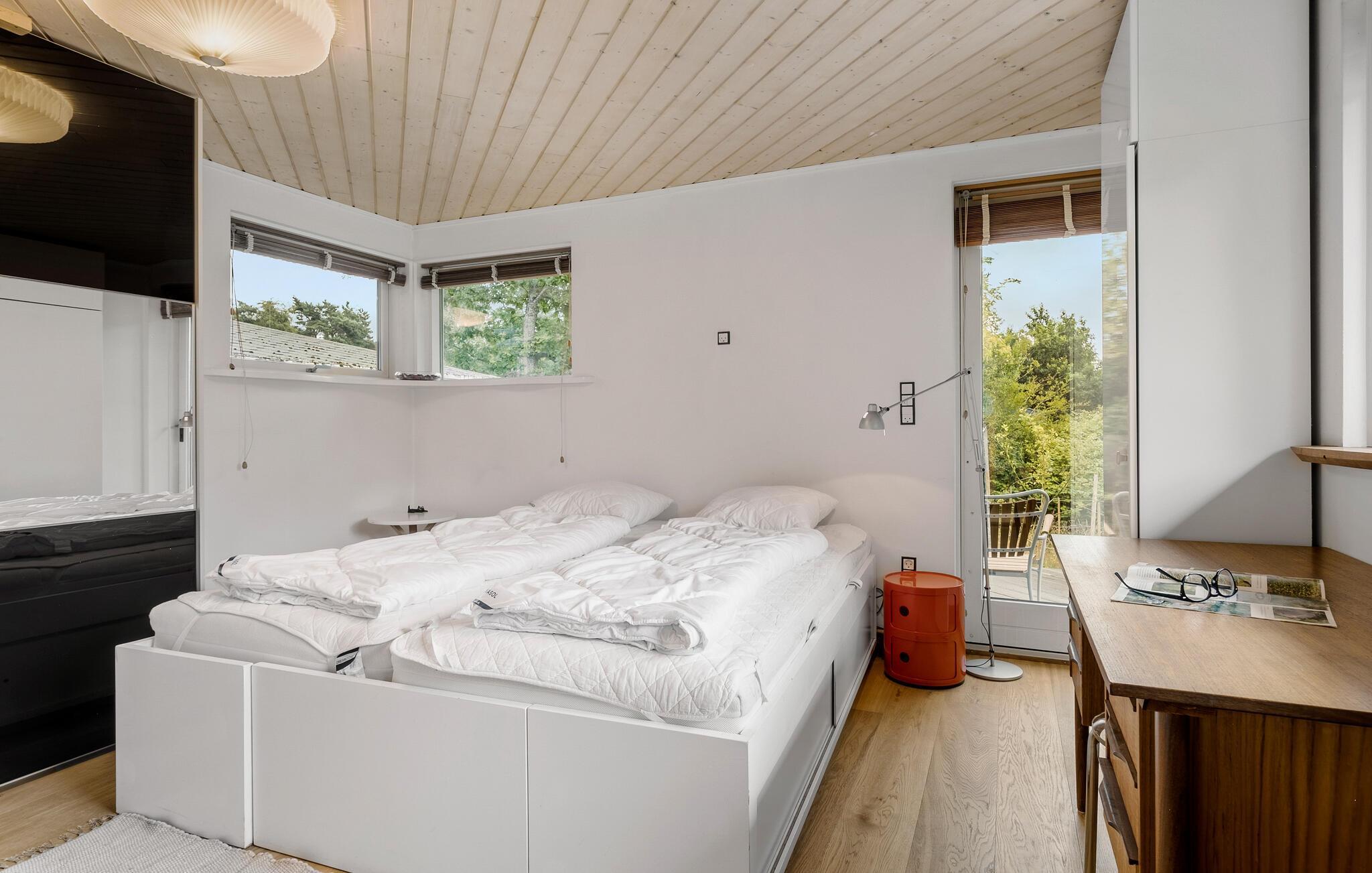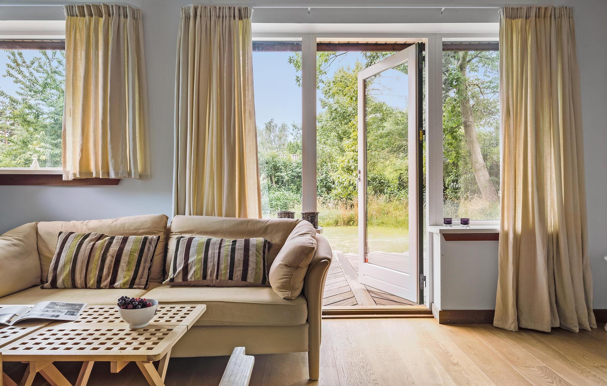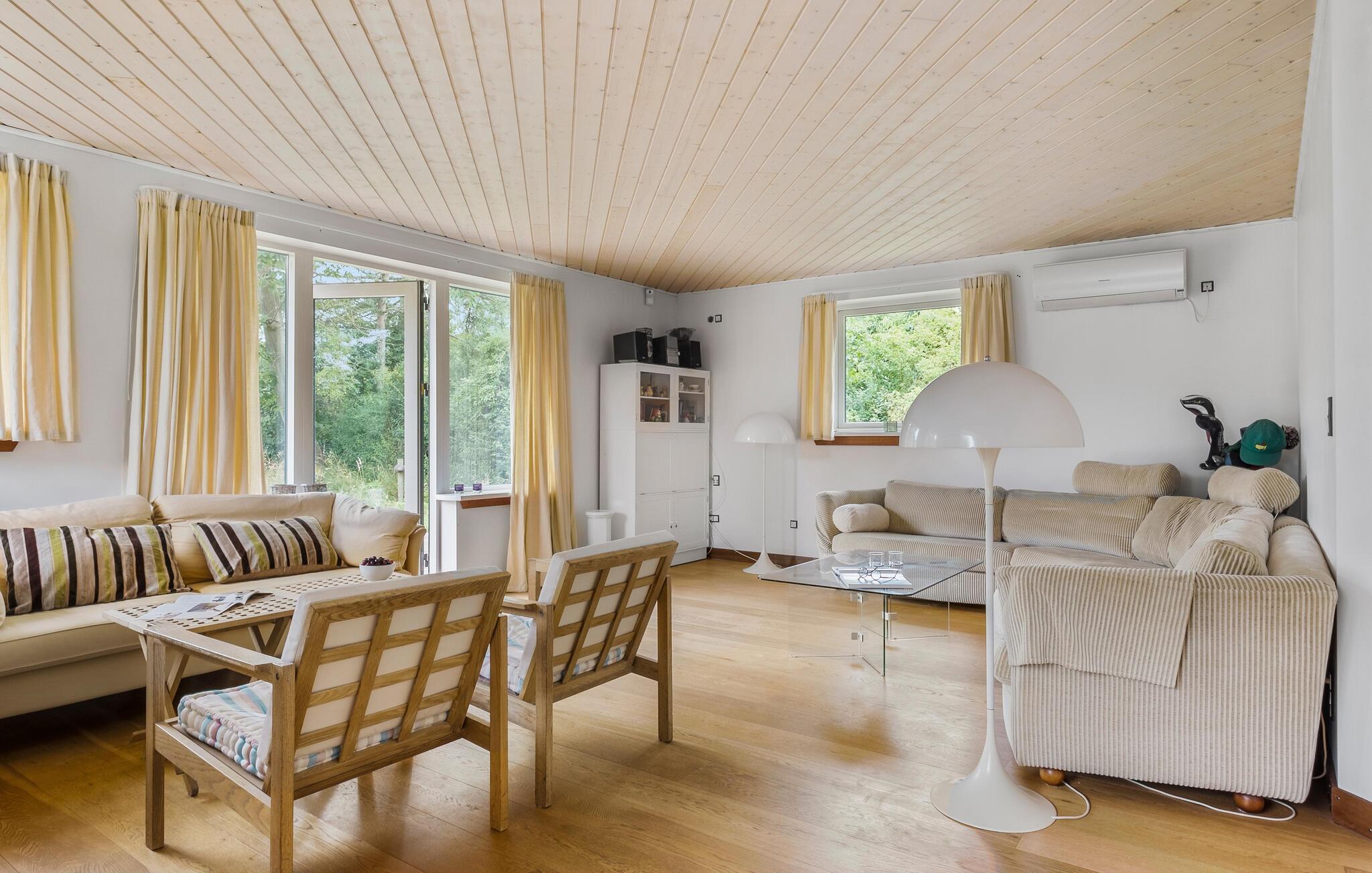 I dette hyggelige hus på Sjællands nordkyst kan I tilbringe en dejlig ferie og genoplade batterierne. Naturligt lys strømmer ind gennem de store vinduer og skaber en hyggelig atmosfære sammen med de varme træelementer, mens dristige farvenuancer fuldender udseendet. Slap af, mens I læser eller lytter til musik, og nyd lækre måltider sammen.