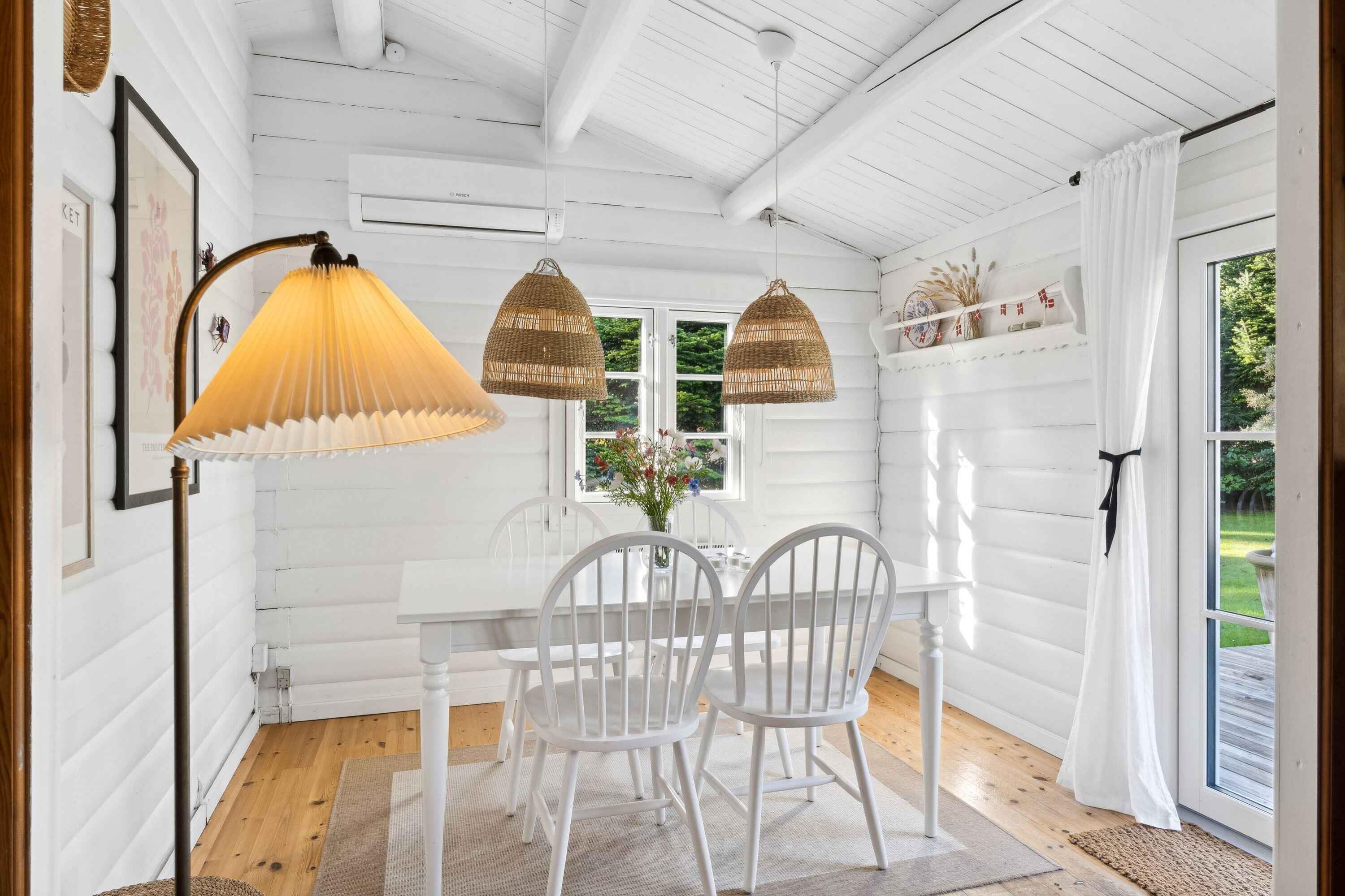 Dette charmerende bjælkehus på 95 m² er ideelt for større familier eller vennegrupper med fem soveværelser og ni sovepladser. Huset er indrettet med sans for detaljen og har en hyggelig atmosfære. Med småsprossede vinduer og en hyggelig pejs kan du opleve ægte dansk “hygge.” Udenfor byder en stor træterrasse på solsenge, overdækket siddeområde og grill. Nyd solen hele dagen, fra morgenkaffen til de sene aftentimer. Indendørs findes en rummelig stue med brændeovn og internetforbindelse. Køkkenet er veludstyret, og med husets varmepumpe er det nemt at holde behagelig temperatur året rundt. Udendørs kan du nyde den dejlige terrasse og en forfriskende udendørs bruser med varmt og koldt vand. Her er rig mulighed for at nyde måltider i det fri eller slappe af i rolige omgivelser. Der er også lader til elbil Kun 500 meter fra huset ligger stranden, hvor du kan tage en dukkert eller gå lange ture langs vandet. Naturen i området indbyder til udendørs aktiviteter året rundt. Huset ligger tæt på både strand og by. Her finder du restauranter, caféer og lokale butikker, som kan besøges efter en afslappende dag ved havet. Naturen omkring ferieboligen er frodig og indbyder til lange cykel- og vandreture. Dette er et oplagt sted for dem, der vil opleve både skov og kyst på samme ferie. Området byder desuden på spændende aktiviteter for hele familien, lige fra badeture til naturoplevelser og kulturelle udflugter. Oplev de lokale attraktioner, eller nyd roen og privatlivet i ferieboligen.