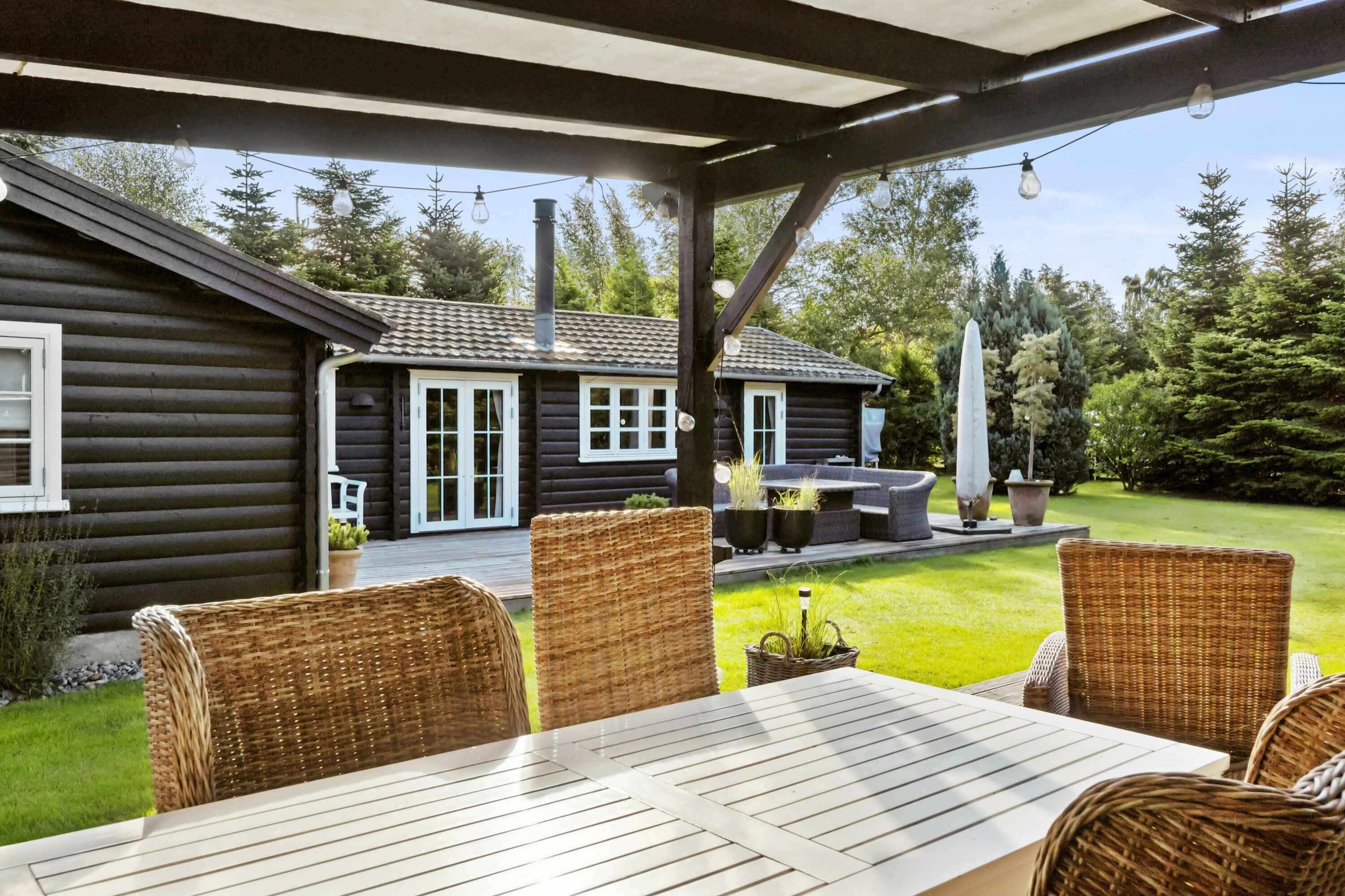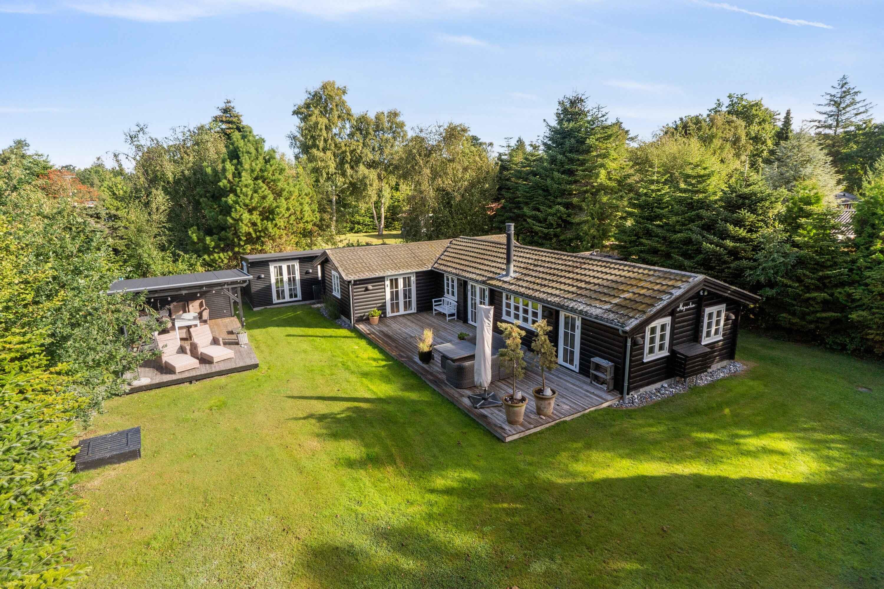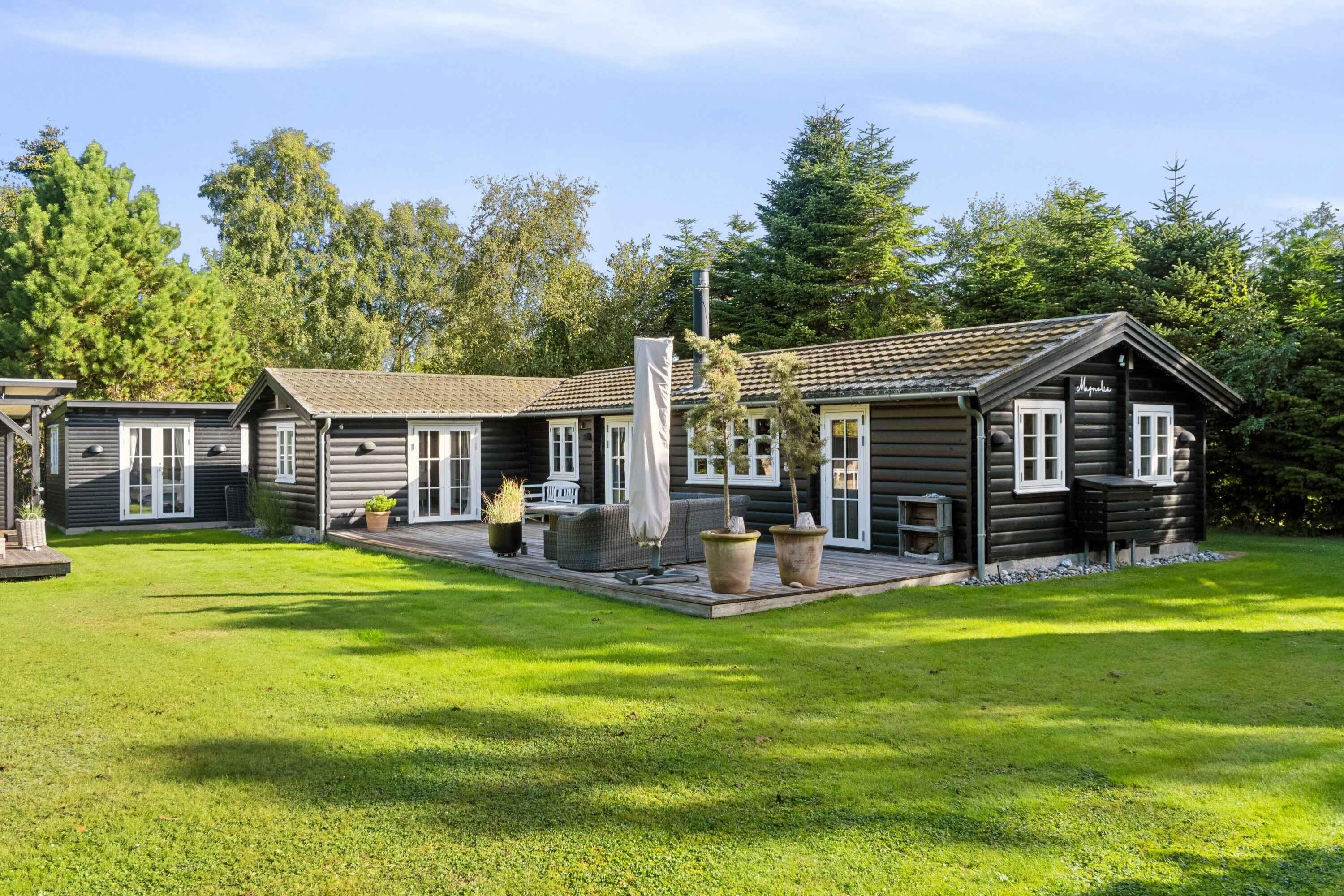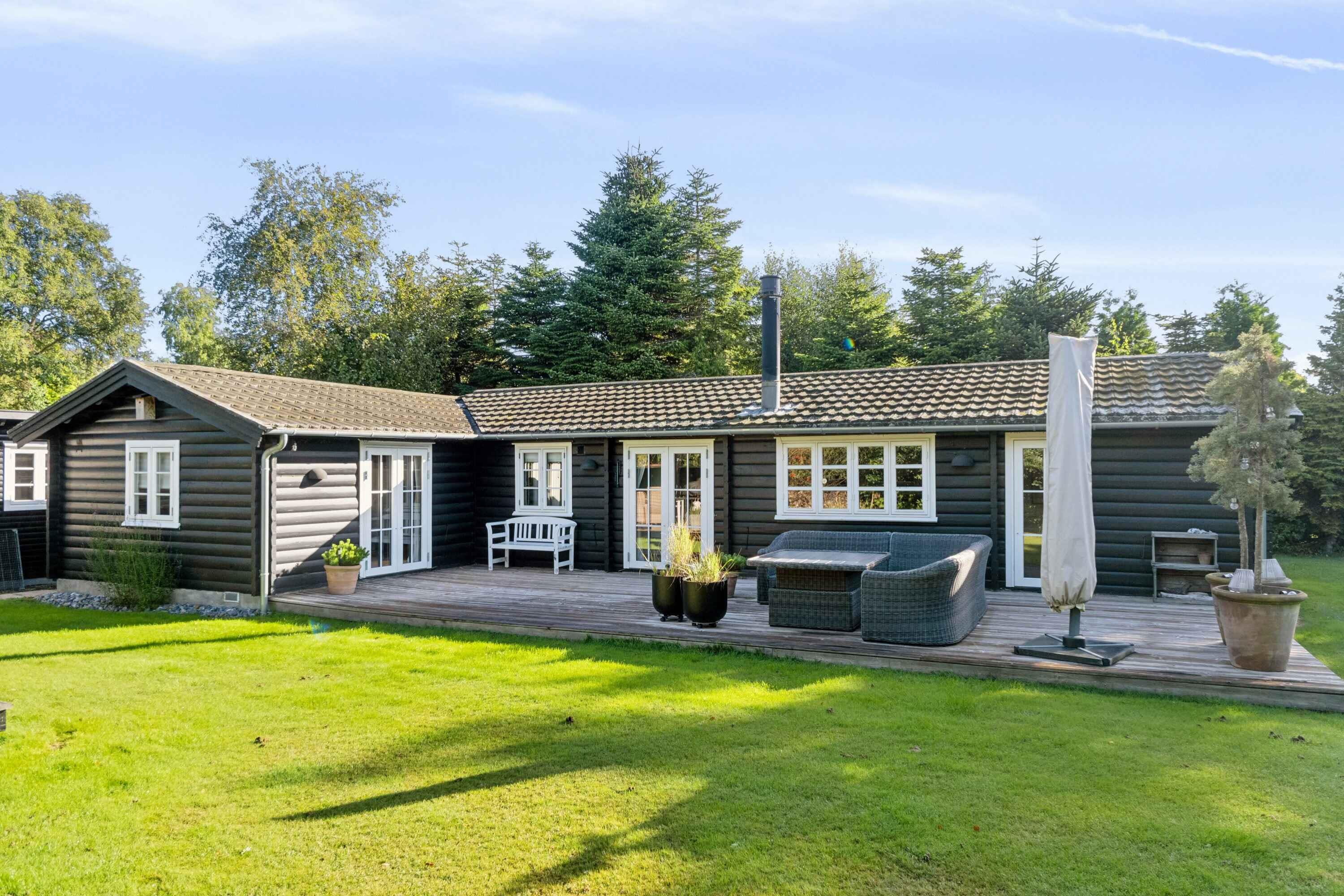 Charmerende bjælkehus nær stranden med moderne faciliteter, stor terrasse og plads til hele familien.