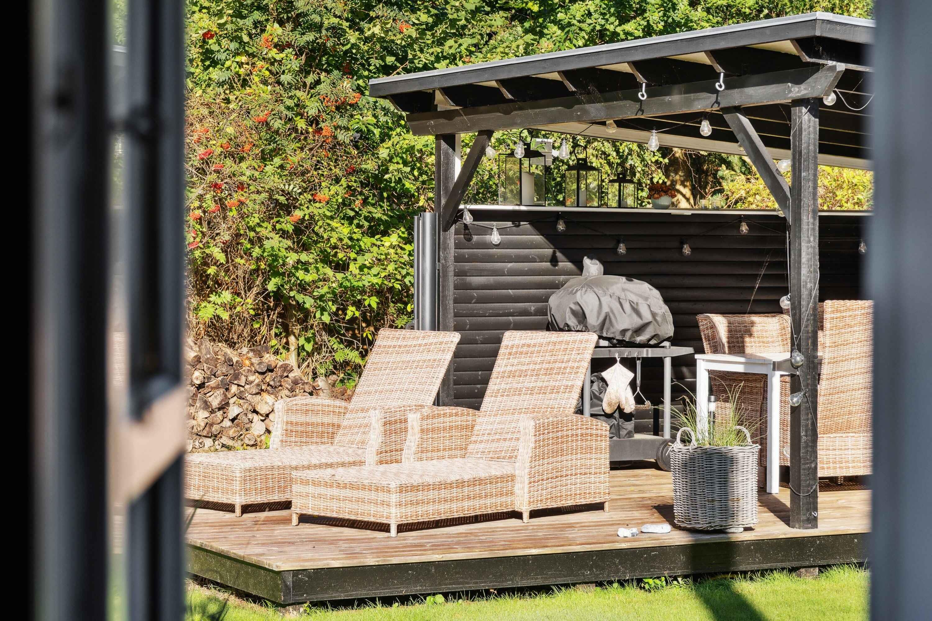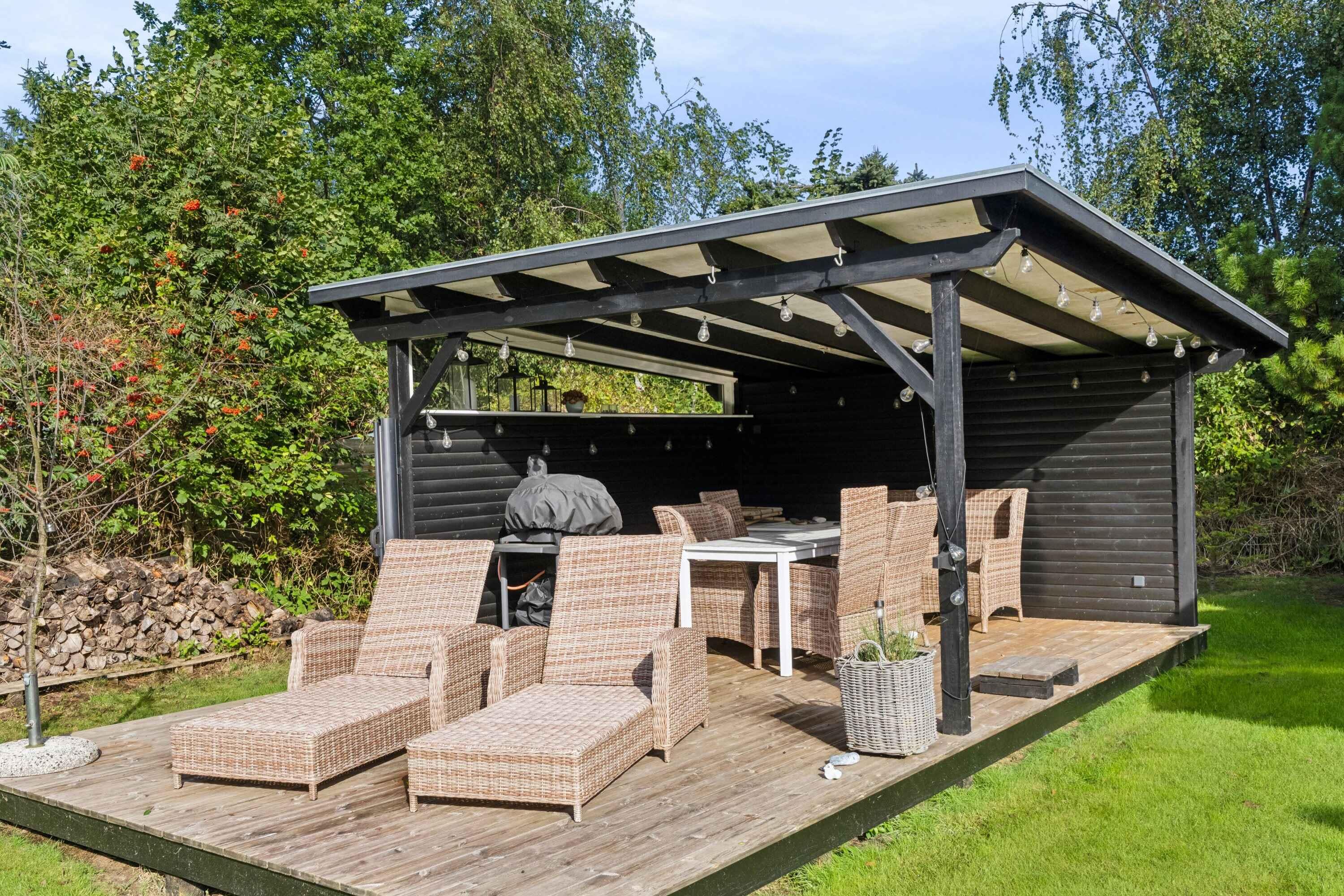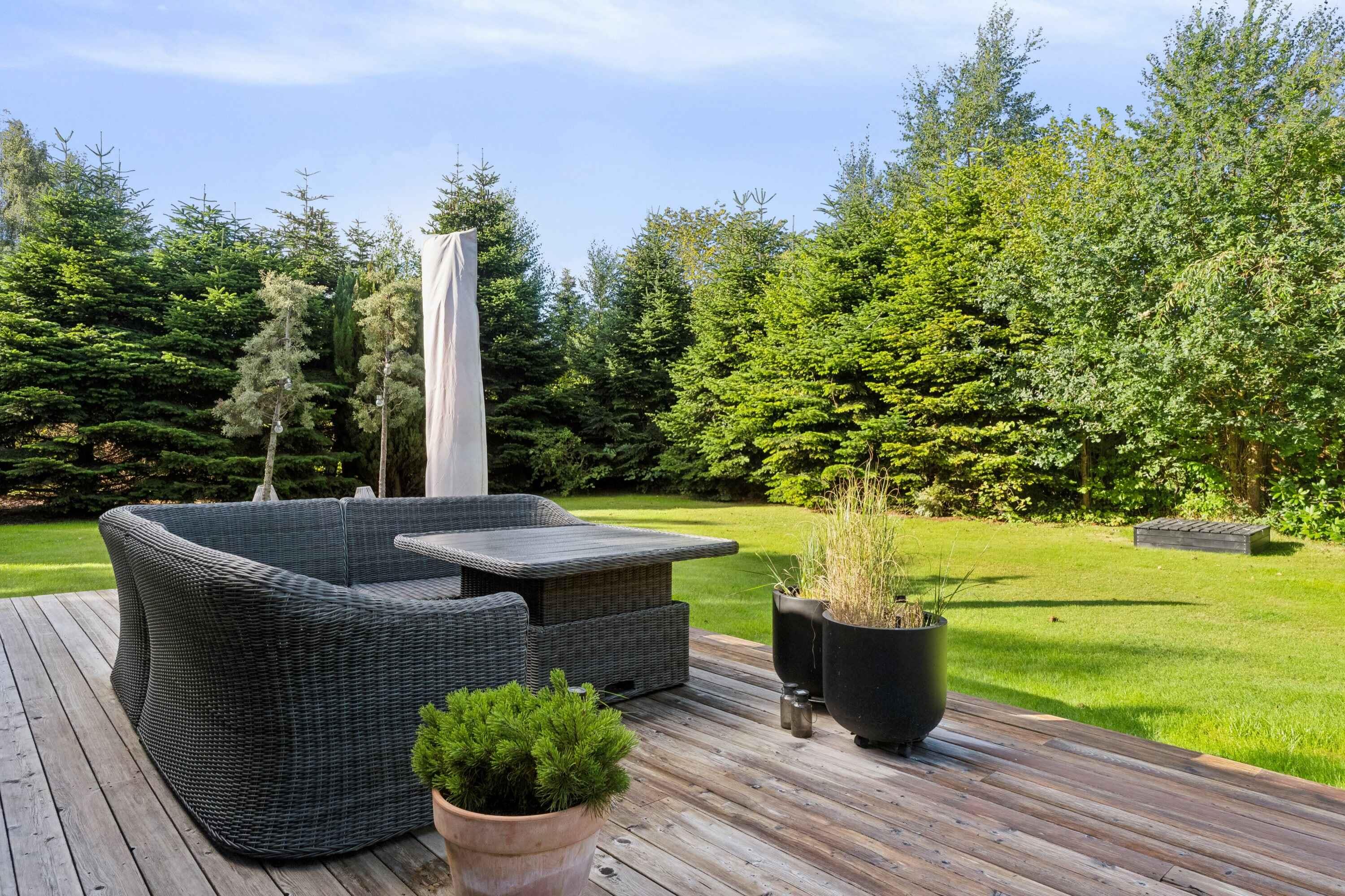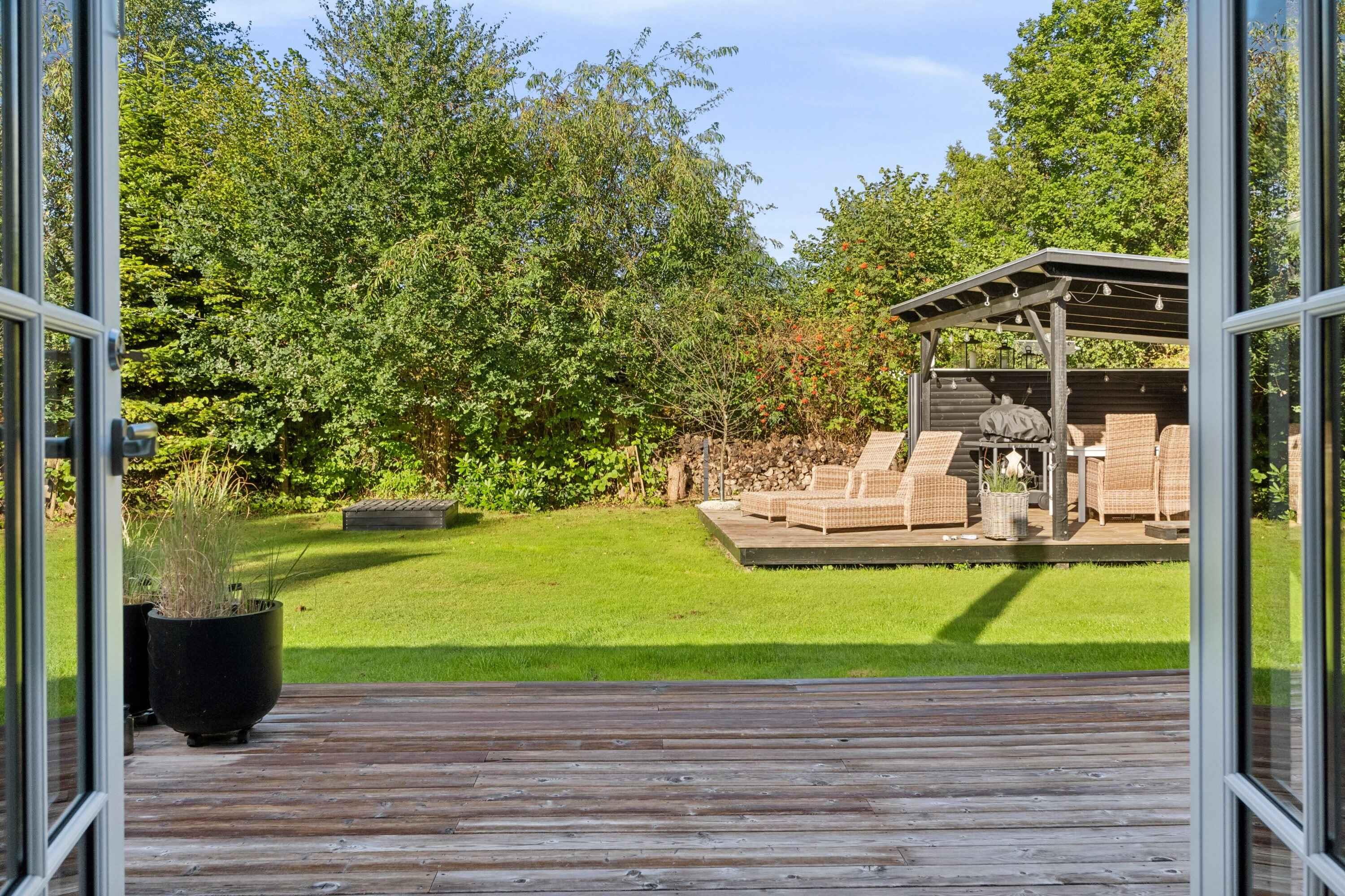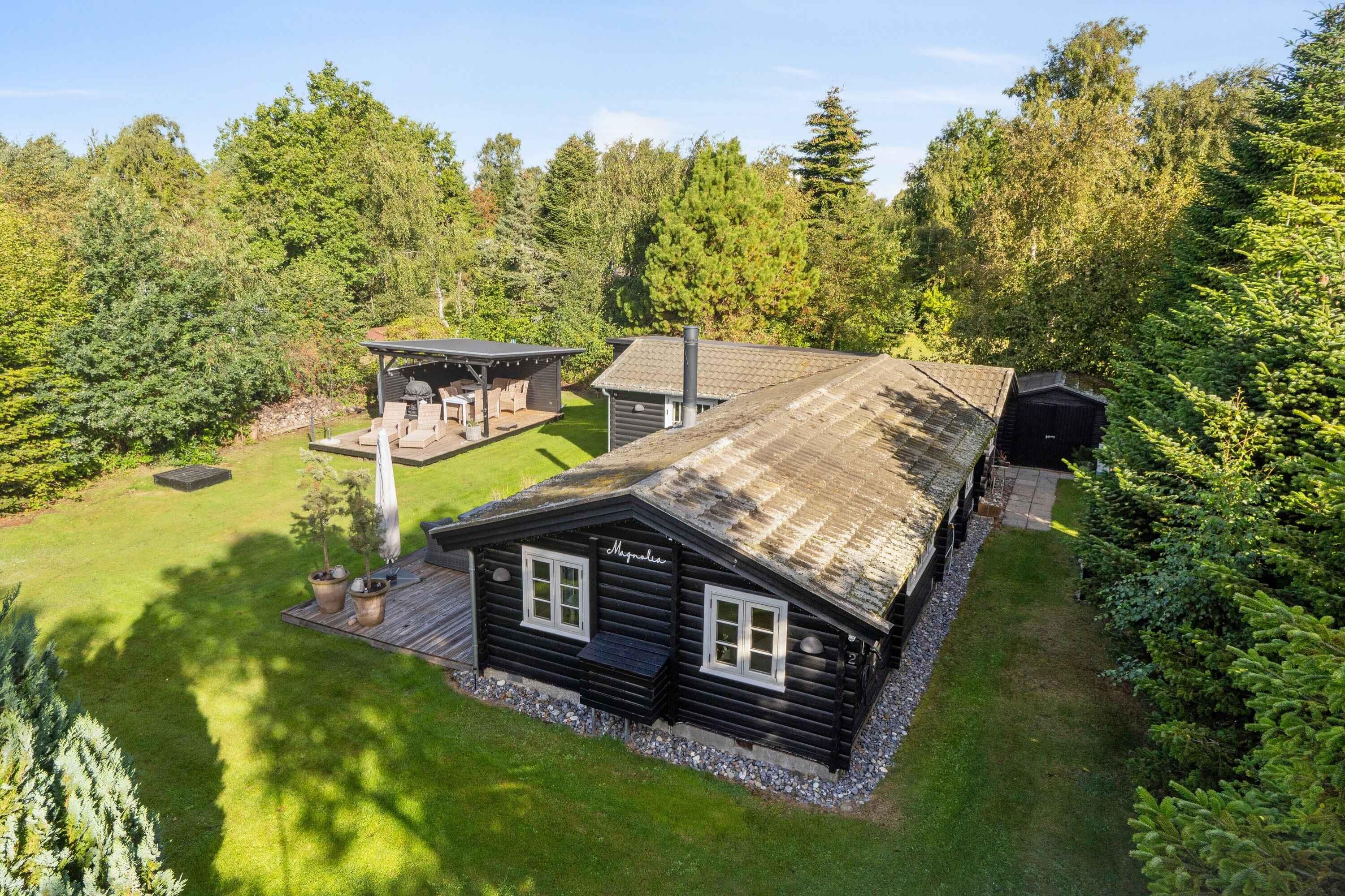 Charmerende bjælkehus nær stranden med moderne faciliteter, stor terrasse og plads til hele familien.