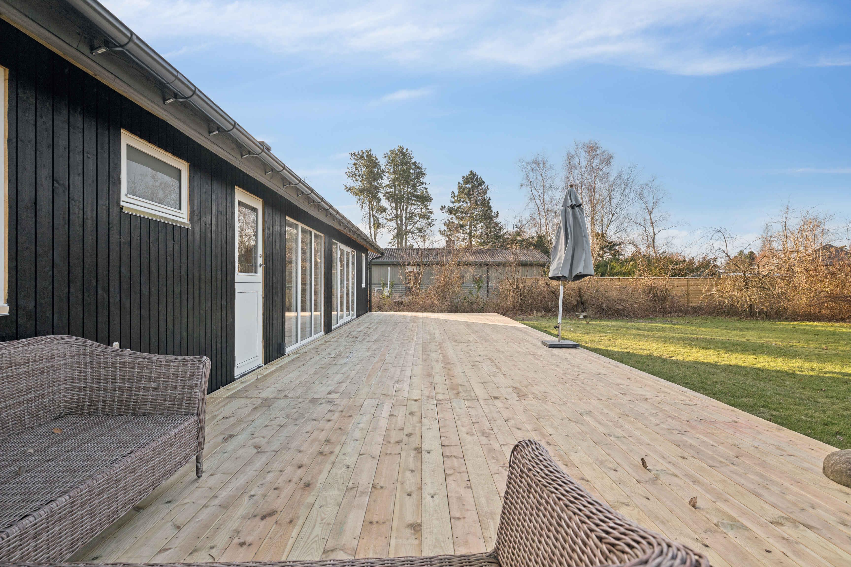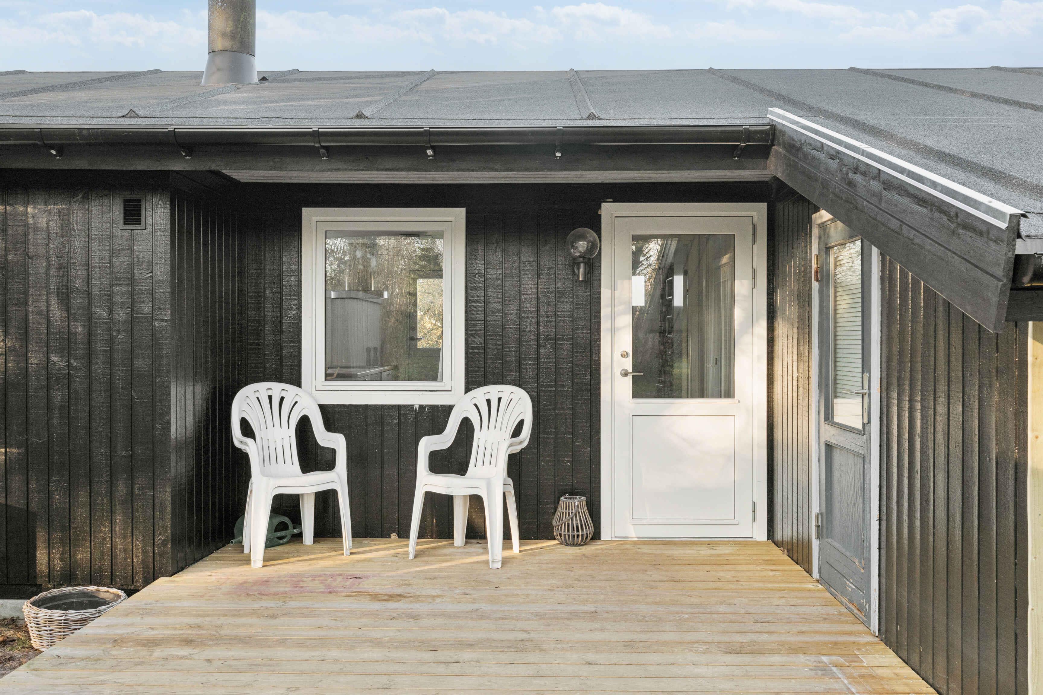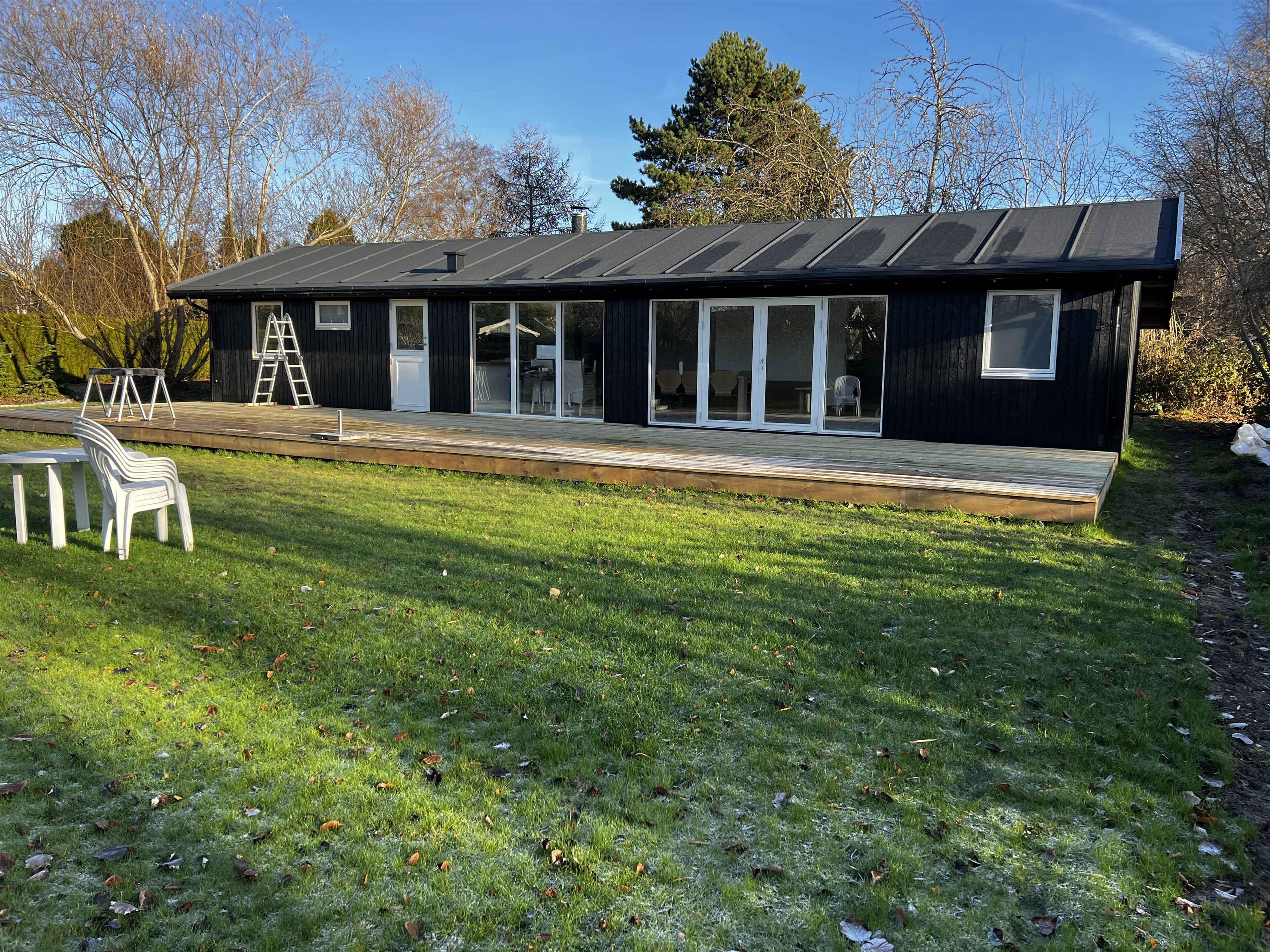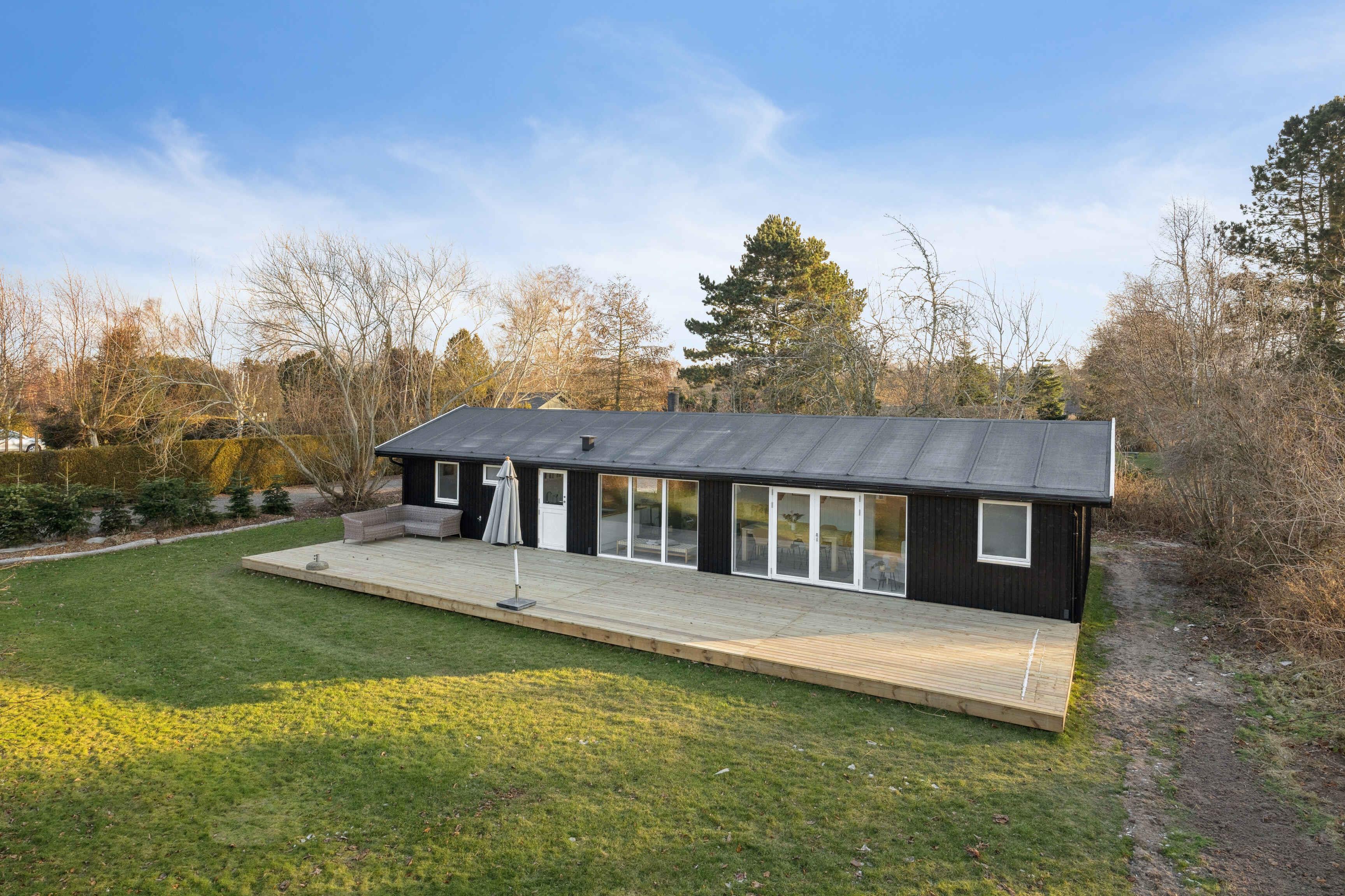 Lyst sommerhus med solrig terrasse og bålsted