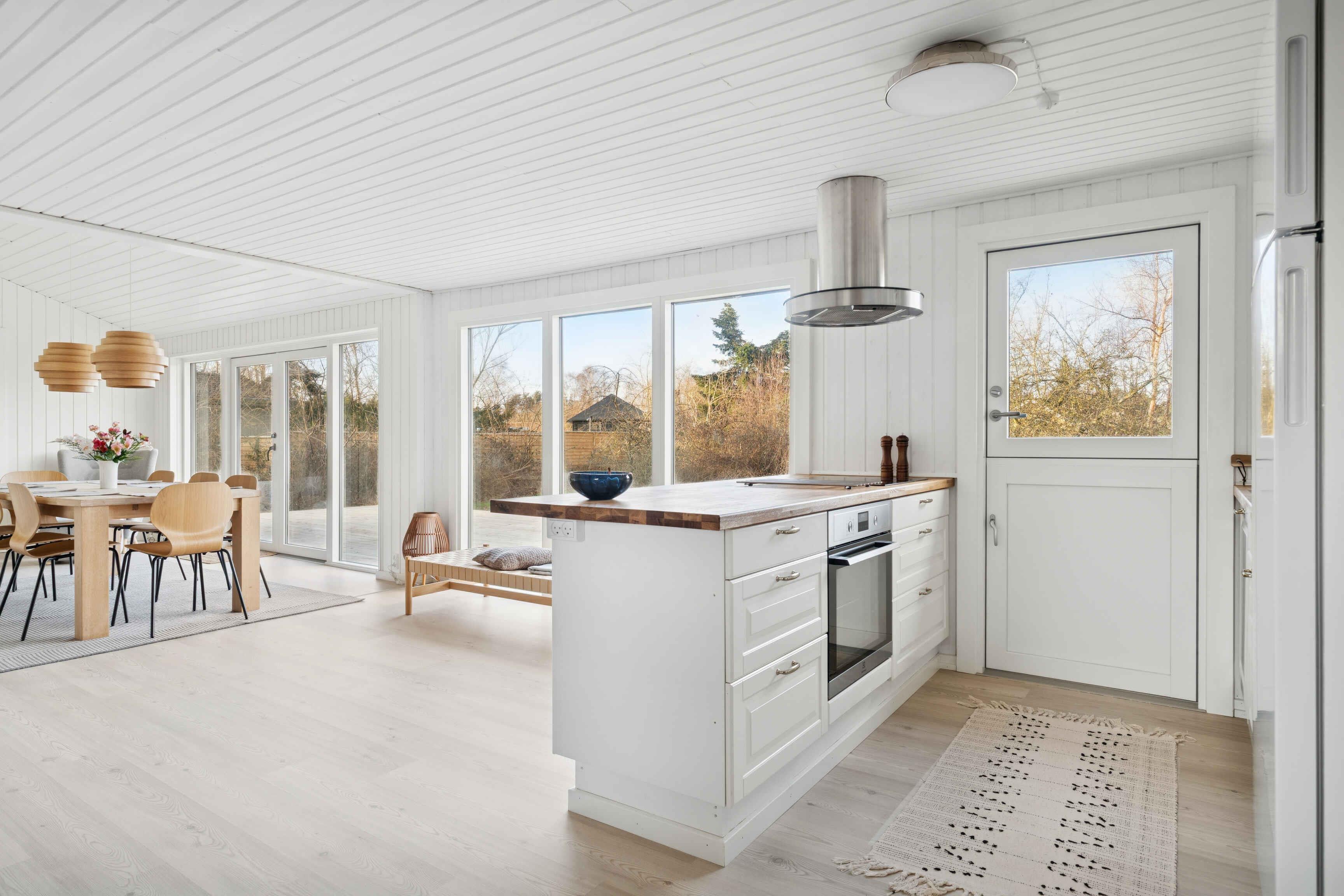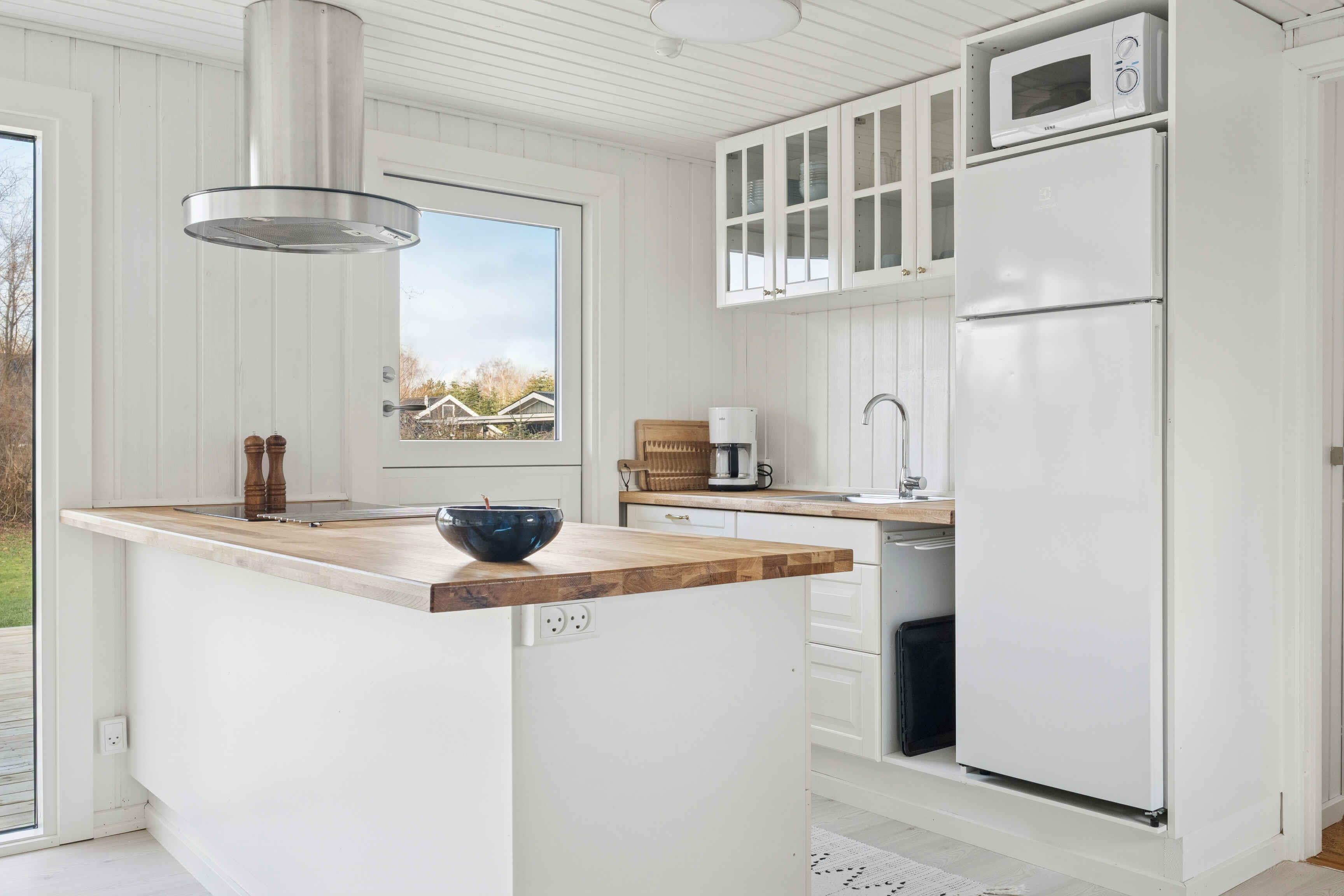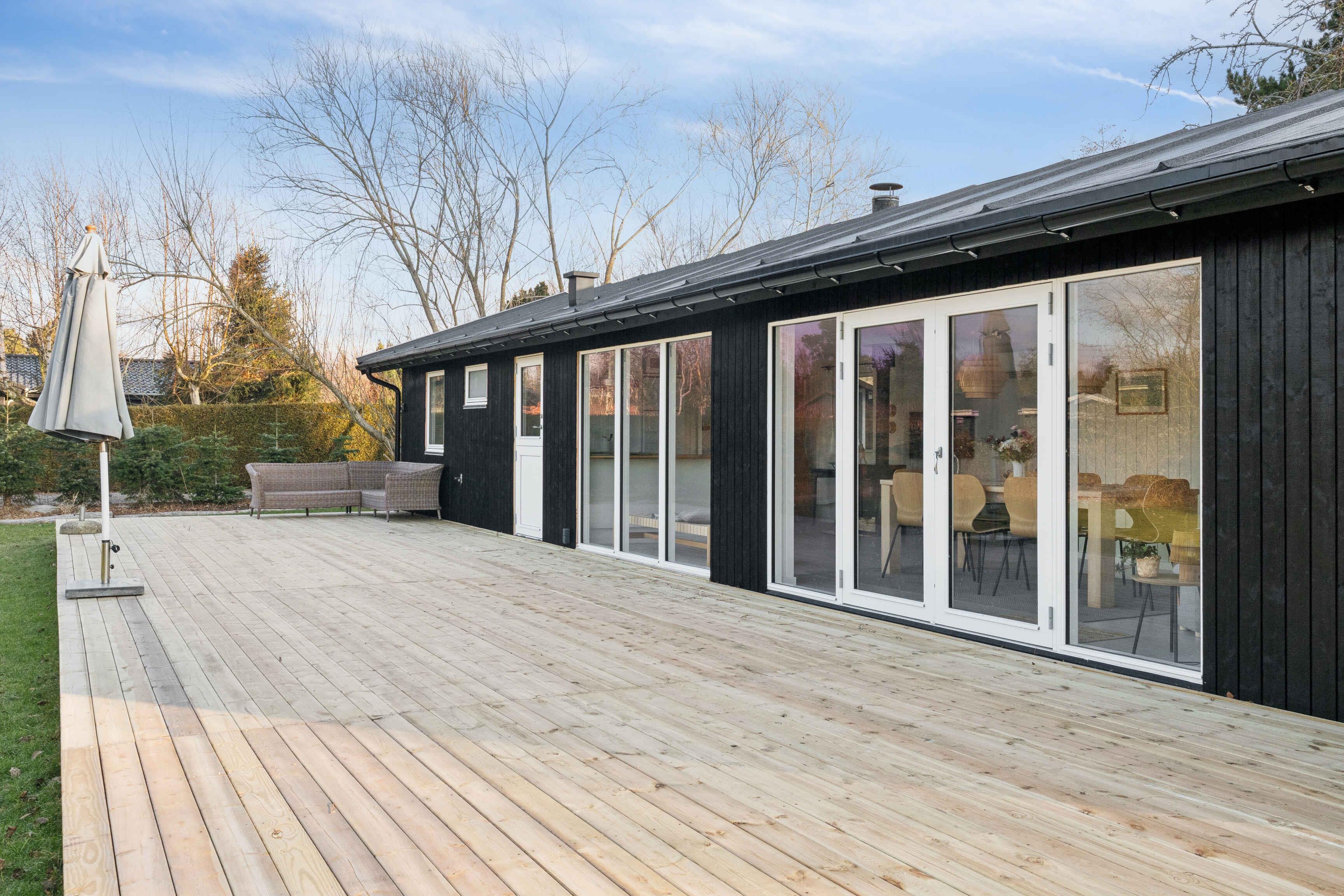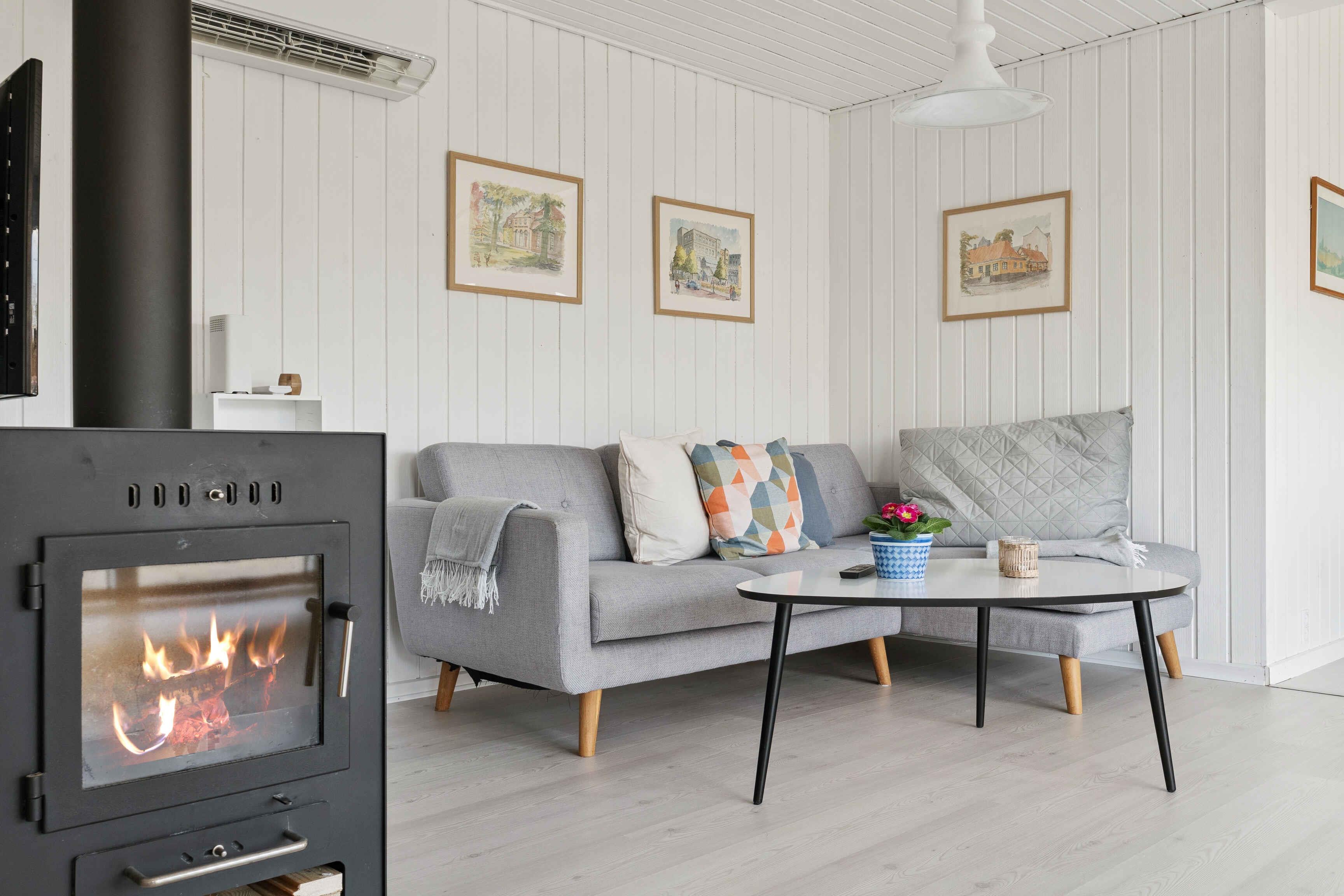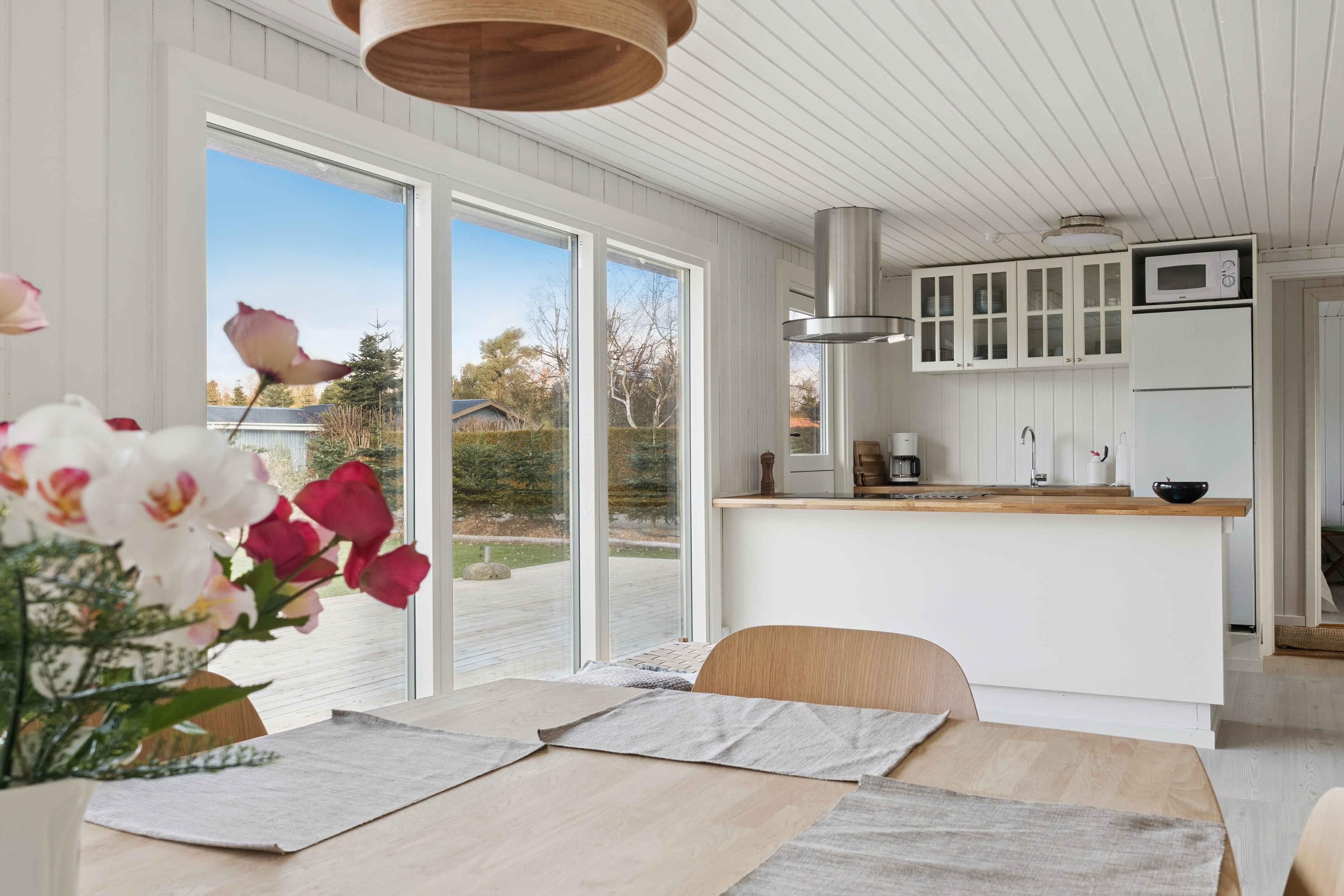 Lyst sommerhus med solrig terrasse og bålsted