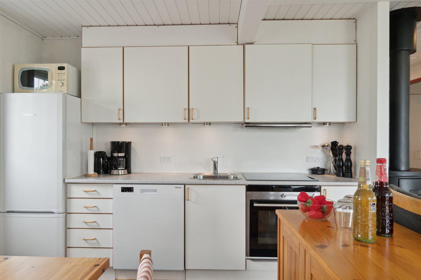 Køkkenet er udstyret med 1 køleskab. Der er 4 elkogeplader, varmluftovn, mikrobølgeovn samt opvaskemaskine.