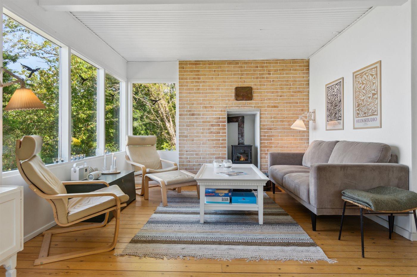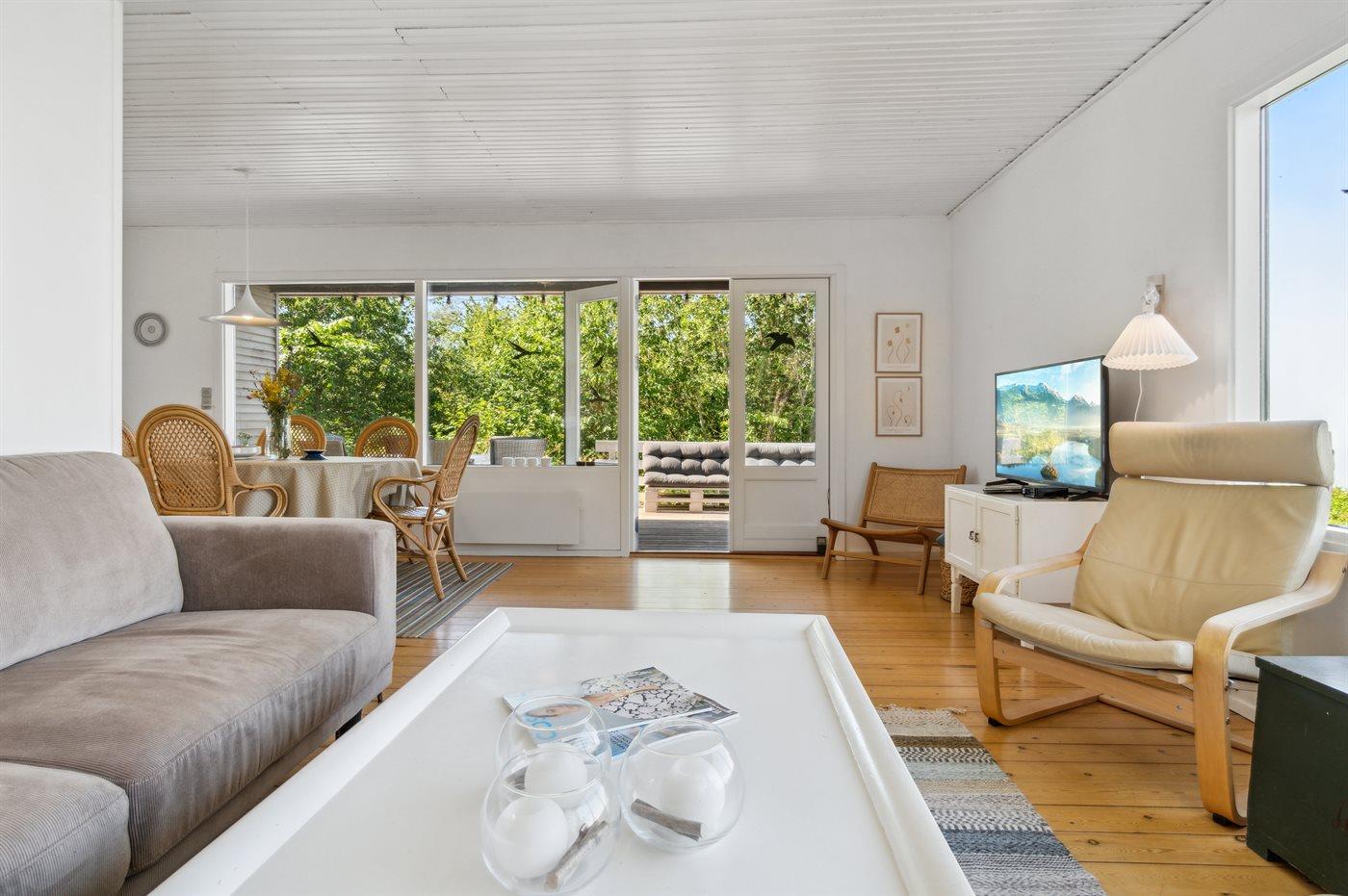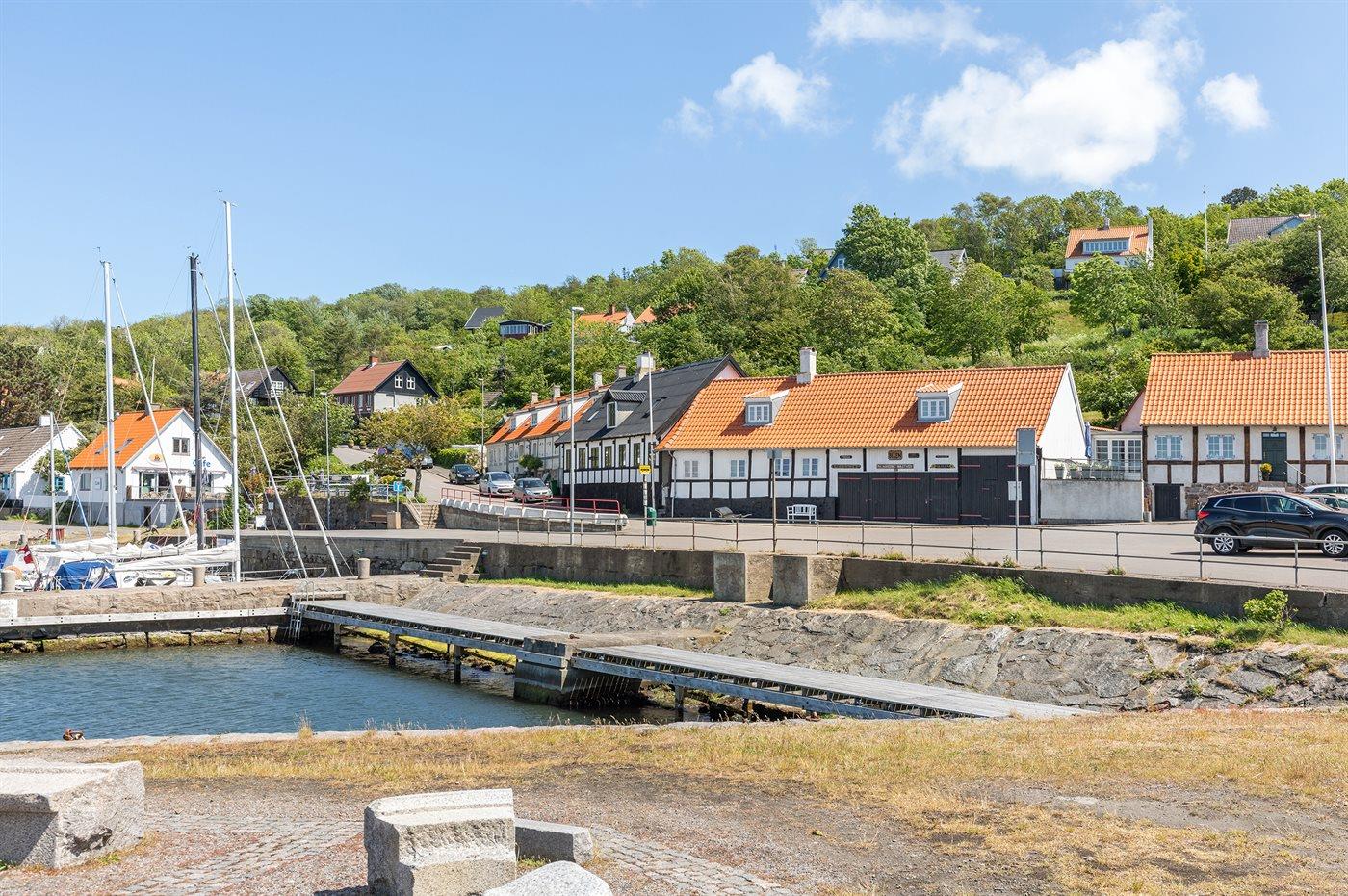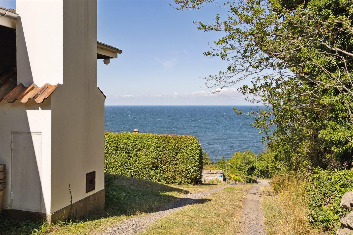 Højt beliggende med den fineste udsigt ned over det lille fiskerleje Vang og udover Østersøen - i klart vejr ses den svenske kyst. Den overdækkede terrasse indbyder til, at man følger naturens gang og solen vandring henover himmelen fra tidlig morgen til sen aften. Sommerhuset ligger for enden af en relativ stejl tilkørselsvej.