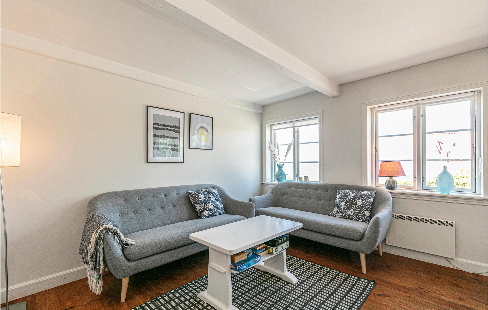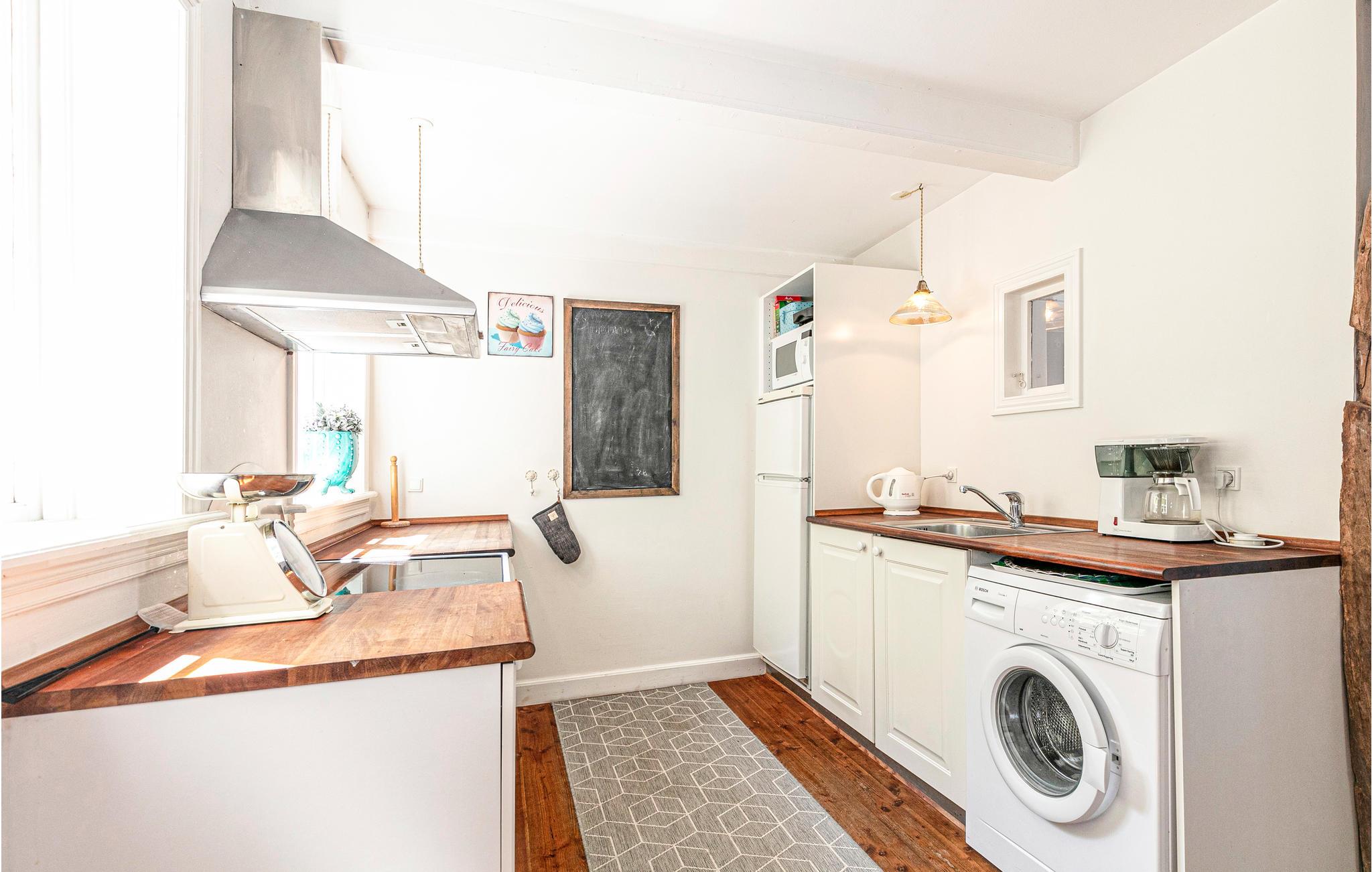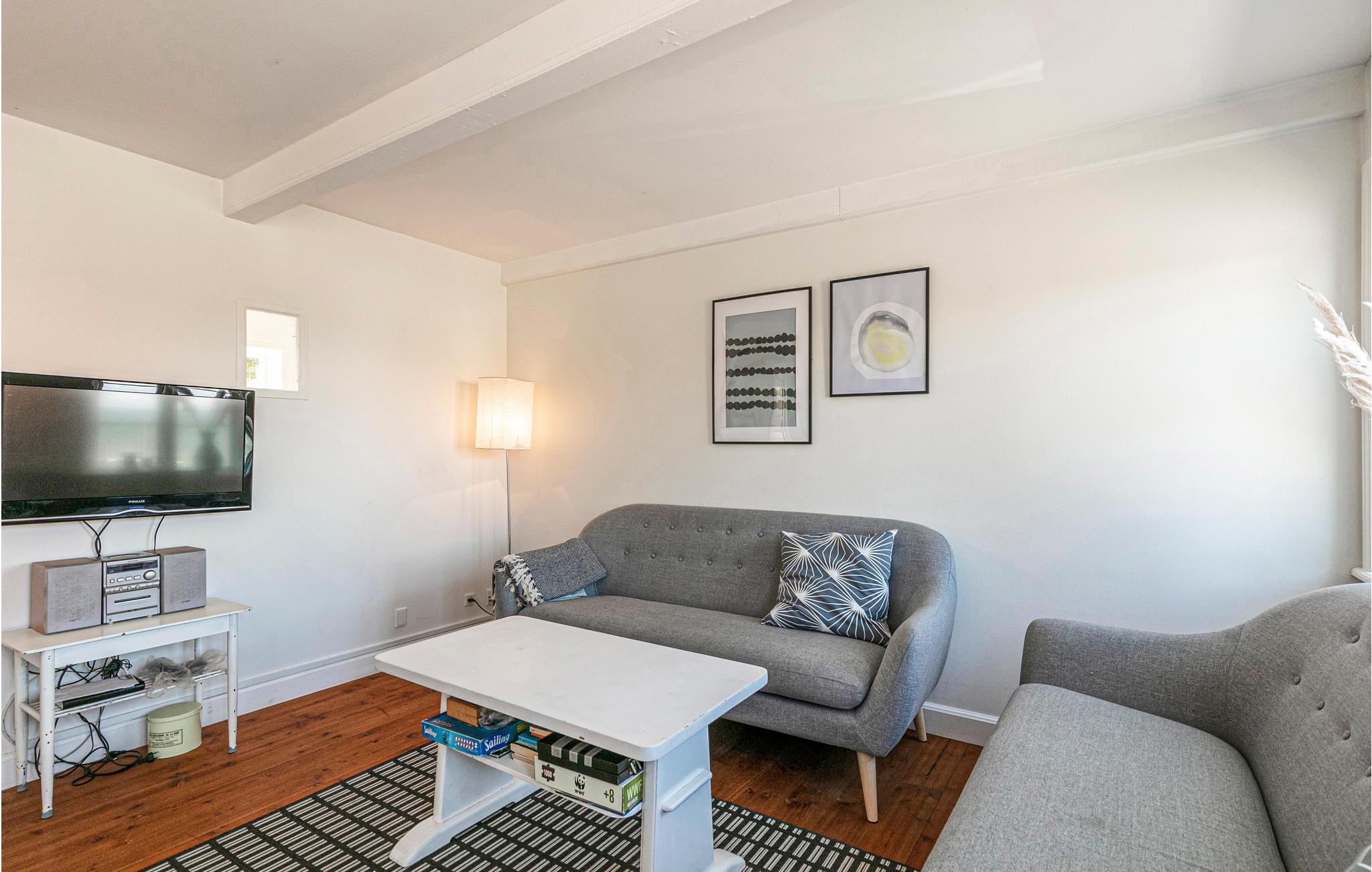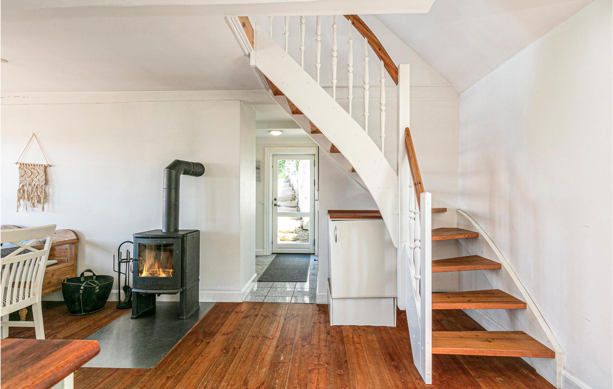 Charmerende rækkehus i to plan. Det er nydeligt indrettet med klassiske møbler og synlige loftsbjælker samt en brændeovn, der bidrager til en hyggelig stemning i huset. Fra huet kan I nyde den skønne panoramaudsigt over Østersøen og en hyggelig småbådehavn i Vang. De to soveværelser på overetagen har hyggelige skråvægge. Soveværelse 2 er uden dør. Der er kun 50 m til fiskemulighed og 5 km til stranden, hvor I kan bade. 5 km til Allinge.