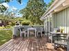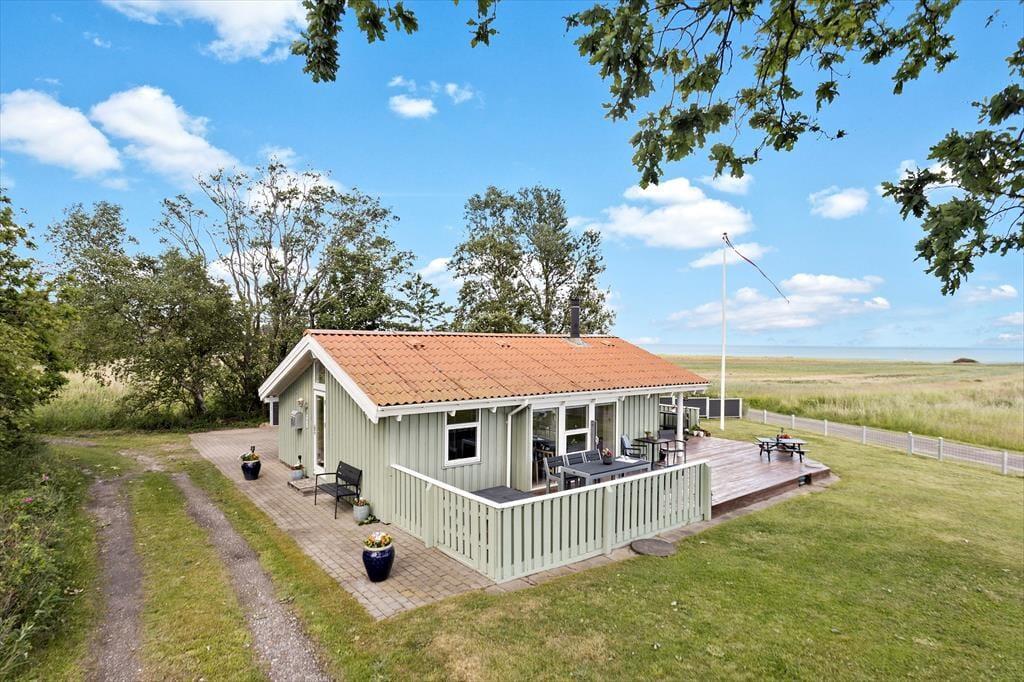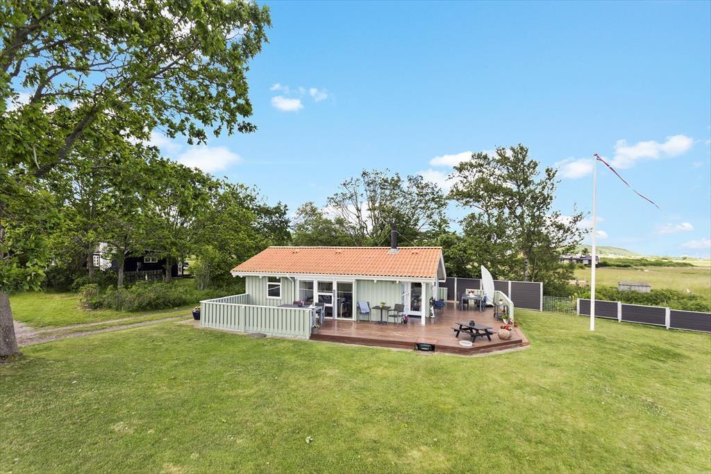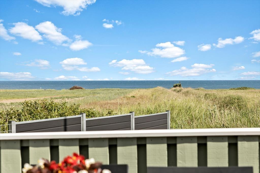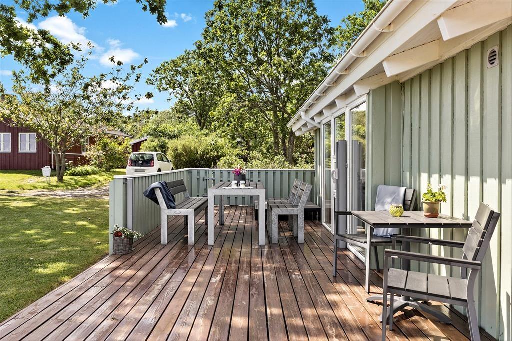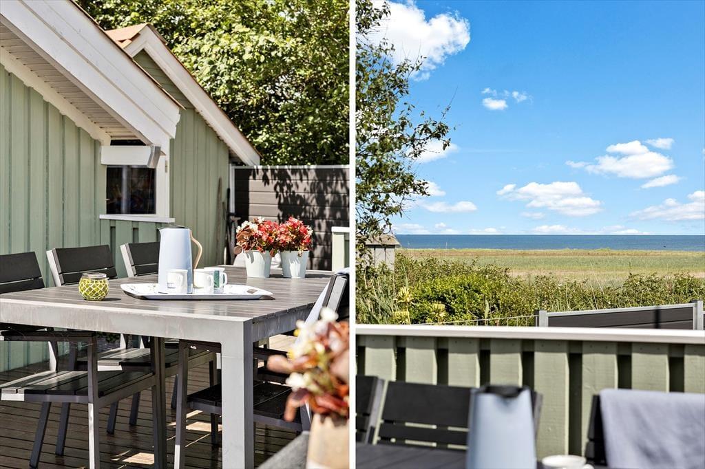 Den store træterrasse er sommerhusets hjerte udendørs. Her kan du sidde i de komfortable havemøbler og nyde udsigten til Kattegat, mens du mærker den friske havluft. Morgenkaffen smager ekstra godt her, hvor solen rammer terrassen fra morgenstunden, og aftensmaden kan oplagt tilberedes på grillen, mens du nyder synet af bølgerne i baggrunden. Hvis børnene eller hunden trænger til at røre sig, er der rigeligt med plads til leg på græsset omkring huset, mens de voksne slapper af. De rolige omgivelser og den betagende udsigt skaber den perfekte ramme for afslappede feriedage tæt på naturen.