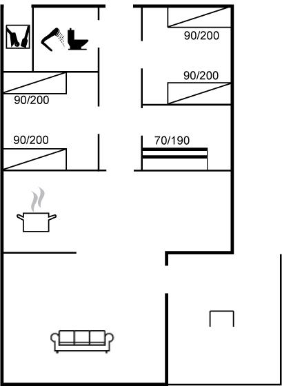 Der er i alt 3 soveværelser. Sovepladserne fordeler sig på: 4 sovepladser i enkeltsenge. 2 sovepladser i køjeseng.