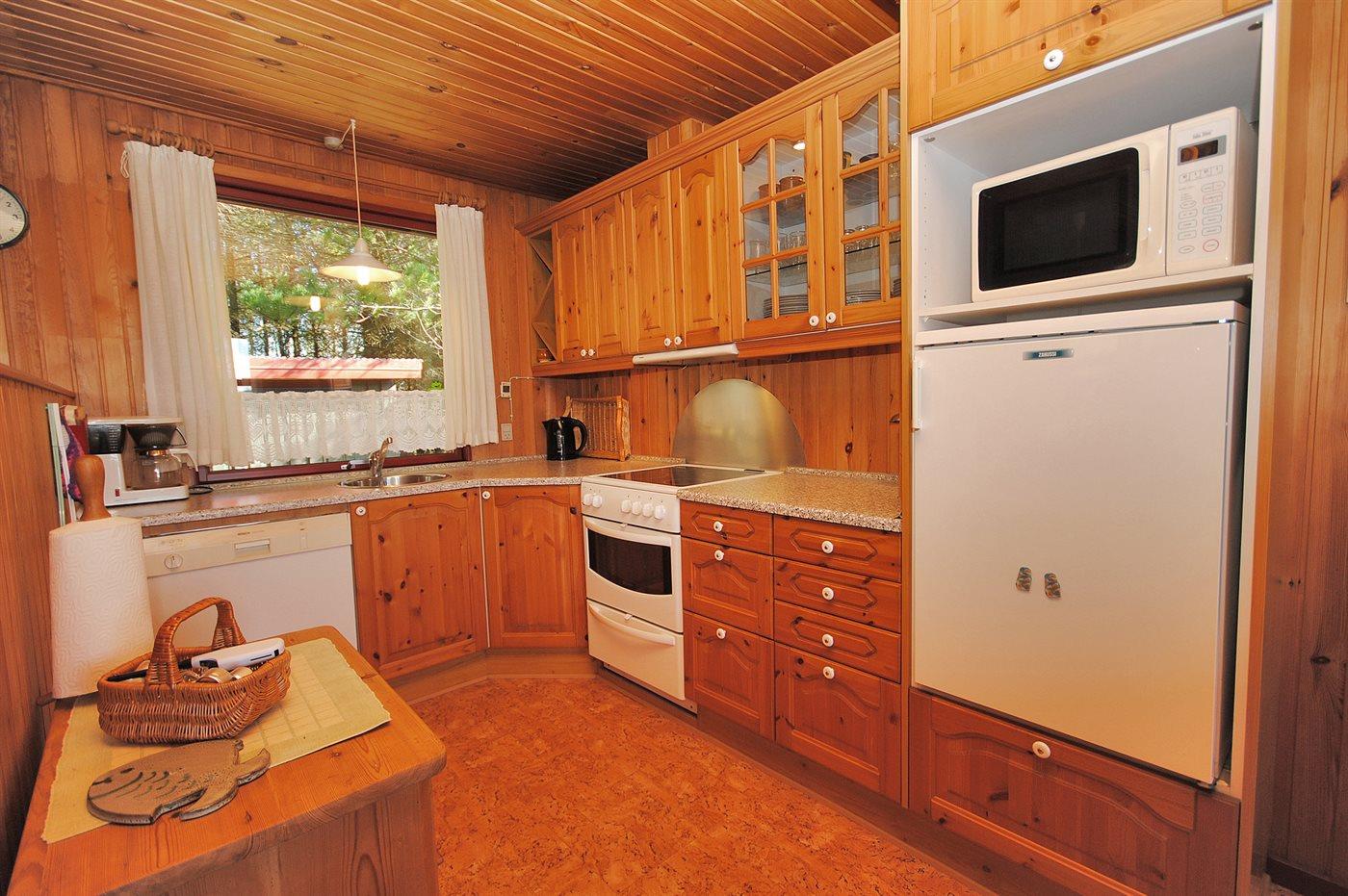 Køkkenet er udstyret med 1 køleskab. Der er 4 keramiske kogeplader, varmluftovn, mikrobølgeovn samt opvaskemaskine.