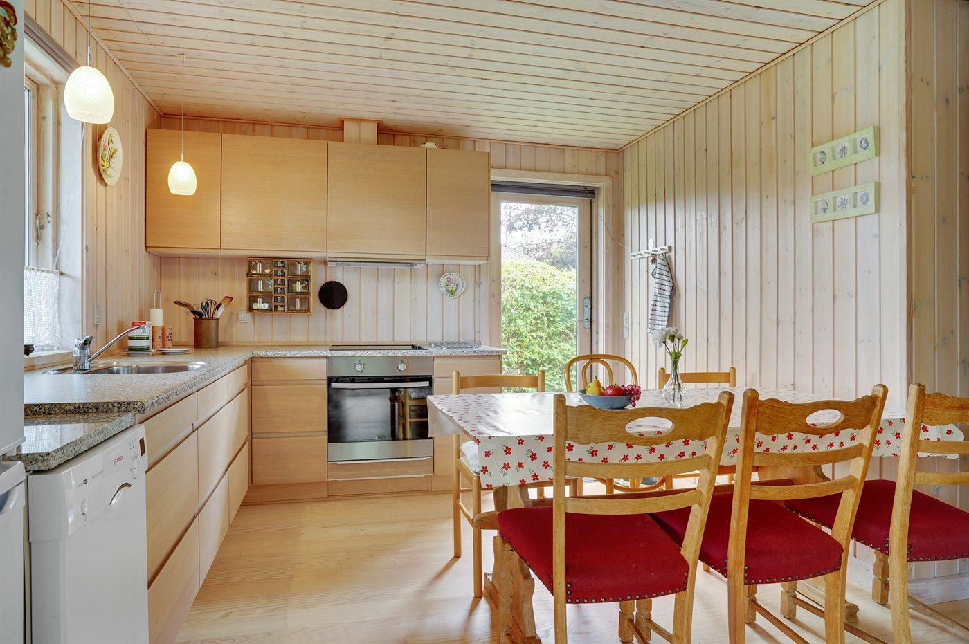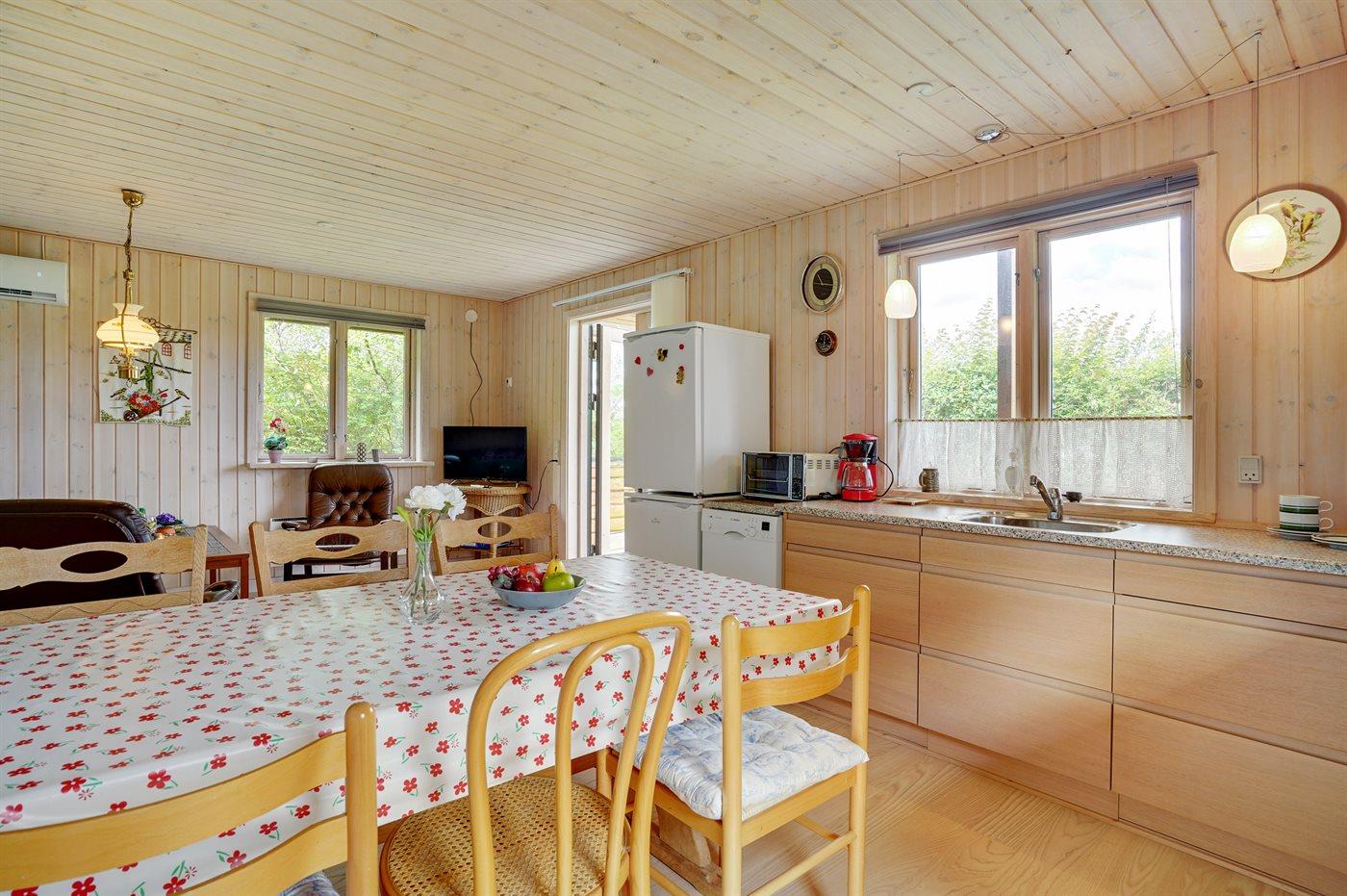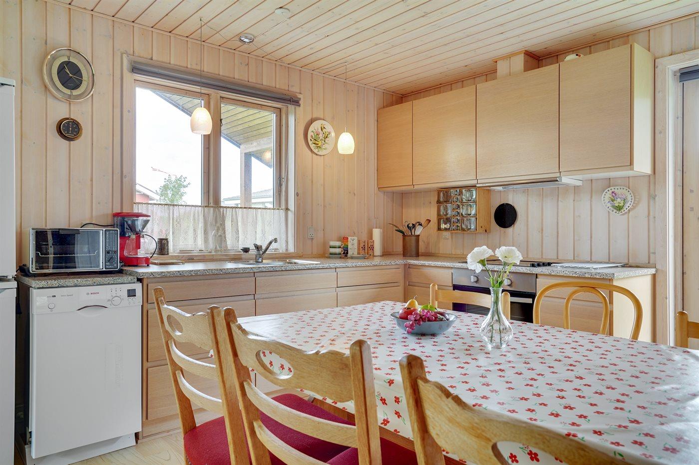Køkkenet er udstyret med 1 køleskab. Der er 4 keramiske kogeplader, miniovn, varmluftovn samt opvaskemaskine.