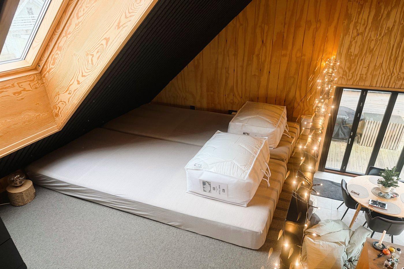Der er i alt 2 soveværelser. Sovepladserne fordeler sig på: 4 sovepladser i dobbeltsenge. 2 sovepladser i sovesofa (dobbelt). 2 sovepladser på madrasser. 2 af disse sovepladser befinder sig på husets hems, og 2 findes i stuen. Derudover er der 1 stk. barneseng.