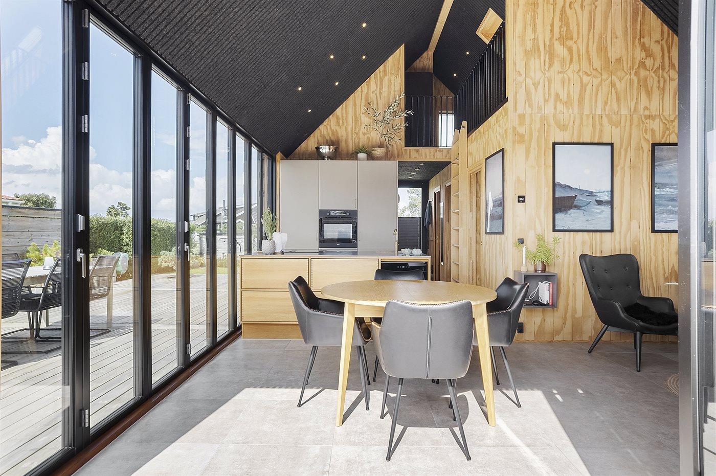 Moderne sommerhus fra 2022 nær Varbjerg Strand med stor terrasse og åben forbindelse til stue og køkken.