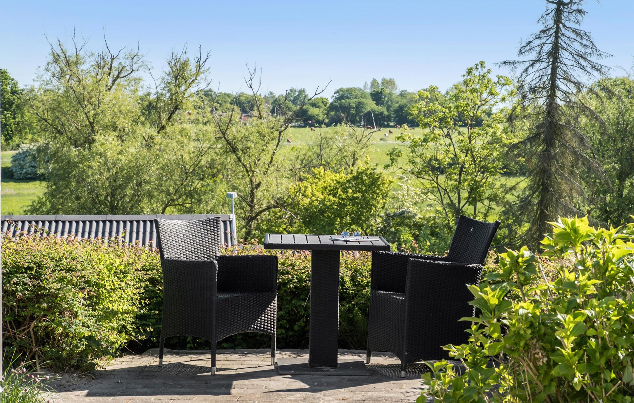 Der er flere terrasseområder rundt om huset. Find en god hyggekrog afhængigt af tidspunktet på dagen. Start med morgenmad i morgensolen eller nyd en middag under åben himmel med havudsigt. Den velholdte have er delvist omgivet af hæk, så I kan sidde dejligt ugeneret.