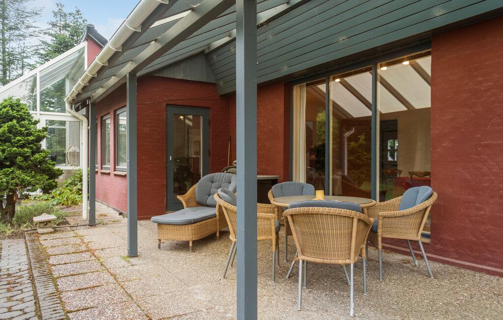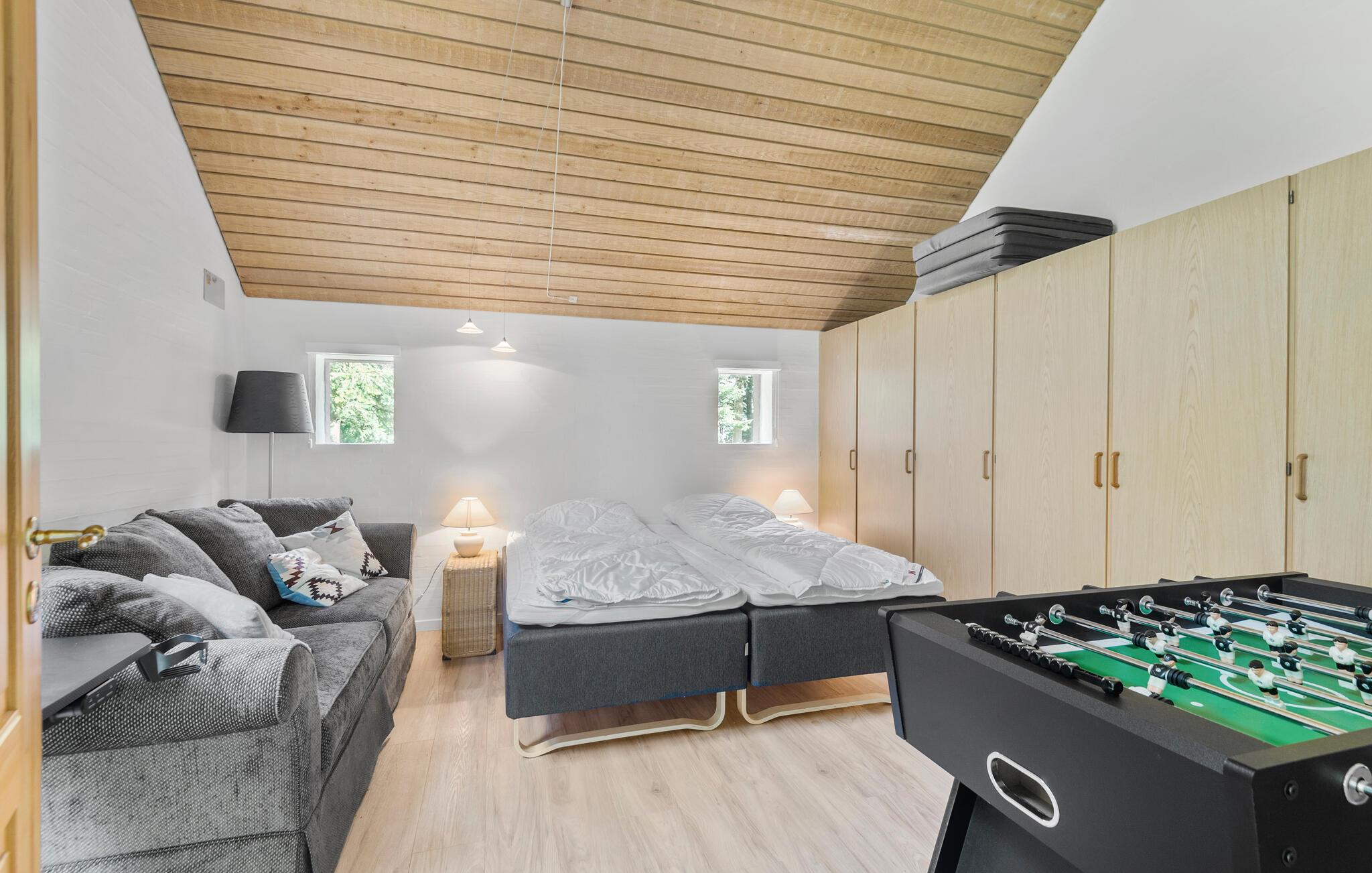 Dette sommerhus ligger på en stor grund, hvor I har en lille sø i haven, som skaber en idyllisk og hyggelig natur stemning, så snart I træder ud i haven. Indenfor er der lyst og stort, og plads til afslapning og sjove aktiviteter sammen. I kan lave mad sammen i det store spisekøkken, lave kreative aktiviteter om spisebordet, læse en god bog eller se næste afsnit af yndlingsserien i sofaen. Ved bordfodboldbordet kan I afgøre familiens feriemester i bordfodbold.