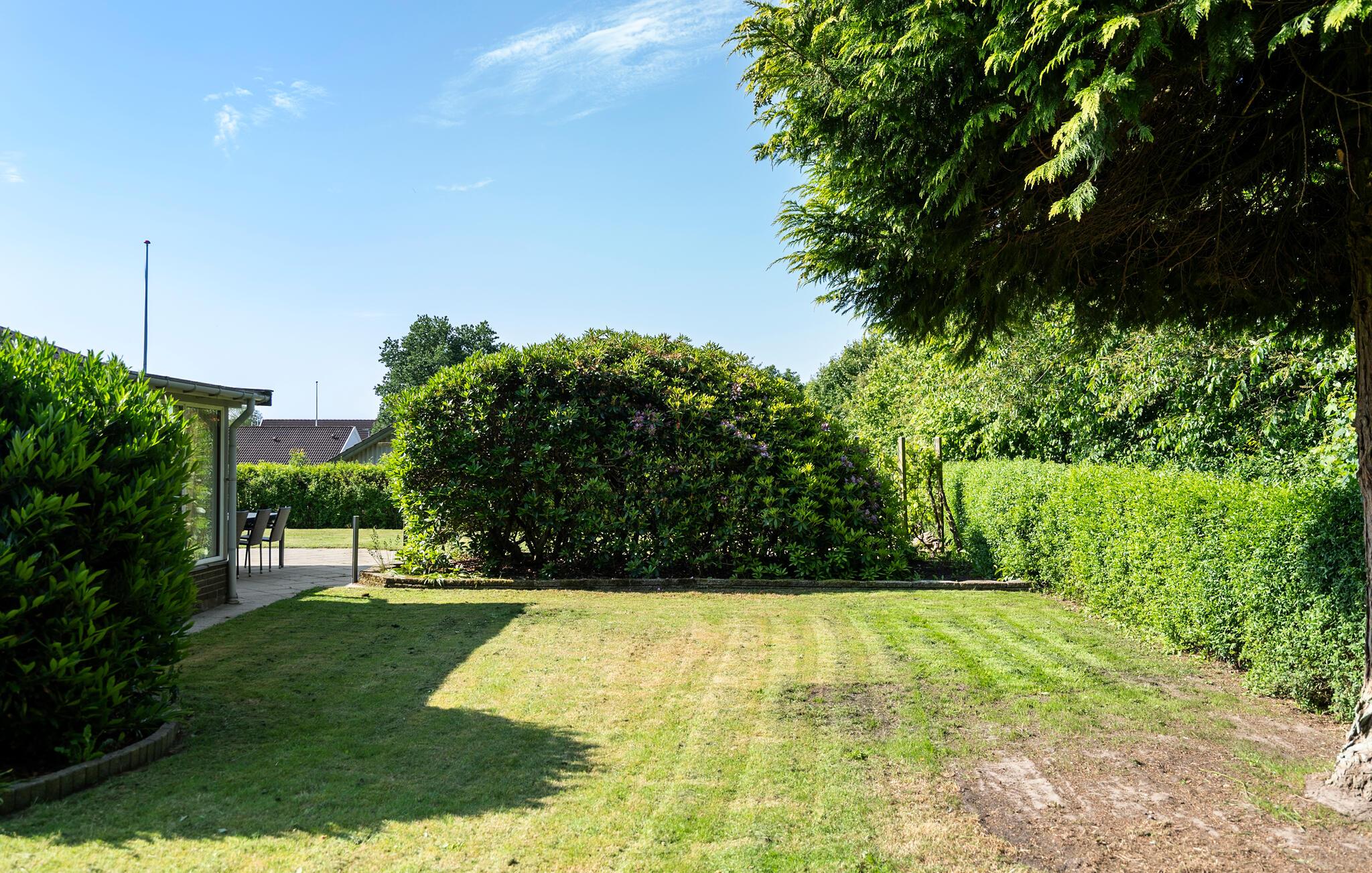 Tilbring solrige timer på terrassen med havebord og stole. Nyd måltiderne udendørs og kig ud over den velplejede græsplæne. Den store have er omgivet af hække og giver jer masser af privatliv og plads til leg og afslapning.