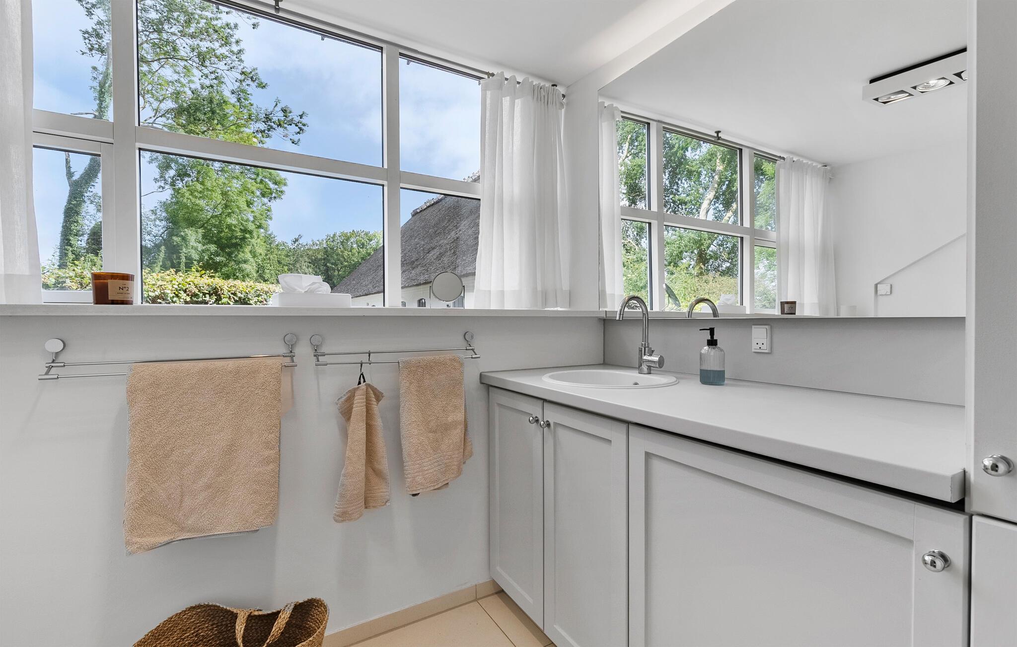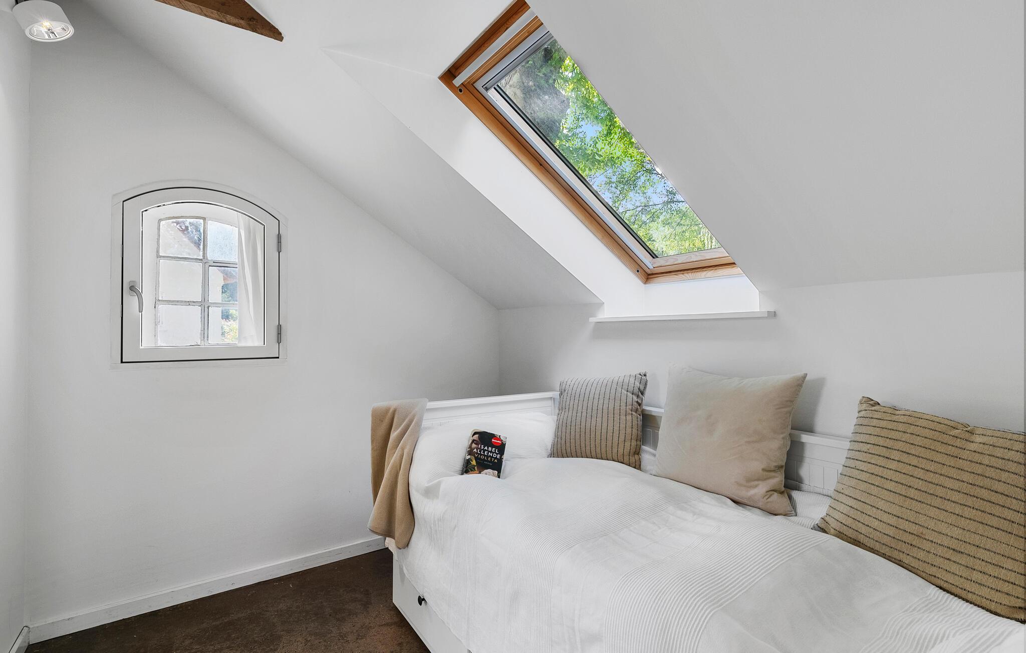Læg hverdagen bag jer, og nyd tiden i dette stilfulde feriehus, beliggende mellem gamle træer og smukt anlagte haver. Et sted at slappe af venter jer i det fredelige, grønne landskab ved Aabenraa Fjord. Læn jer tilbage i den lyse stue. Kombinationen af synlige træbjælker, lyse overflader og udsøgte møbler skaber en varm og indbydende atmosfære. Åbn terrassedørene, luk naturen ind, og tilbring rolige timer på sofaen. Tilbered måltider sammen i det charmerende køkken, og saml jer omkring spisebordet til lange, hyggelige aftener. På køligere dage sørger pejsen for hyggelig varme.