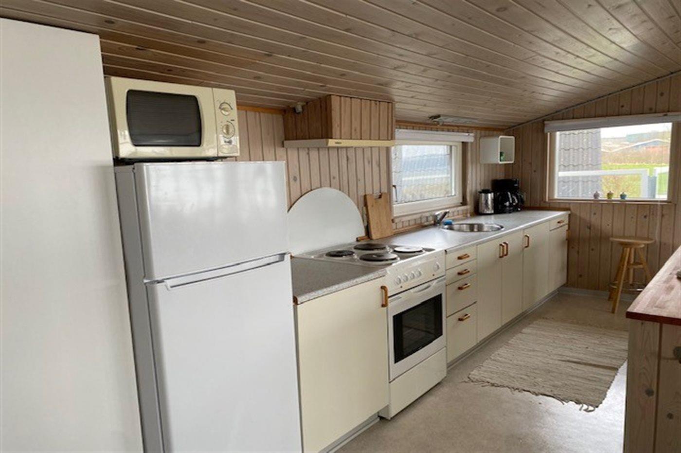 Køkkenet er udstyret med 1 køleskab. Der er 4 elkogeplader, bageovn.
