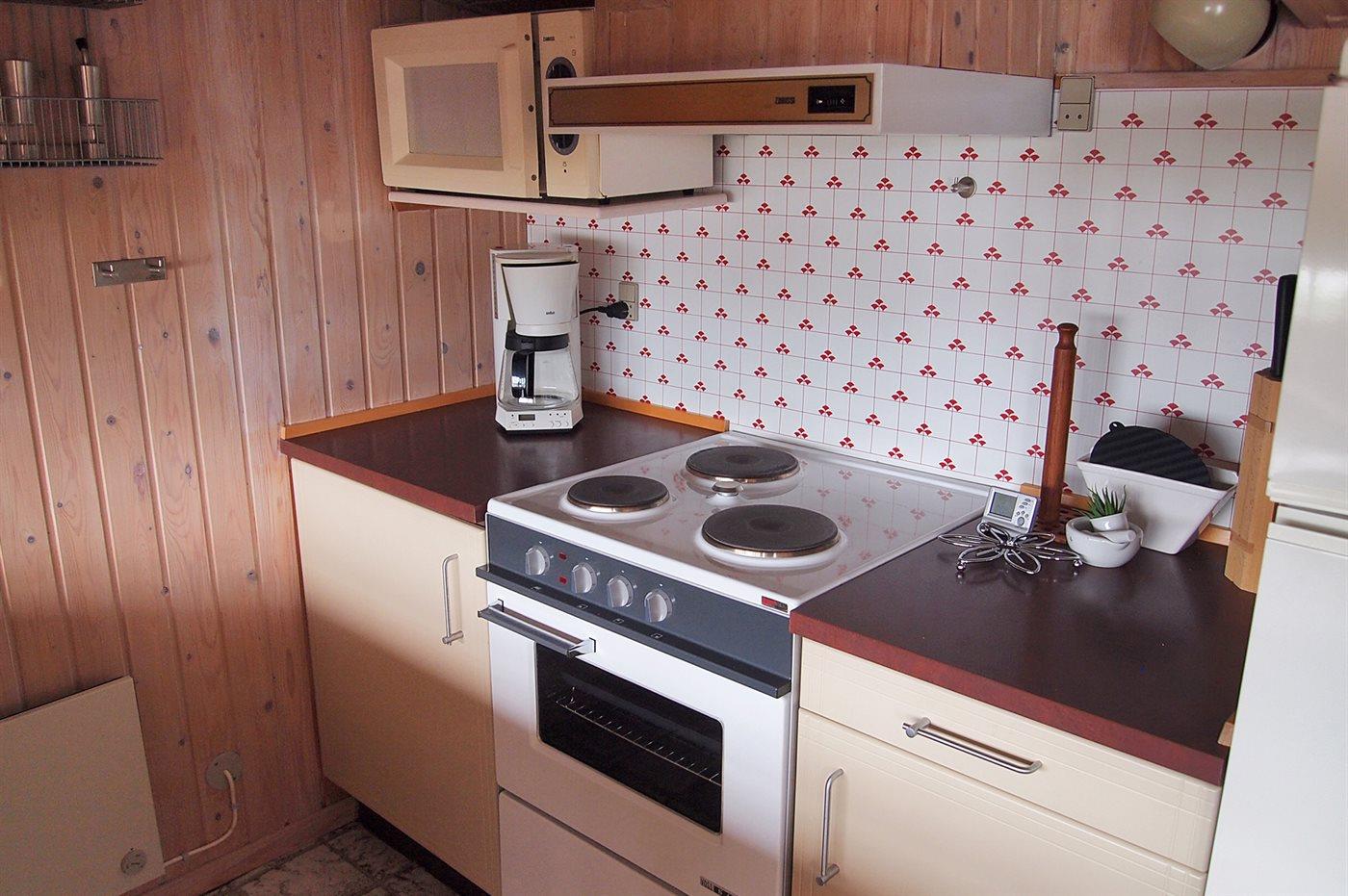 Køkkenet er udstyret med 1 køleskab. Der er 3 elkogeplader, bageovn.