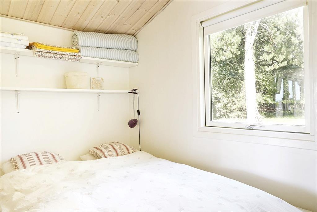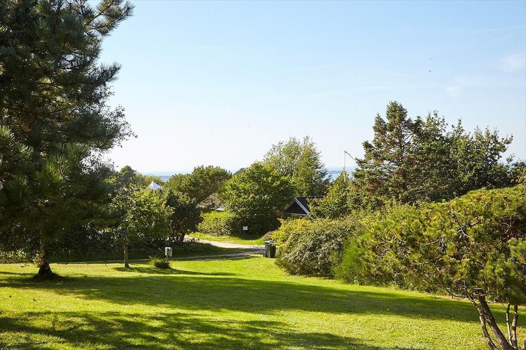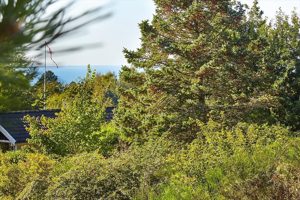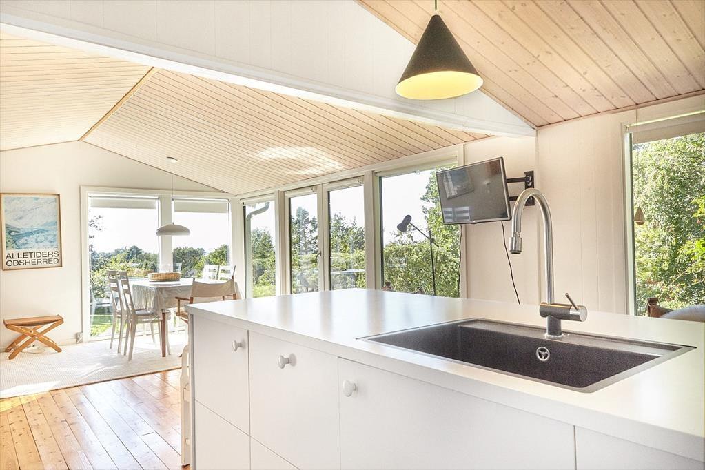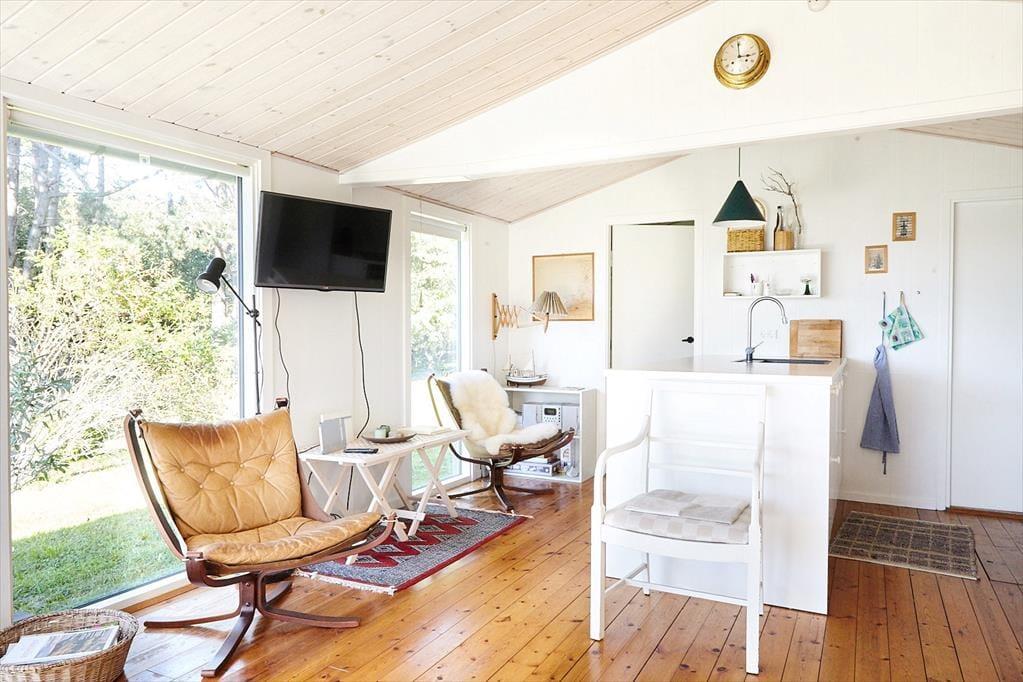Fra køkkenet midt i det hyggelige sommerhus kan du se ud ad de vestvendte vinduer og skue havet i det fjerne og spidsen af Ordrup Næs, mens du forbereder et måltid. Når I sidder ved spisebordet, har I udsigt til den store pragtfulde naturgrund og havet fra det højt beliggende sommerhusområde. Her er lyst og venligt, ro og fred, og i baghaven grænser grunden op til mere natur. Brændeovnen sørger for, at du altid kan holde varmen i huset, uanset du overnatter i soveværelset eller på sovesofaen i stuen.