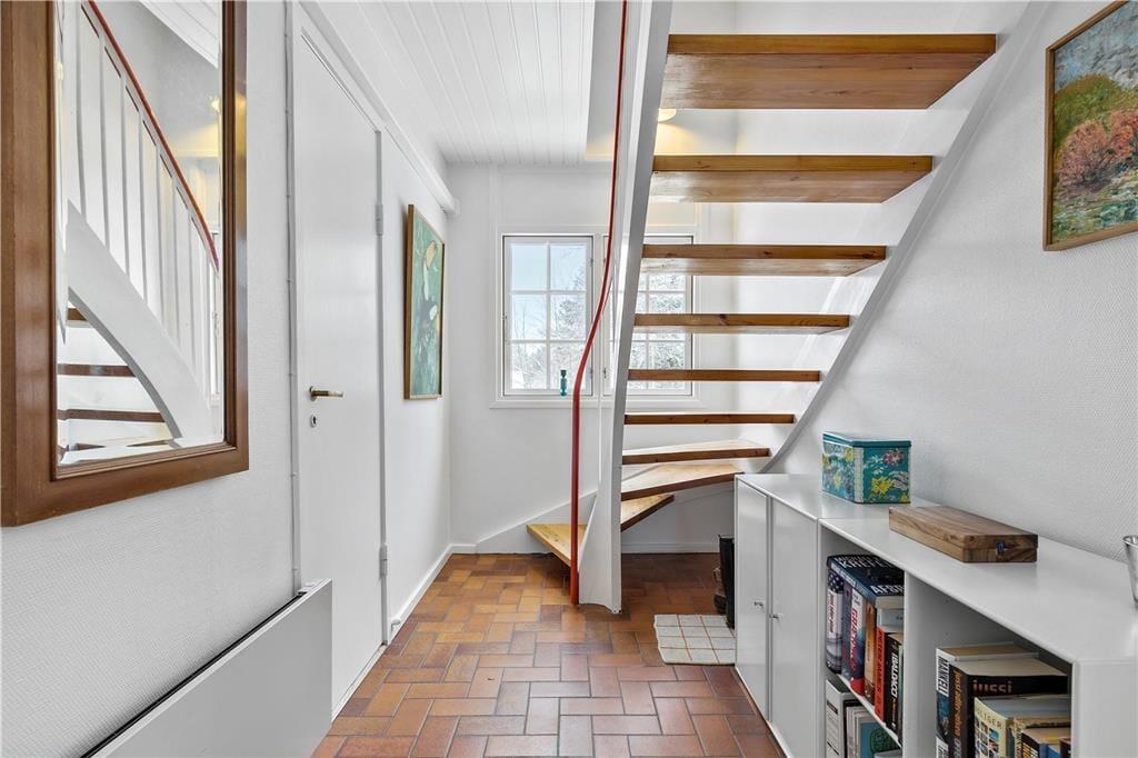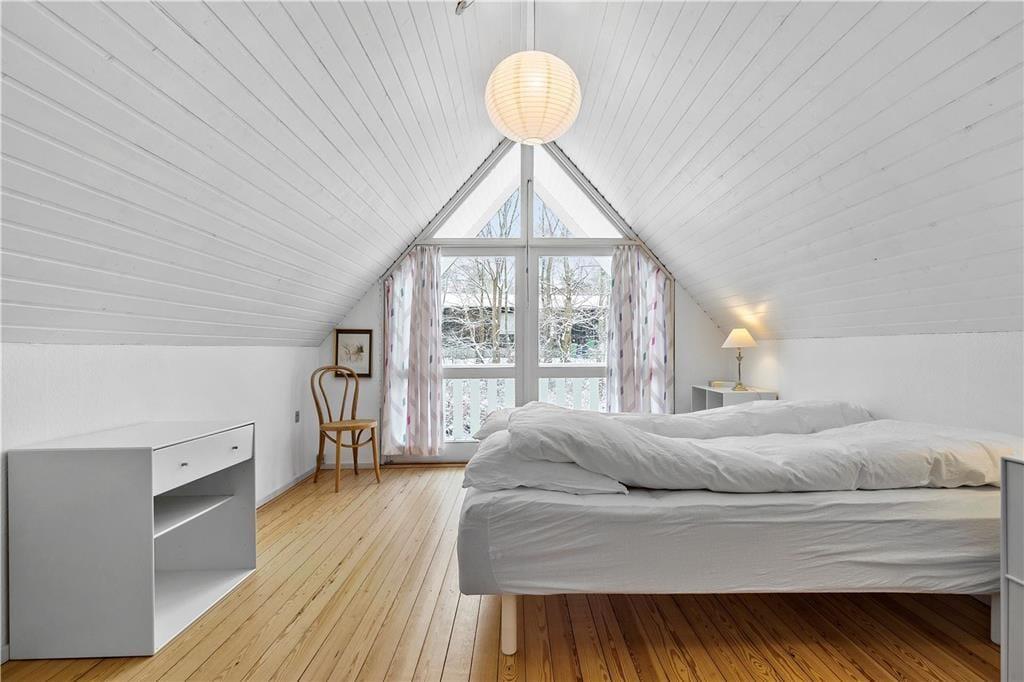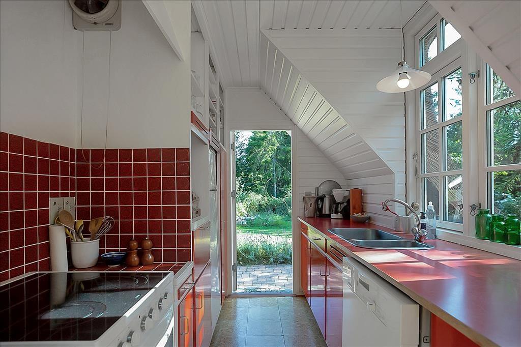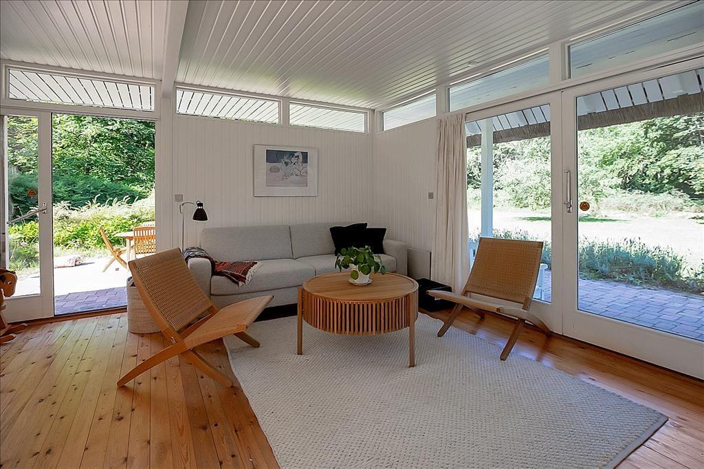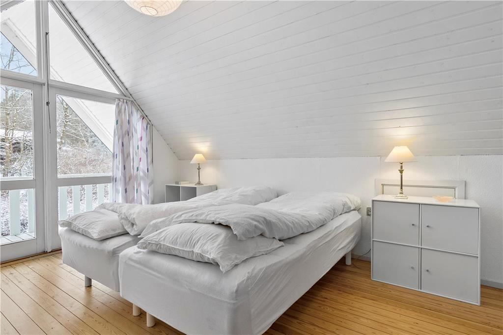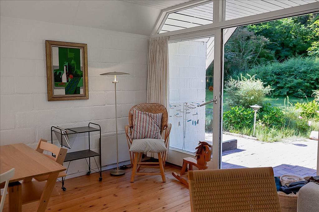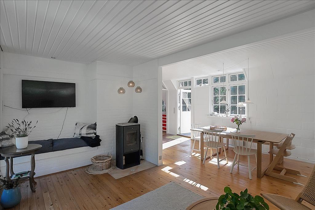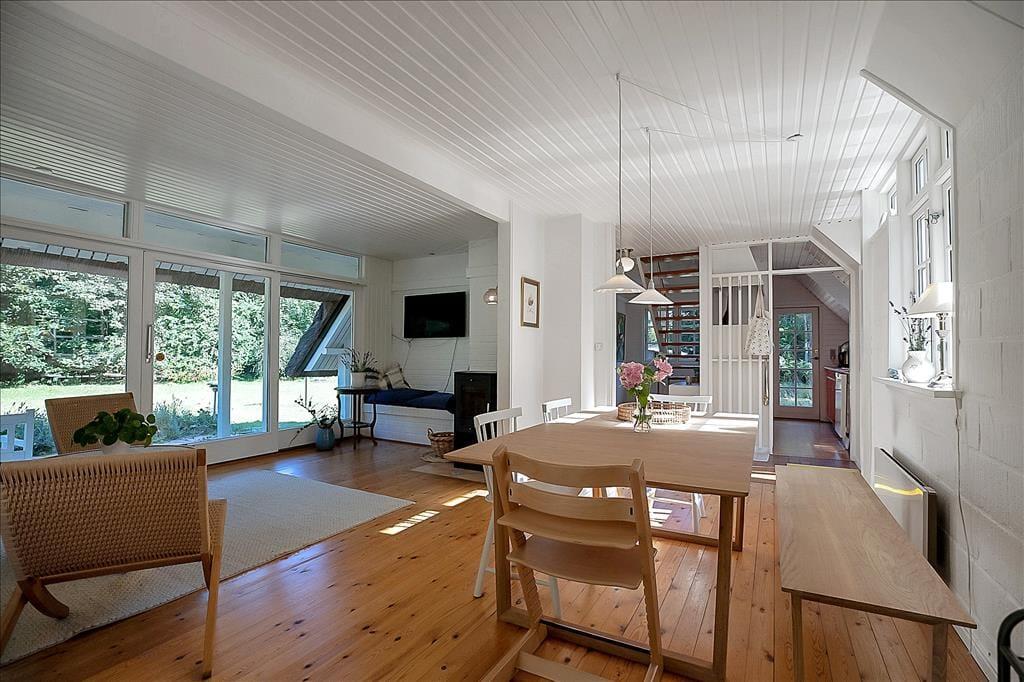 Skøn stue, med plads til både aktiviteter og hygge, her kan du slå dig ned med en god bog eller I kan spille et slag kort med børnene. Hyggeligt åbent køkken og dejligt badeværelse med brus og gulvvarme. Samt soveværelse med køjeseng. 1. sal: 2 dejlige soveværelser, det ene med enkeltsenge, det andet med dobbeltseng samt gæstetoilet. Husk også at benytte husets skønne terrasse, der er opdelt i flere afdelinger. Her er det oplagt at komme et par gode bøffer på grillen (husk at passe på stråtaget) eller bare nyde solen og udsigten til skoven.