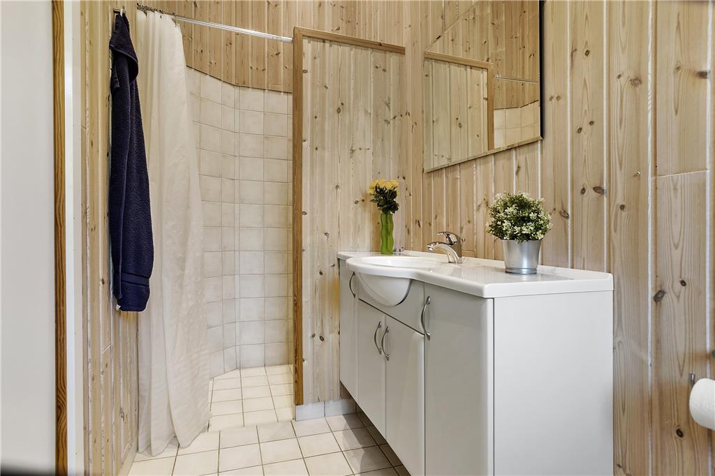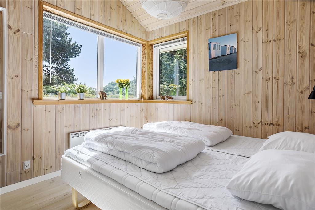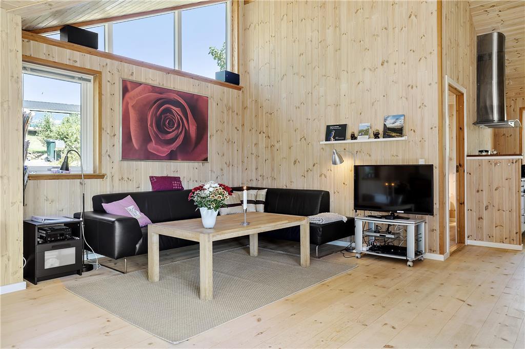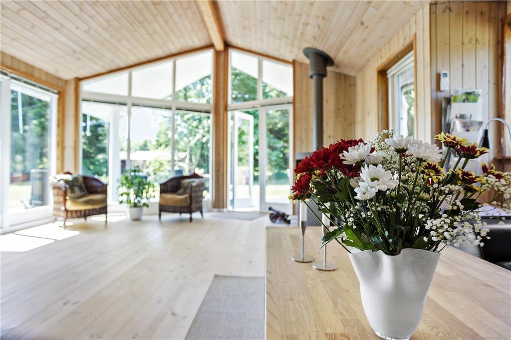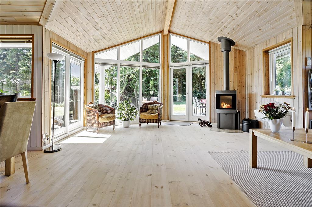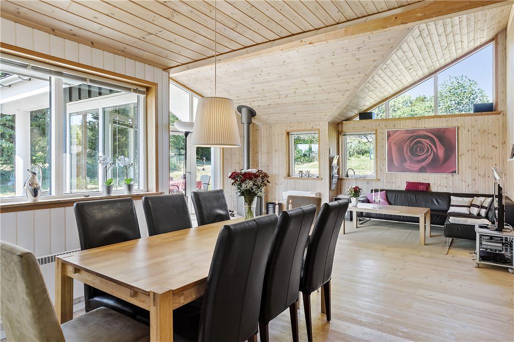 I den rummelige stue med loft til kip kan du sidde tæt på terrassen og brændeovnen og kikke ud i haven til begge sider gennem de store vinduespartier. Lyset indenfor er skønt, og gør selv overskyede og regnfulde dage til dage hvor du vil nyde at være indendørs og hygge i sommerhuset. Hvis du har samlet sten med hul i på dagens gåtur, kan du sætte alle stenene på snor mens du nyder et stykke nybagt kage på terrassen. Hvis I er to vennepar på en forlænget weekend, er her et badeværelse til hvert par.