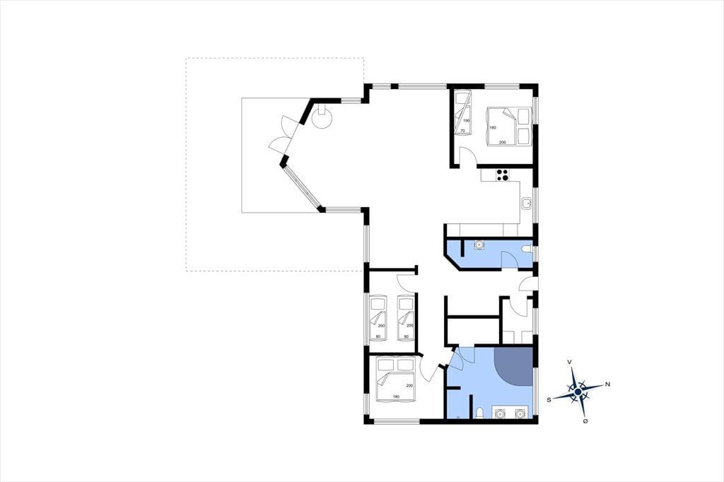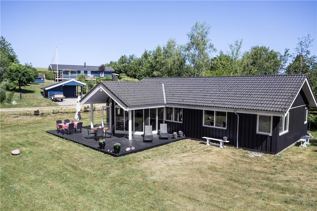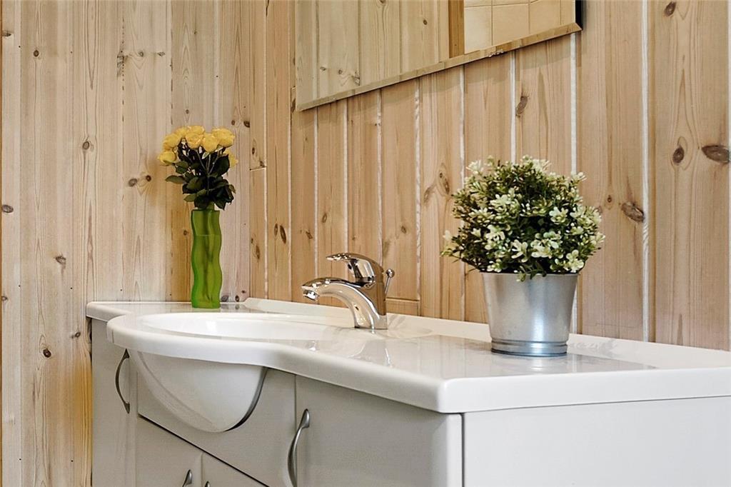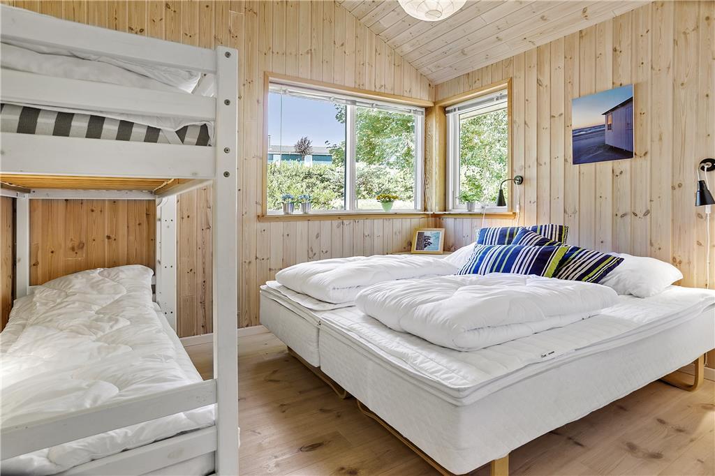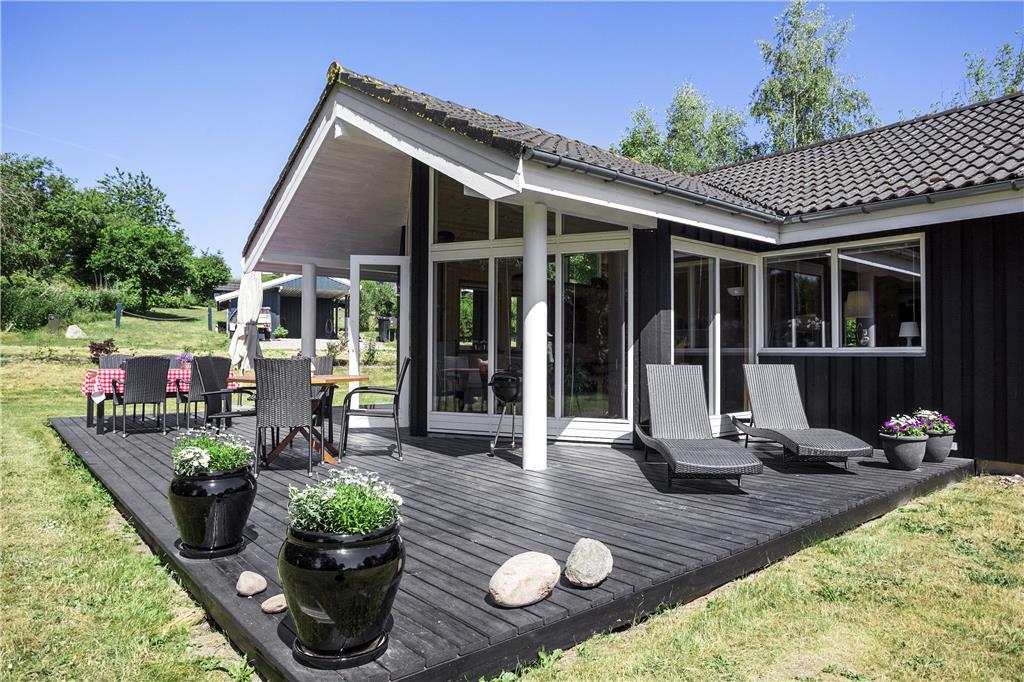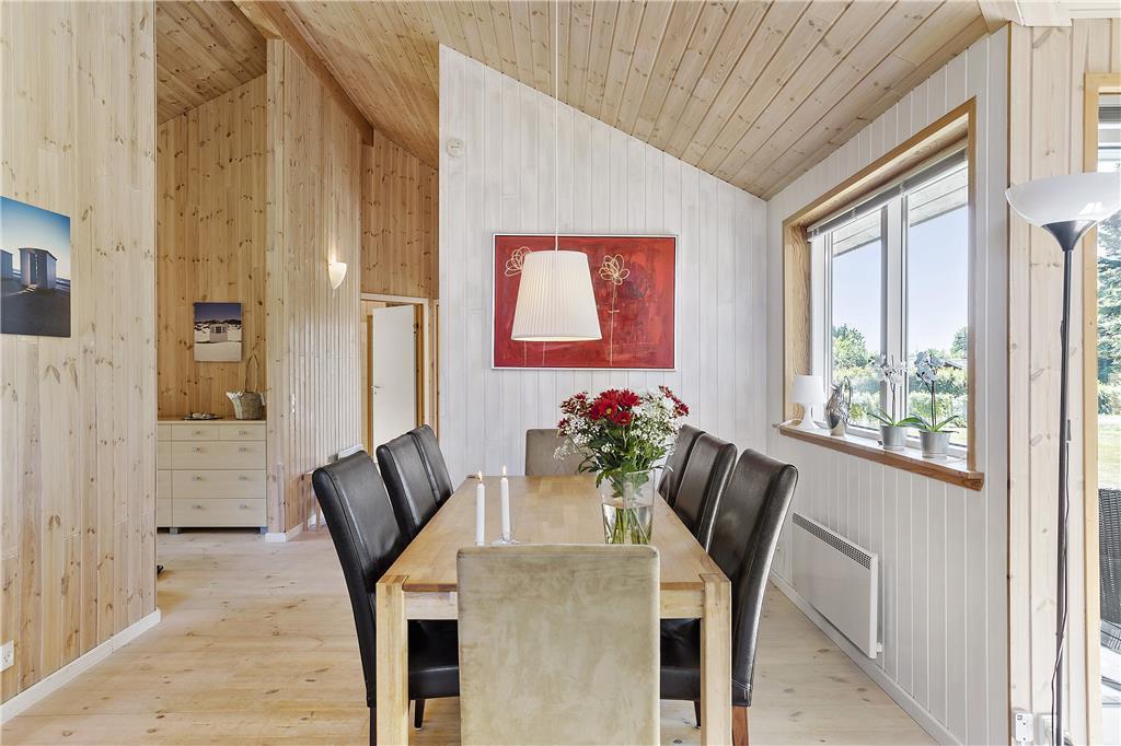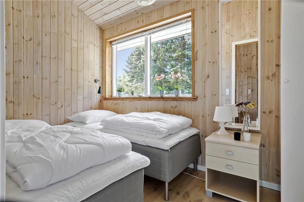 I den rummelige stue med loft til kip kan du sidde tæt på terrassen og brændeovnen og kikke ud i haven til begge sider gennem de store vinduespartier. Lyset indenfor er skønt, og gør selv overskyede og regnfulde dage til dage hvor du vil nyde at være indendørs og hygge i sommerhuset. Hvis du har samlet sten med hul i på dagens gåtur, kan du sætte alle stenene på snor mens du nyder et stykke nybagt kage på terrassen. Hvis I er to vennepar på en forlænget weekend, er her et badeværelse til hvert par.