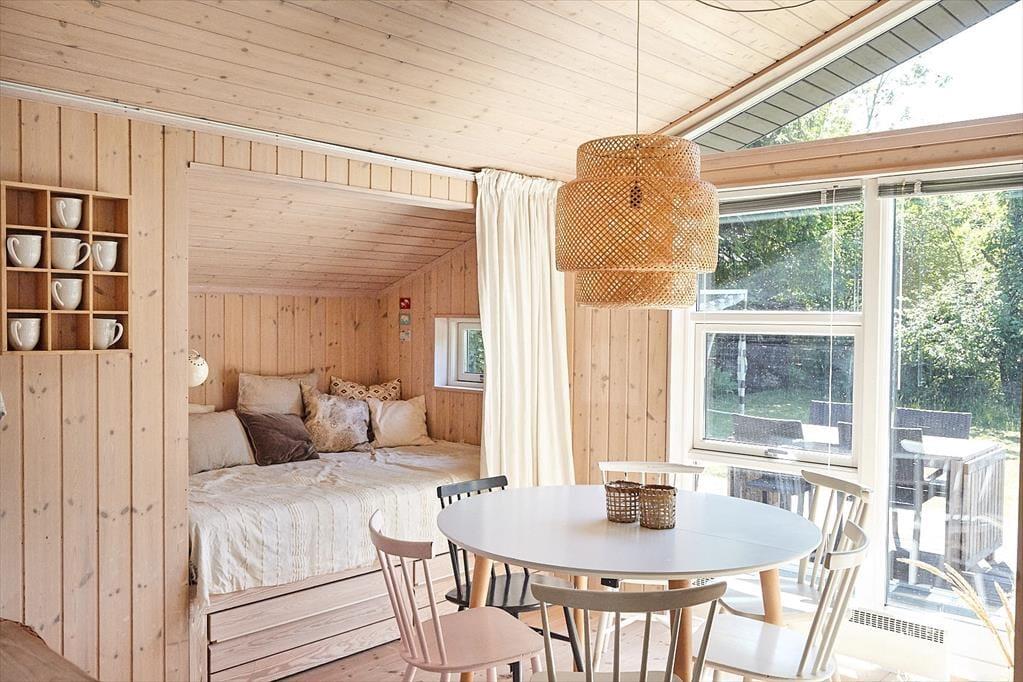 I sommerhuset, vil du med det samme få følelsen af at være velkommen. Du vil hurtigt få skuldrene ned og mærke, at det endelig er tid til ferie. I den skønne stue, der er placeret i forbindelse med det åbne køkken, kan I samles omkring spisebordet til et brætspil eller en god frokost. Hvis I tænder op i brændeovnen, efter at børnene er lagt i seng, og deler en flaske vin mens samtalen flyder, kan det kun blive en hyggelig aften.