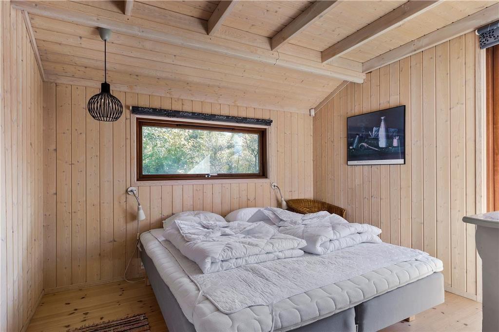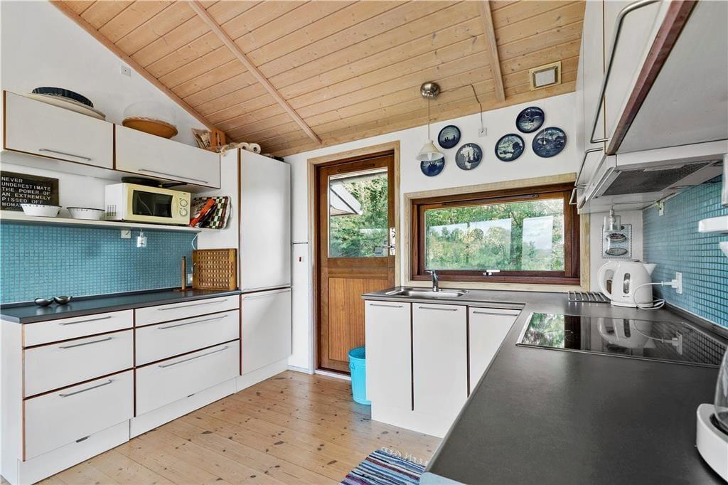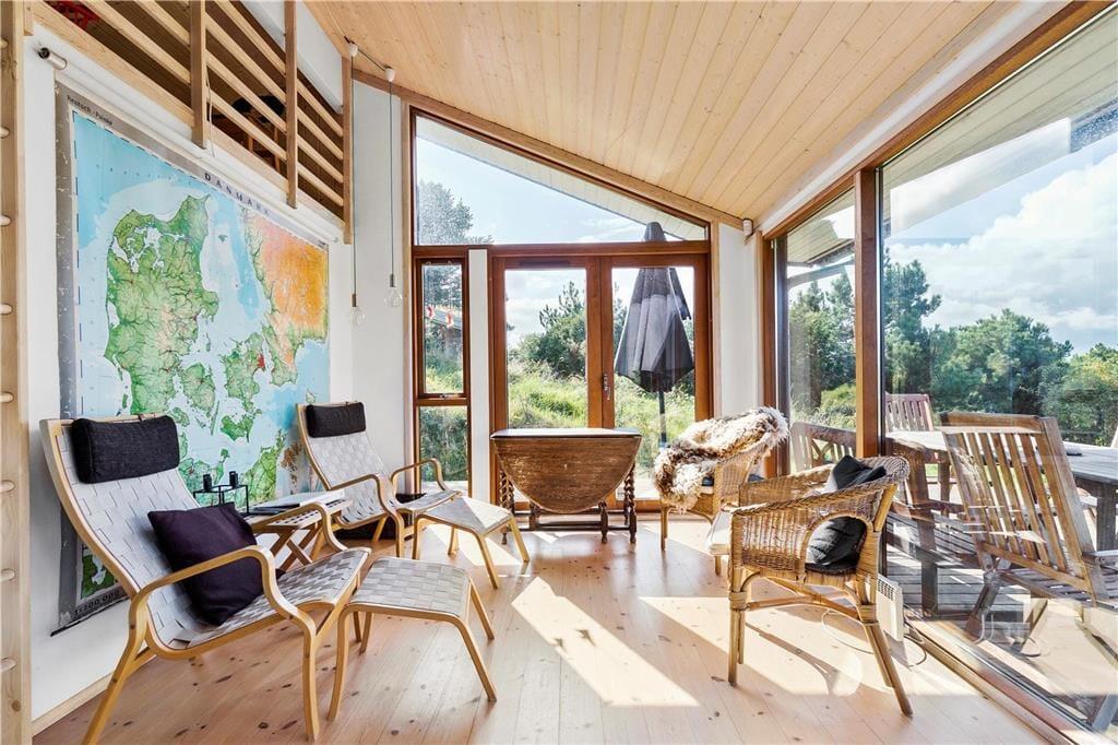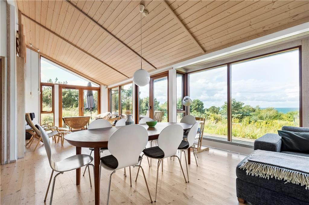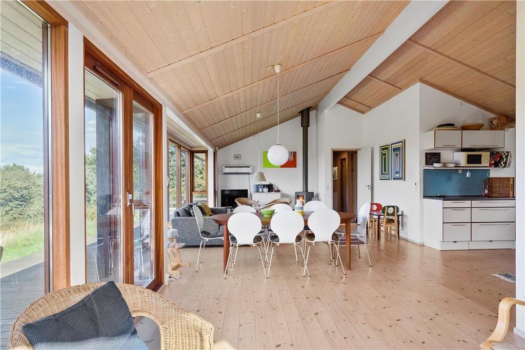 Den rummelige stue med loft til kip har panoramavinduer fra gulv til loft, og du får svært ved at få øjnene væk fra udsigten mod havet, uanset hvor du opholder dig. For selvom huset ikke befinder sig i første række til havet, er det højt beliggende med flot udkik over landskabet. I det åbne køkken midt i stuen kan du tilberede en god frokost, måske med fisk som du selv har fanget? I den ene ende af stuen kan du hygge dig i sofaen ved brændeovnen med en kop kaffe og et spil.