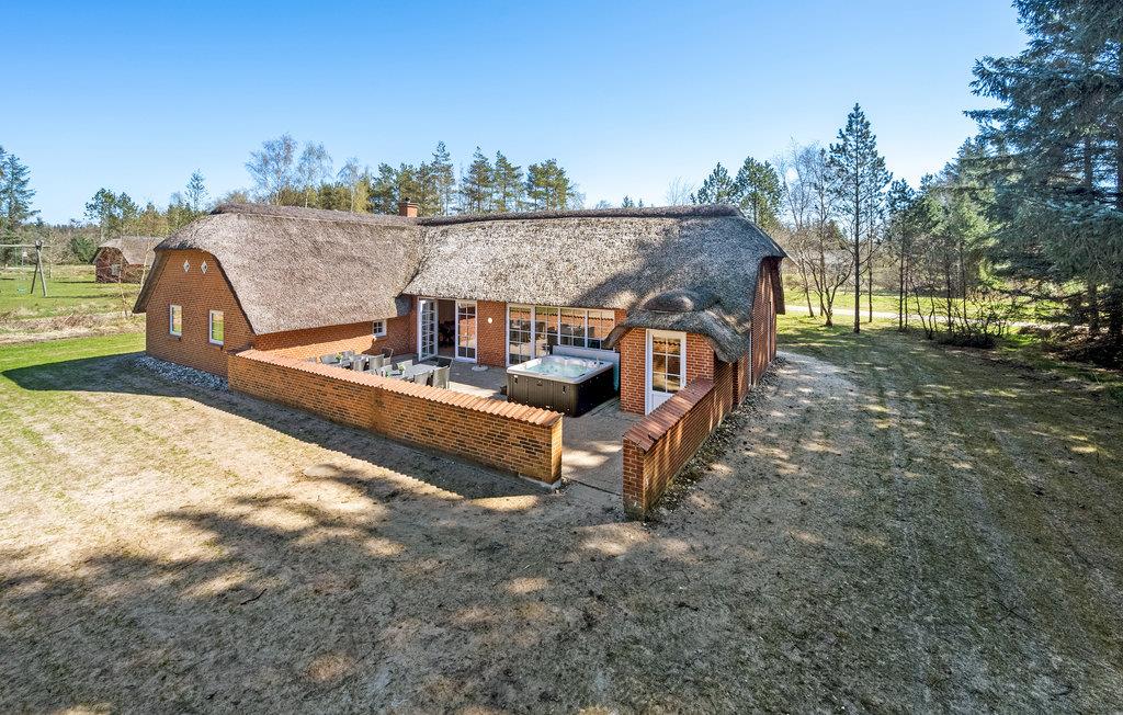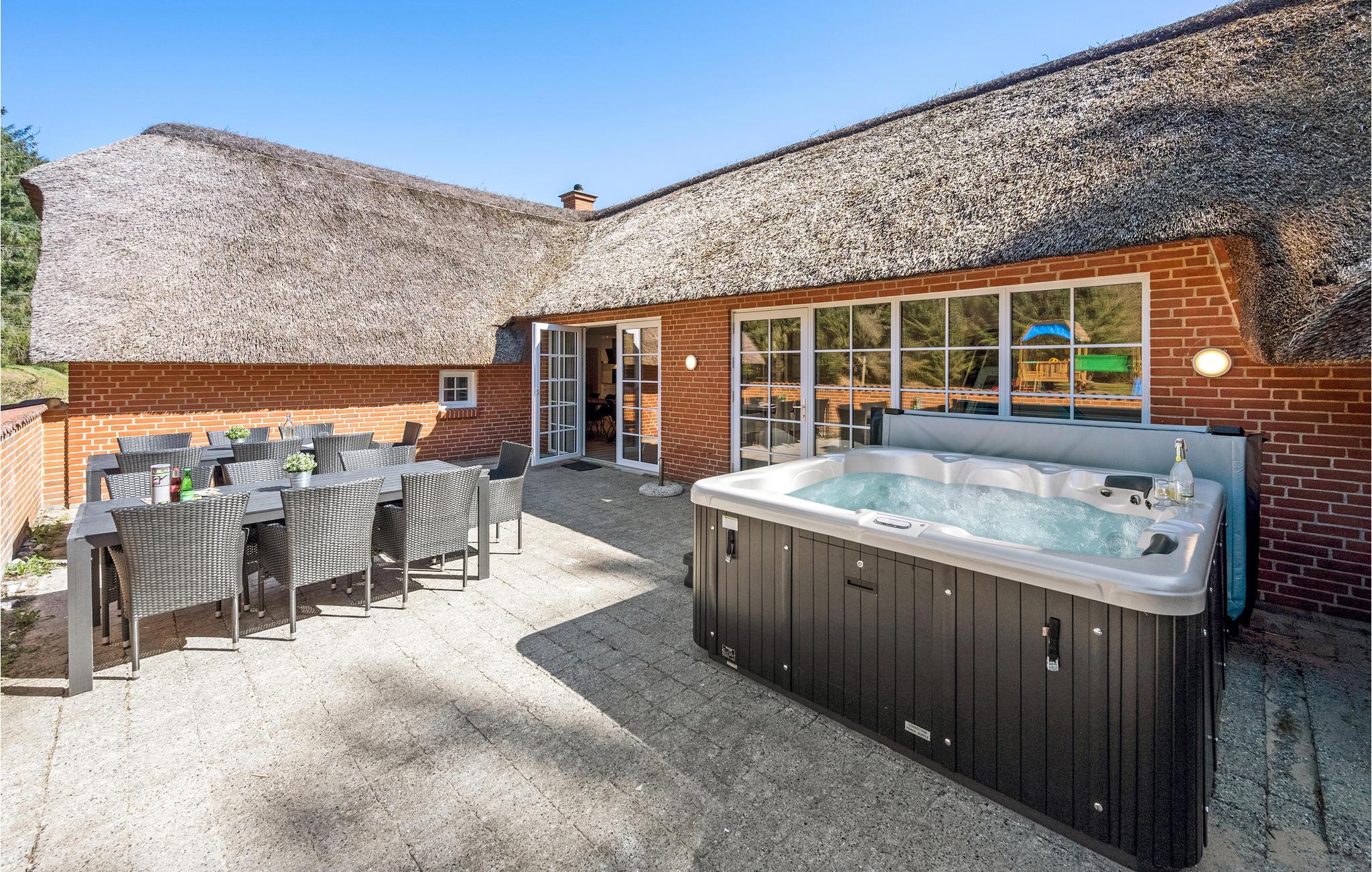 Stort stråtækt sommerhus med pool, sauna og udendørs spa.