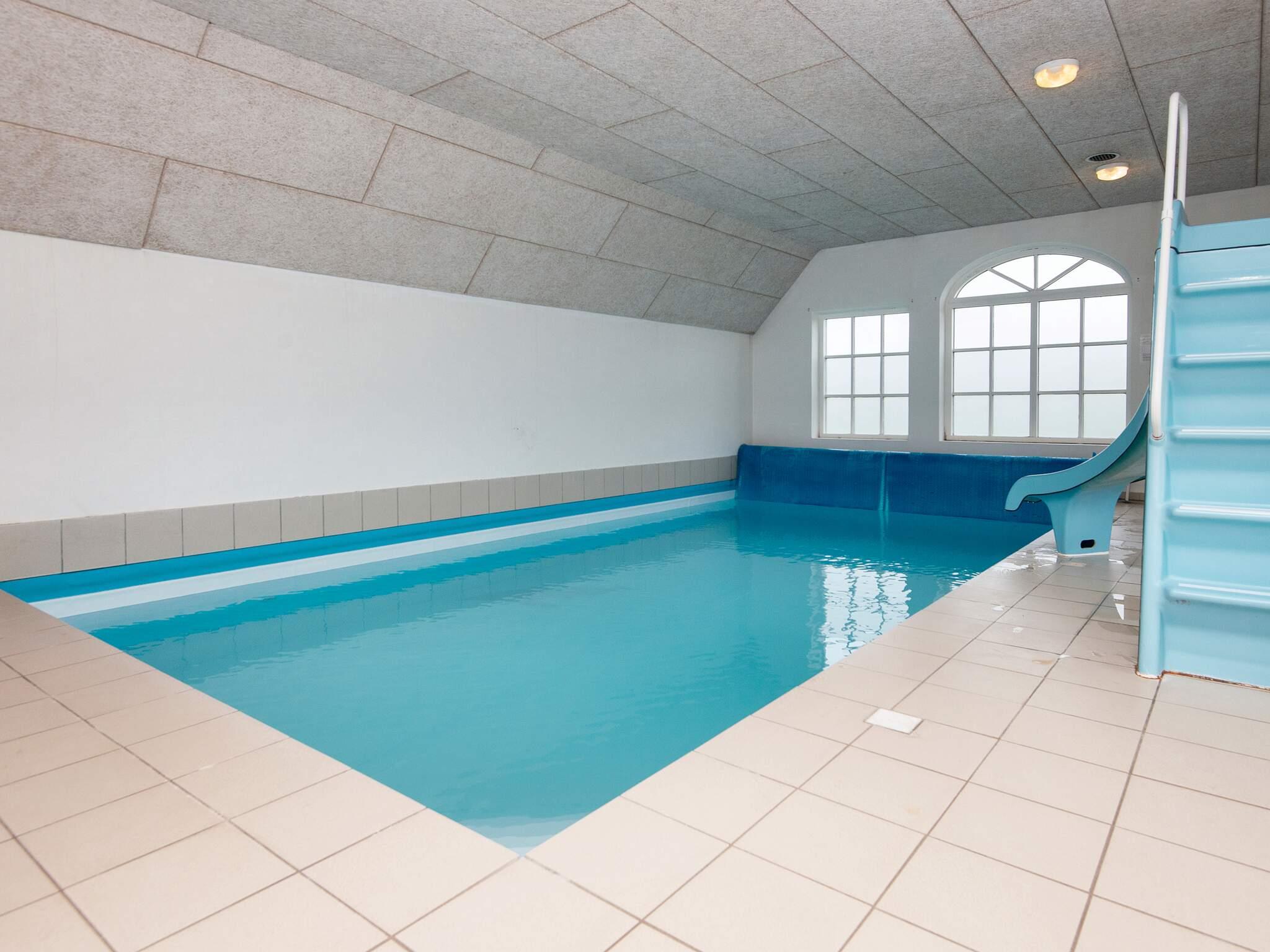 Poolhuset på 250 m², som er bygget i 2009 ligger på 3. 500 m² naturgrund, hvor der er gynger og sandkasse til børnene. Huset ligger i et udstykket område med gangstier ca. 2 km fra Vesterhavet, der altid er et besøg værd. I det herlige poolrum kan hele familien hygge sig i den store pool, på vandrutschebanen eller i det nedsænkede spabad På den lukkede terrasse er der stor mulighed for at nyde solen i havemøblerne og aftensmaden fra grillen. I poolhuset er der 3 badeværelser med toilet, håndvask, bruseniche og gulvarme. Varmepumpe samt en brændeovn sørger for opvarmning af huset. I poolhuset er der 20 sovepladser: 4 værelser med dobbeltsenge, 2 værelser med hver 4 køjepladser, 1 værelse med 2 enkeltsenge, 1 sovesofa til 2 personer i stuen. 2 husdyr er tilladt. Der er ikke TV2 kanal eller betalingskanaler i huset. RYGNING ER IKKE TILLADT.