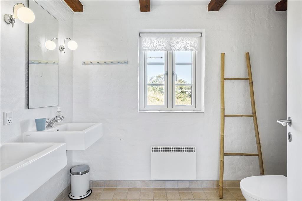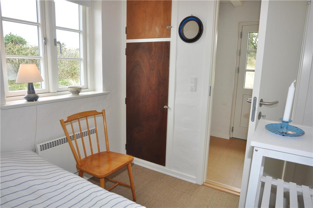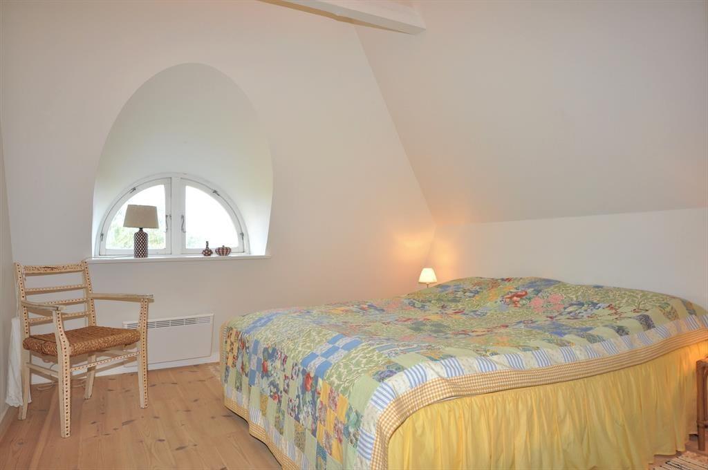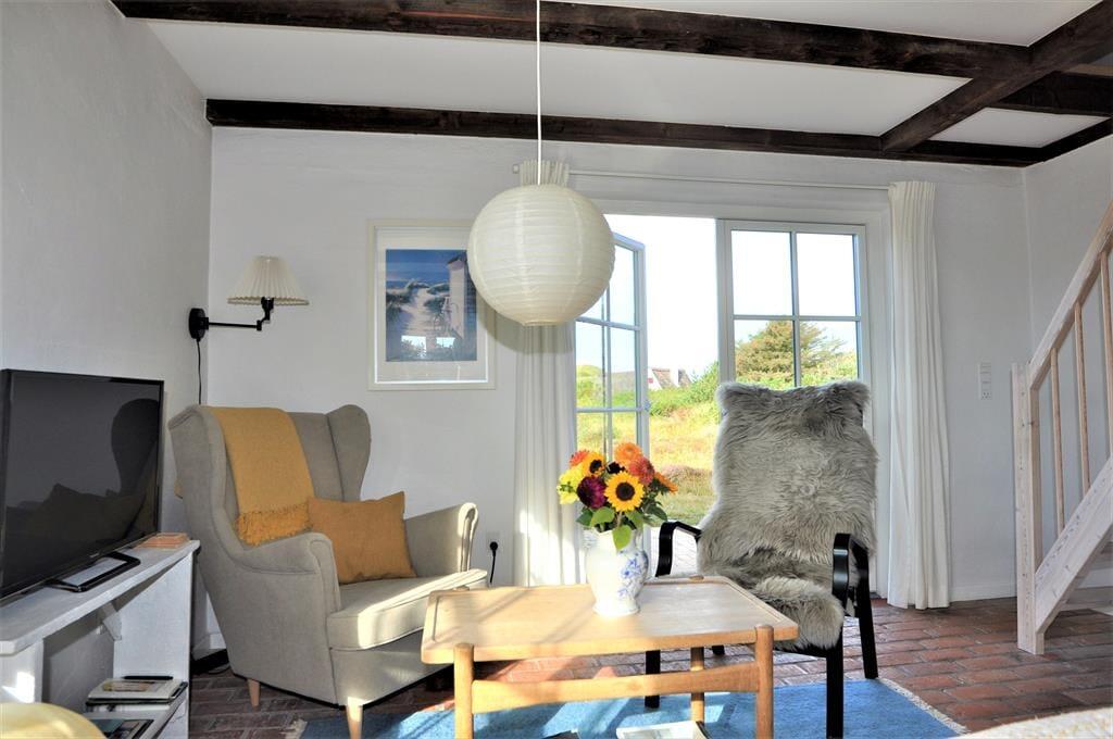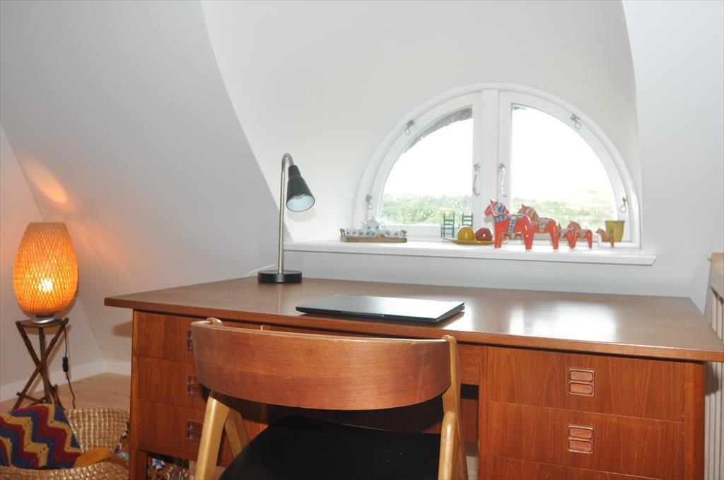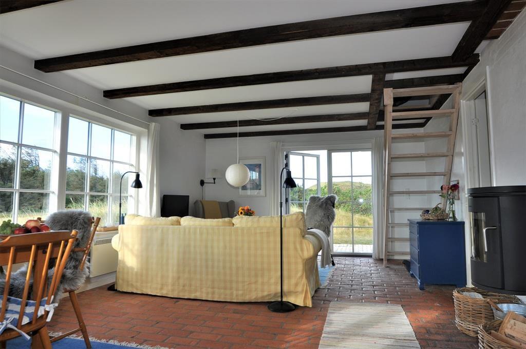 Fra stuen fører trappen jer op til første sal, hvor loftet åbner sig til kip og skaber en luftig og lys atmosfære. Her finder I et rummeligt soveværelse og en tilhørende stue – det perfekte sted at starte dagen med en stille stund og nyde morgenkaffen, mens I lader blikket glide ud over det bølgende klitlandskab.